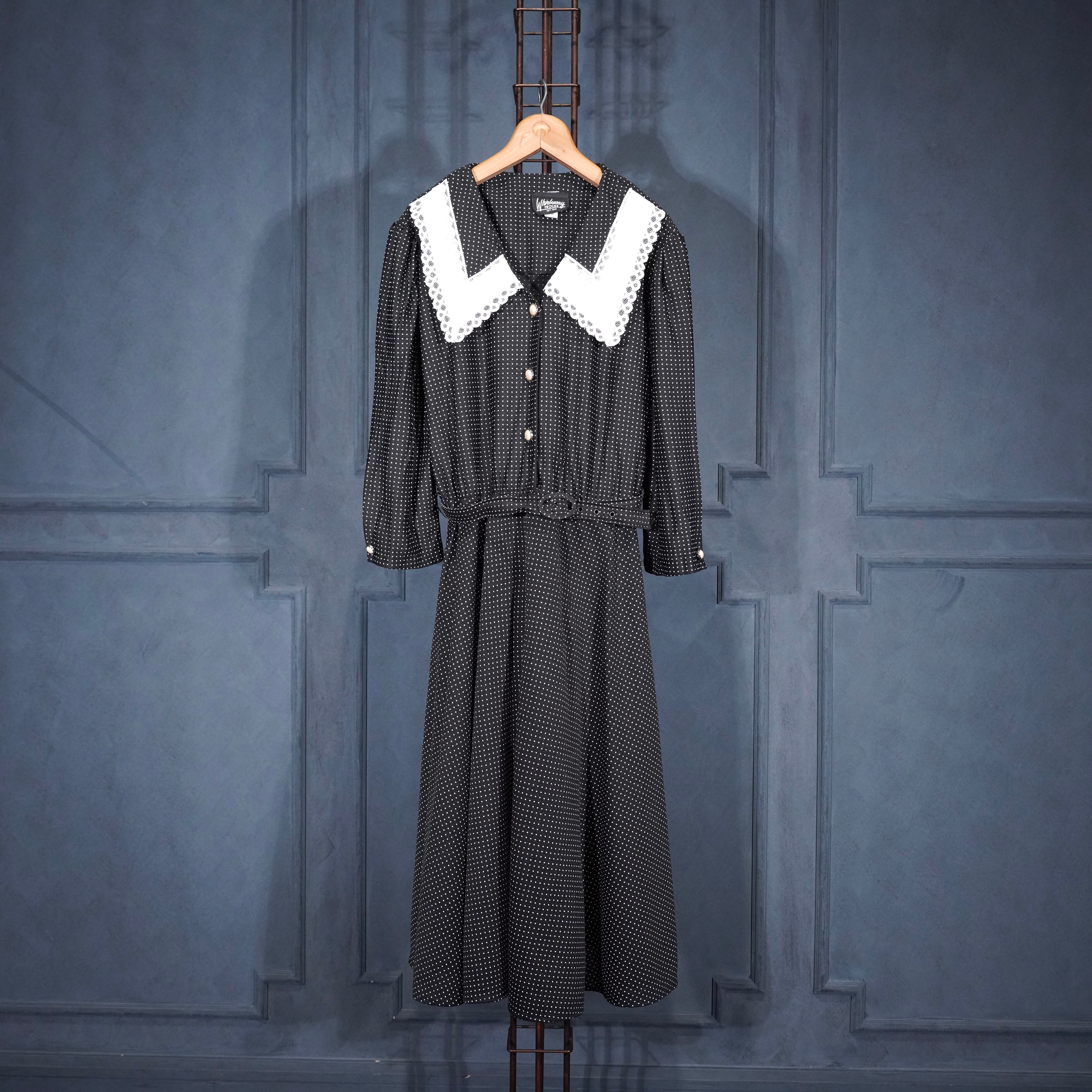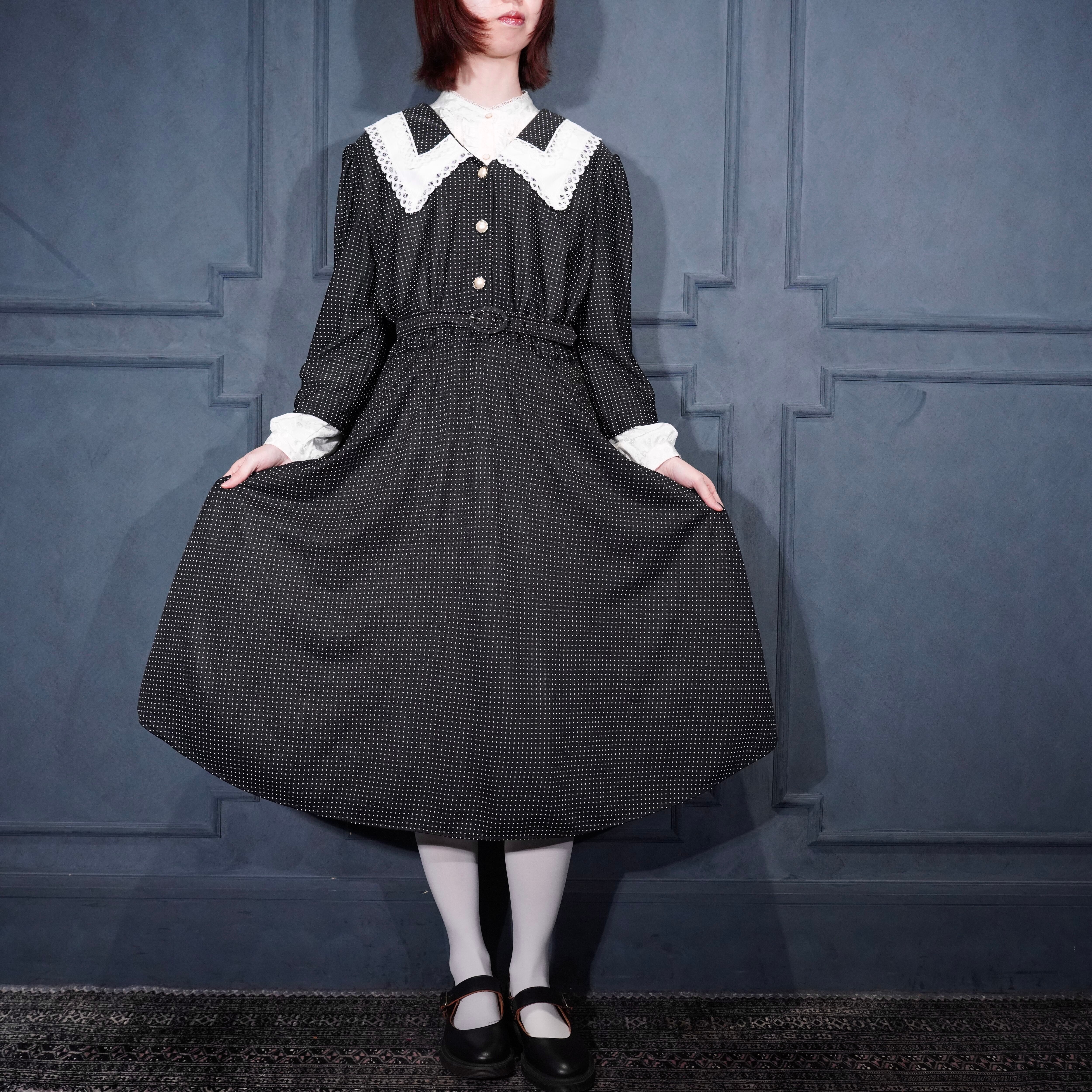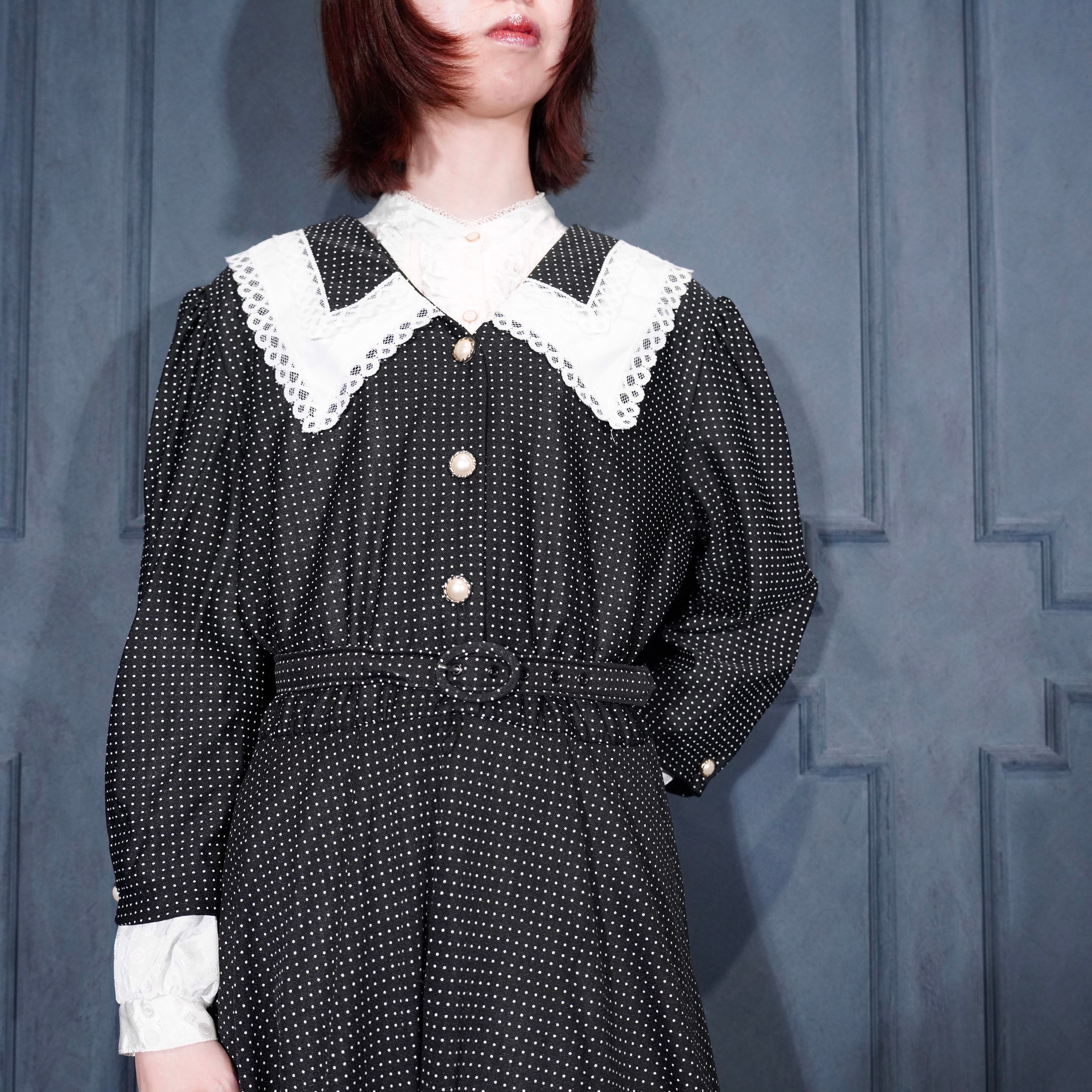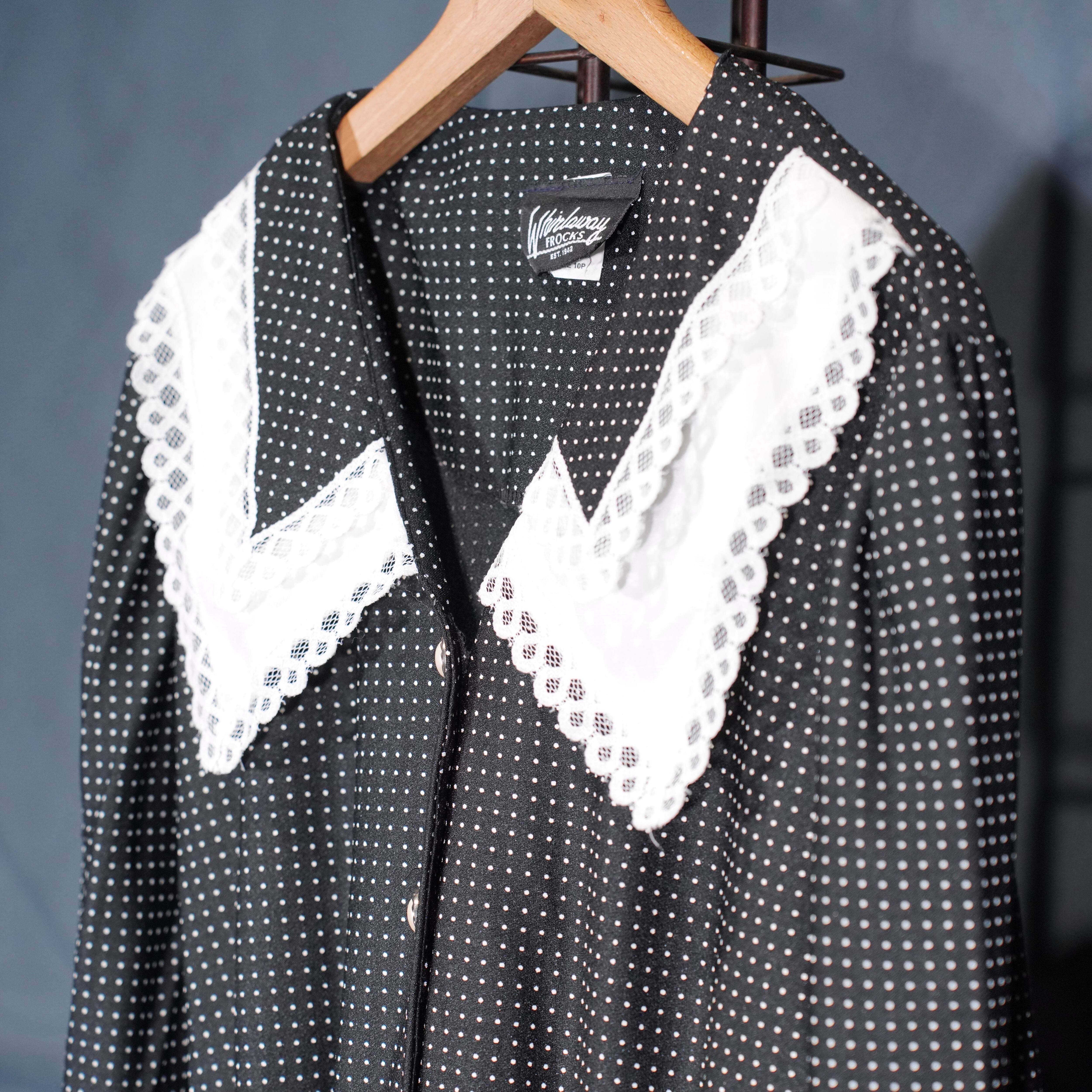 80’s USA VINTAGE Whirlaway FROCKS DOT PATTERNED BIG LACE COLLAR BELTED DESIGN ONE PIECE MADE IN USA/80年代アメリカ古着ドット柄ビッグレース襟ベルテッドデザインワンピース