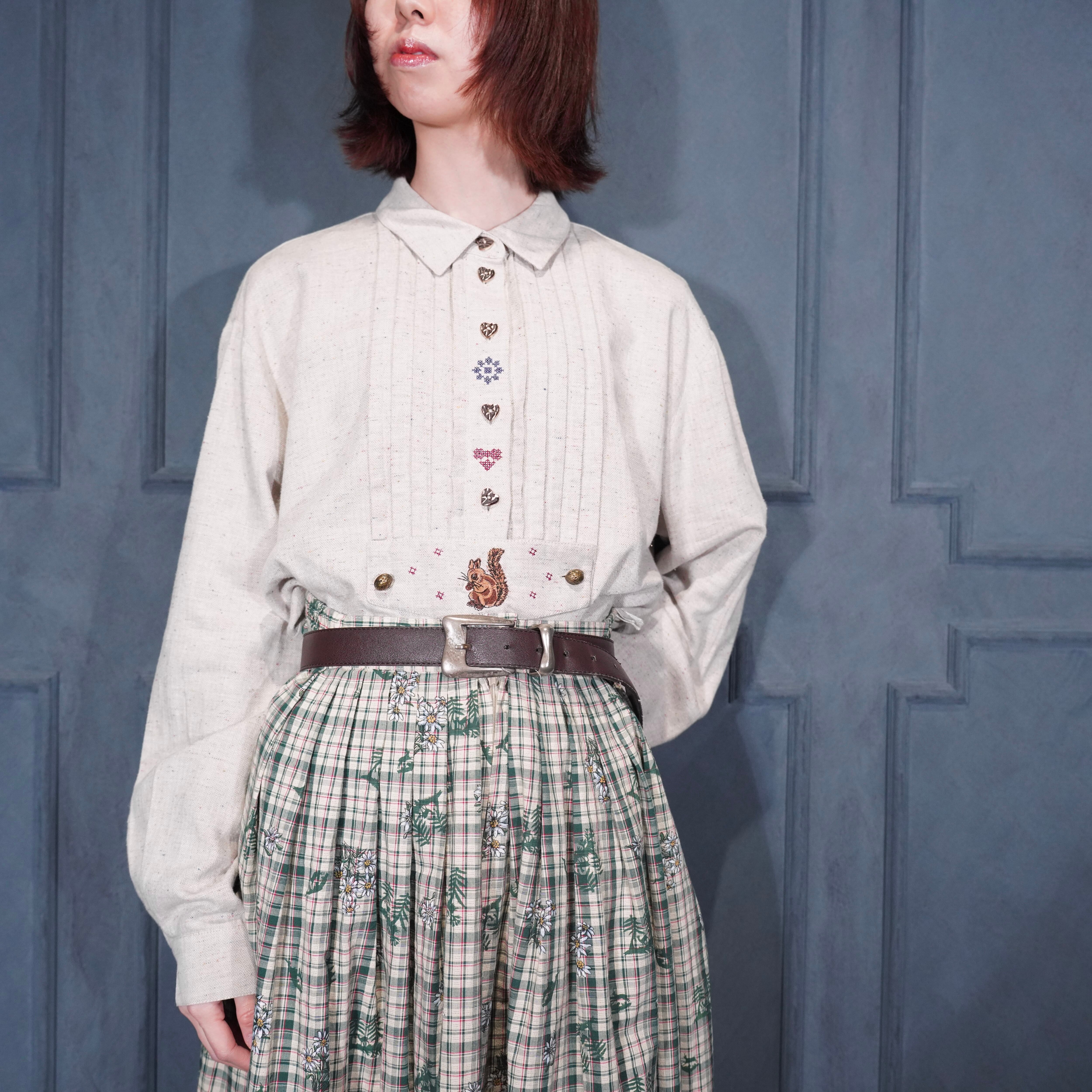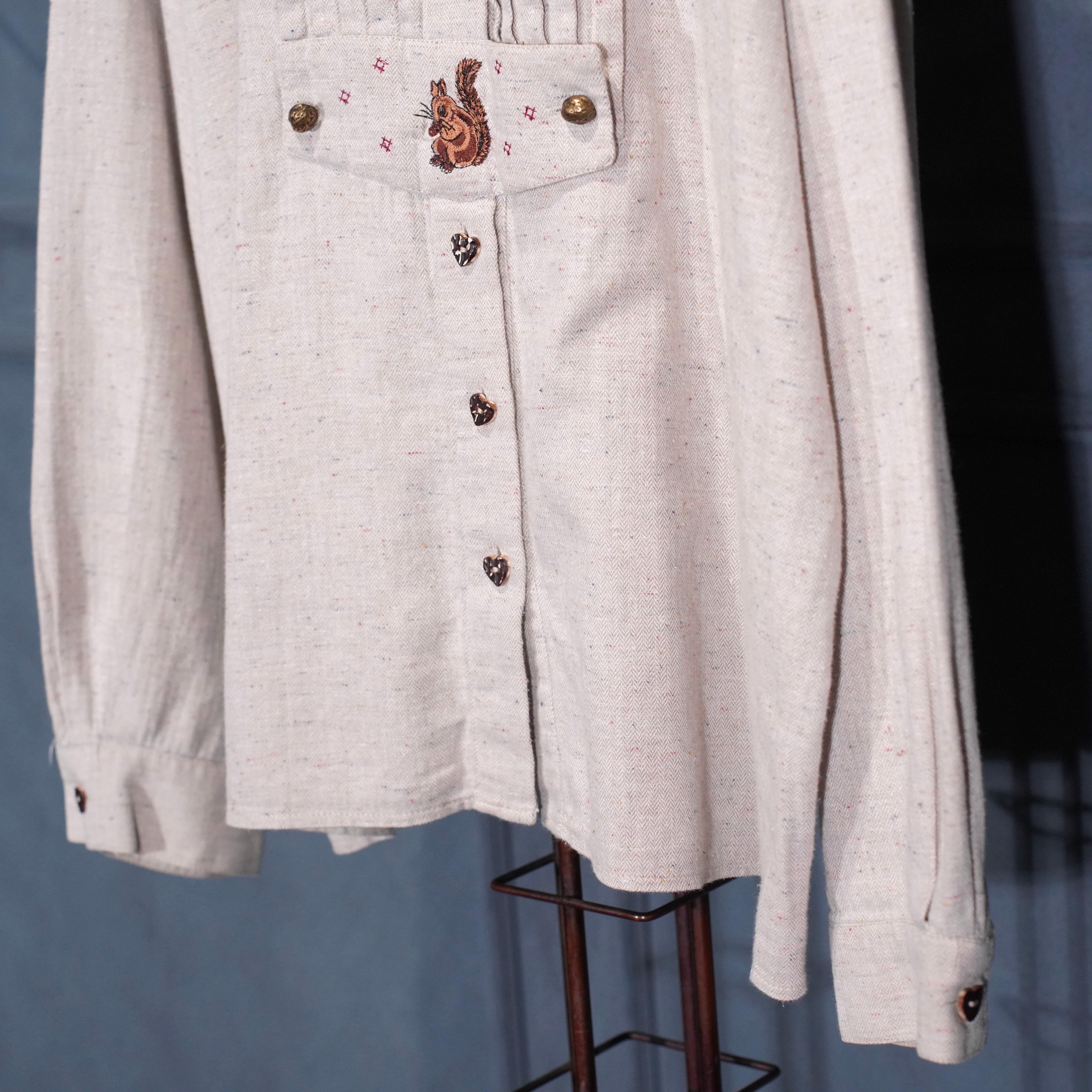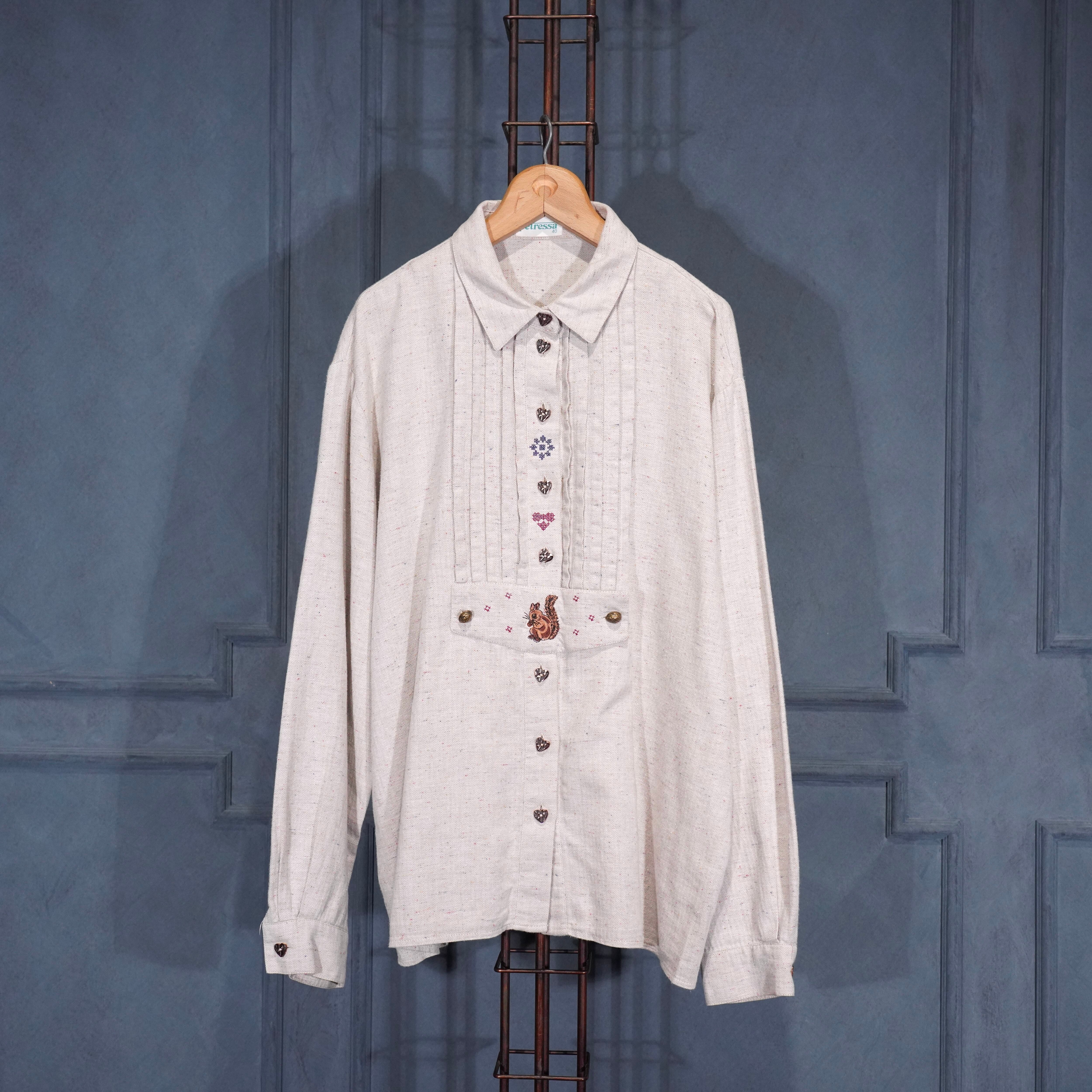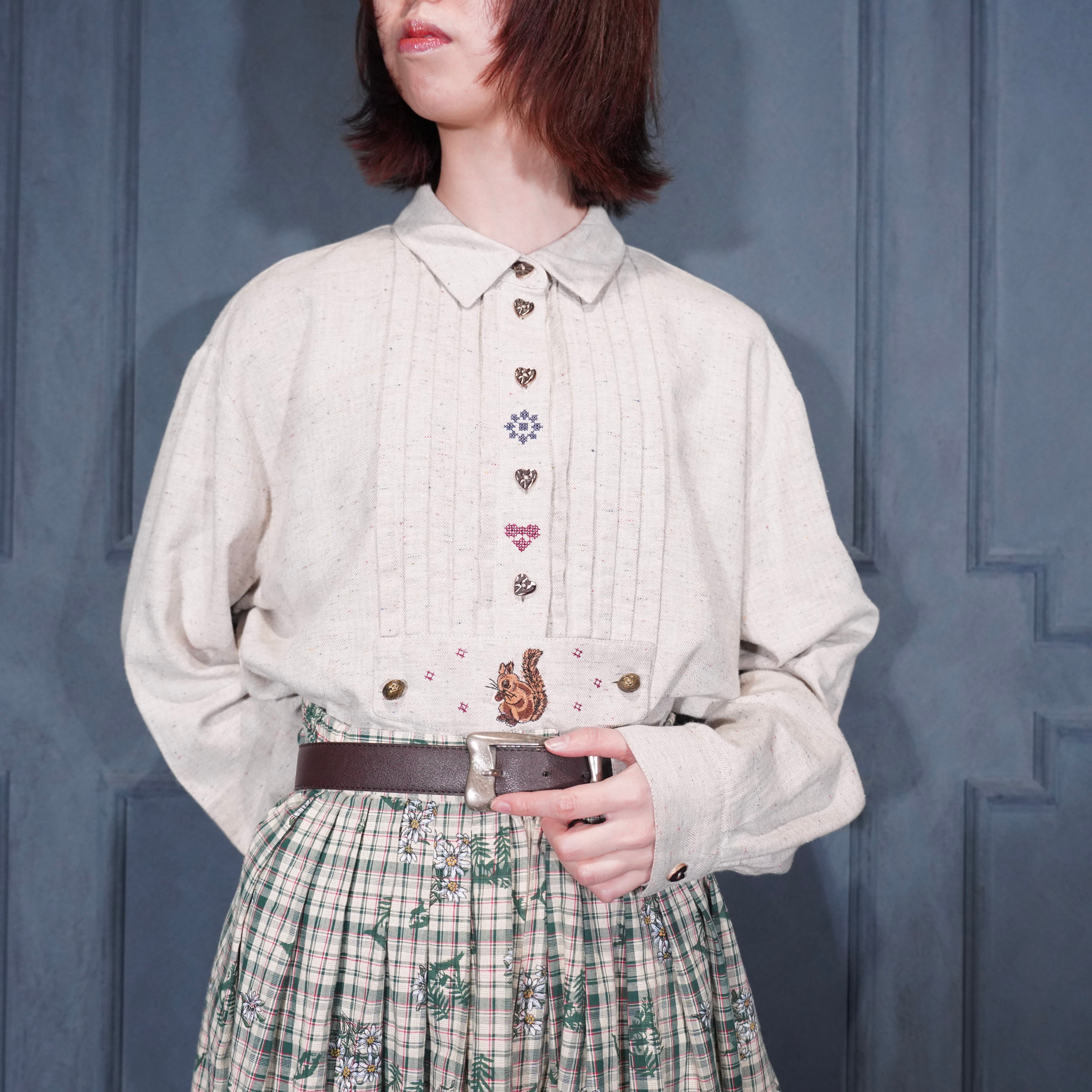 EU VINTAGE petressa SQUIRREL EMBROIDERY HEART BUTTON DESIGN TYROLEAN SHIRT/ヨーロッパ古着リス刺繍ハートボタンデザインチロリアンシャツ