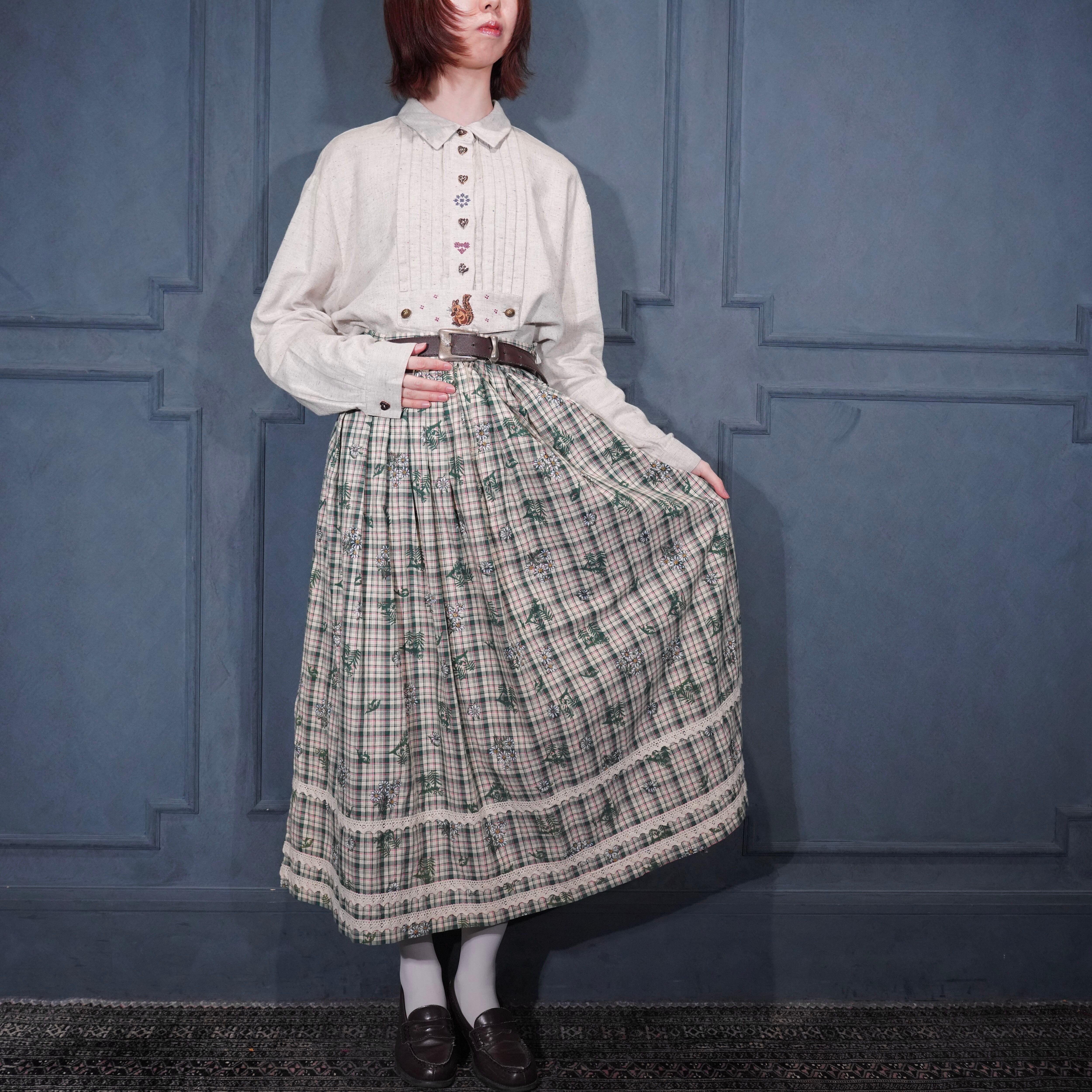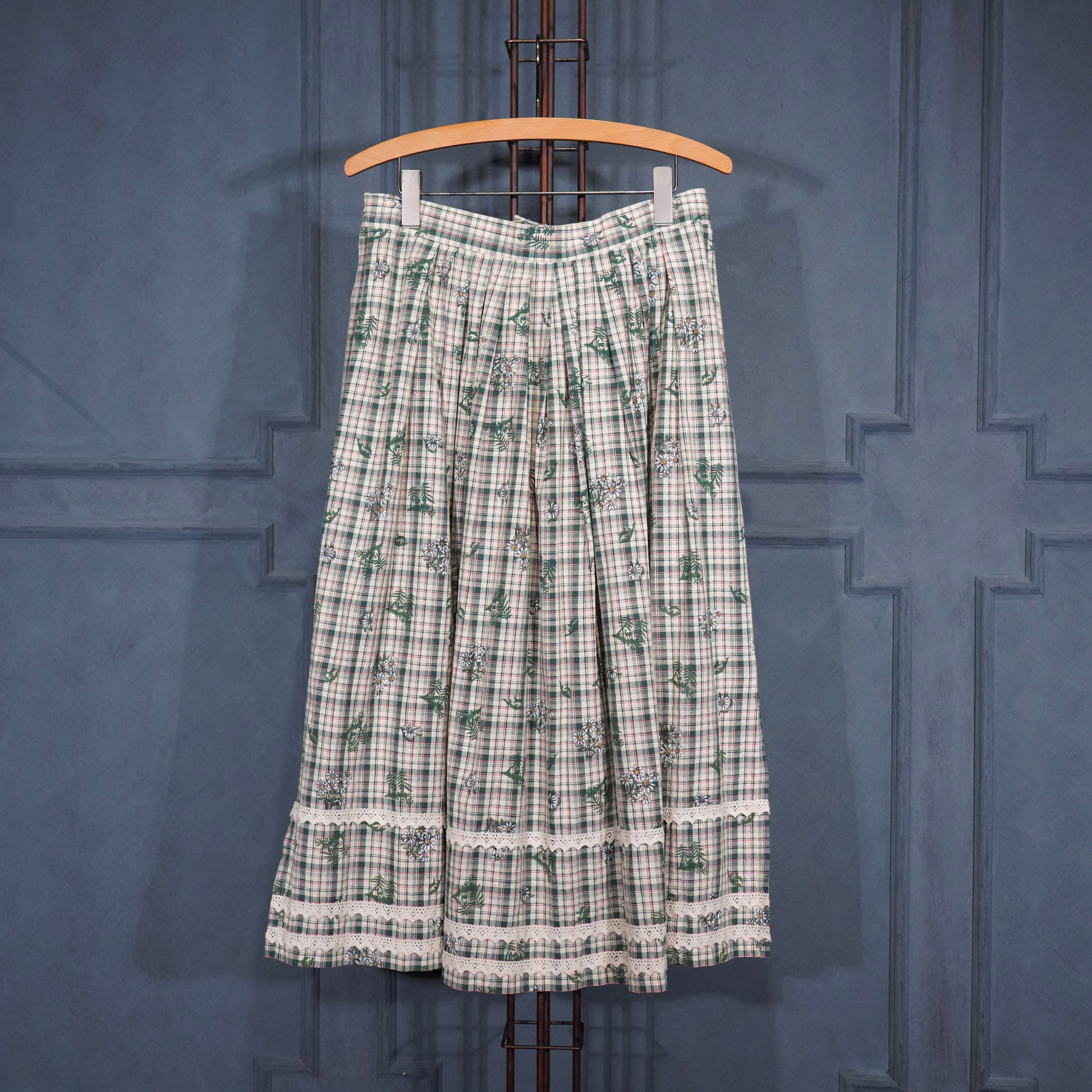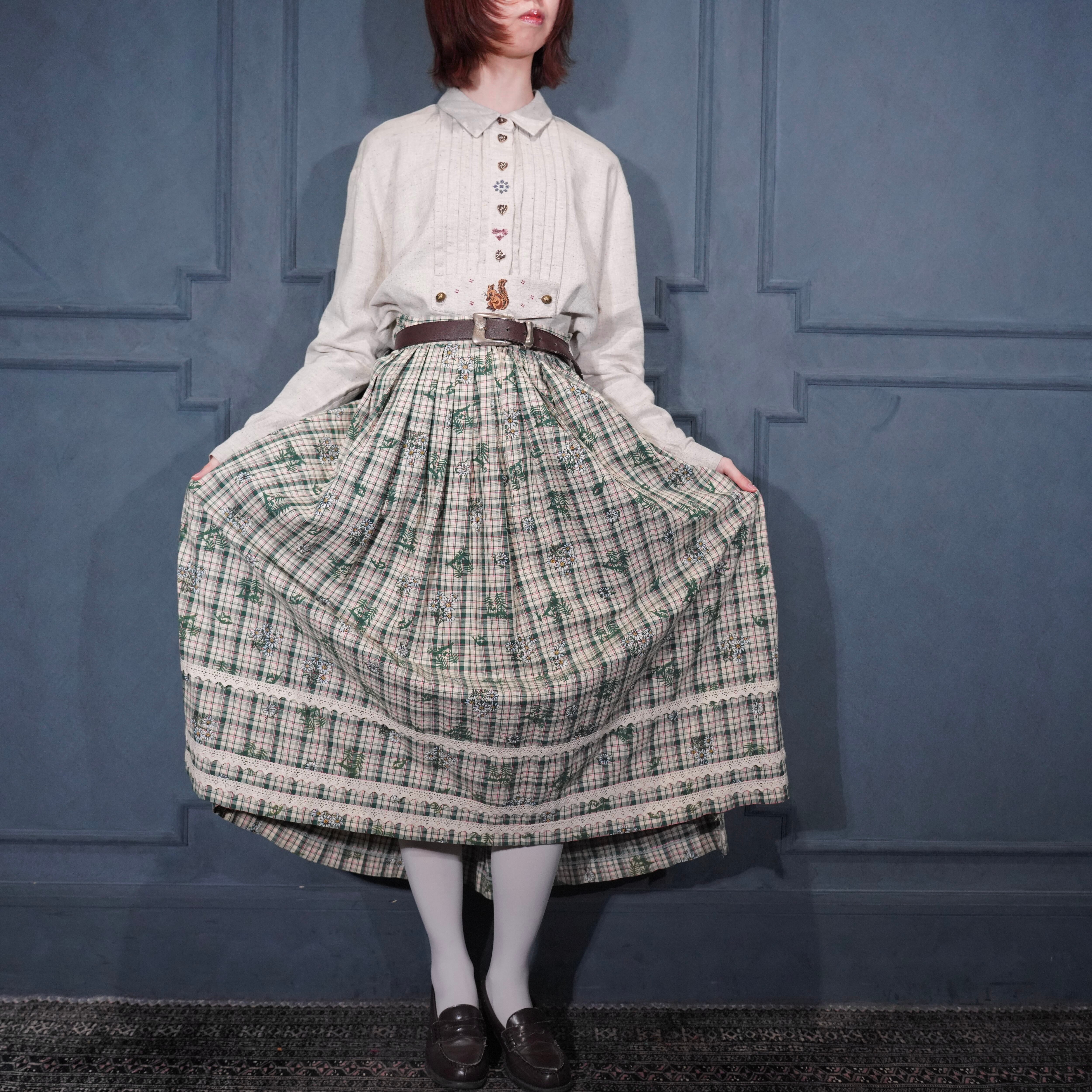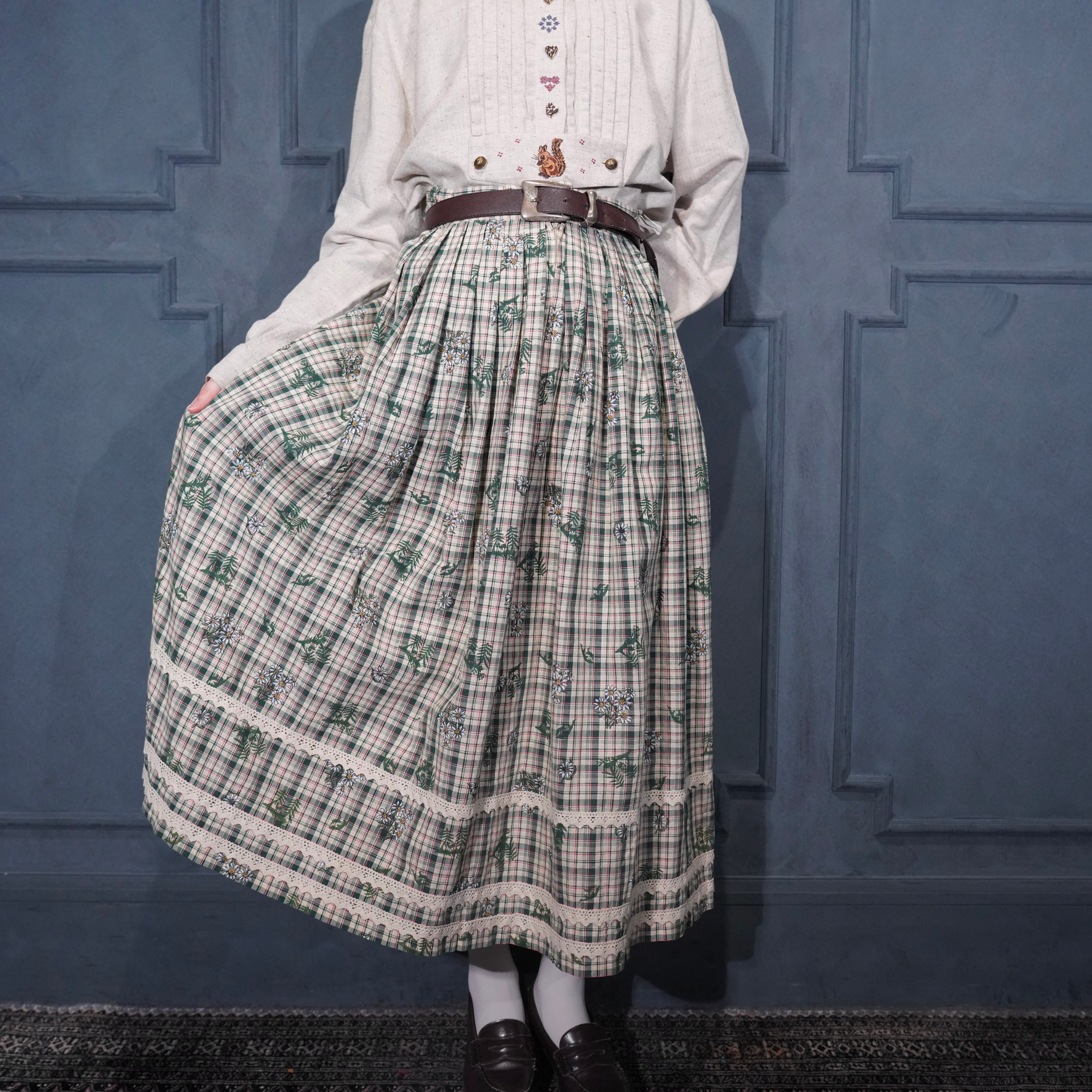 EU VINTAGE Ullmann Landhausmode CHECK PATTERNED FLOWER EMBROIDERY LACE DESIGN LONG SKIRT/ヨーロッパ古着チェック柄お花刺繍レースデザインロングスカート