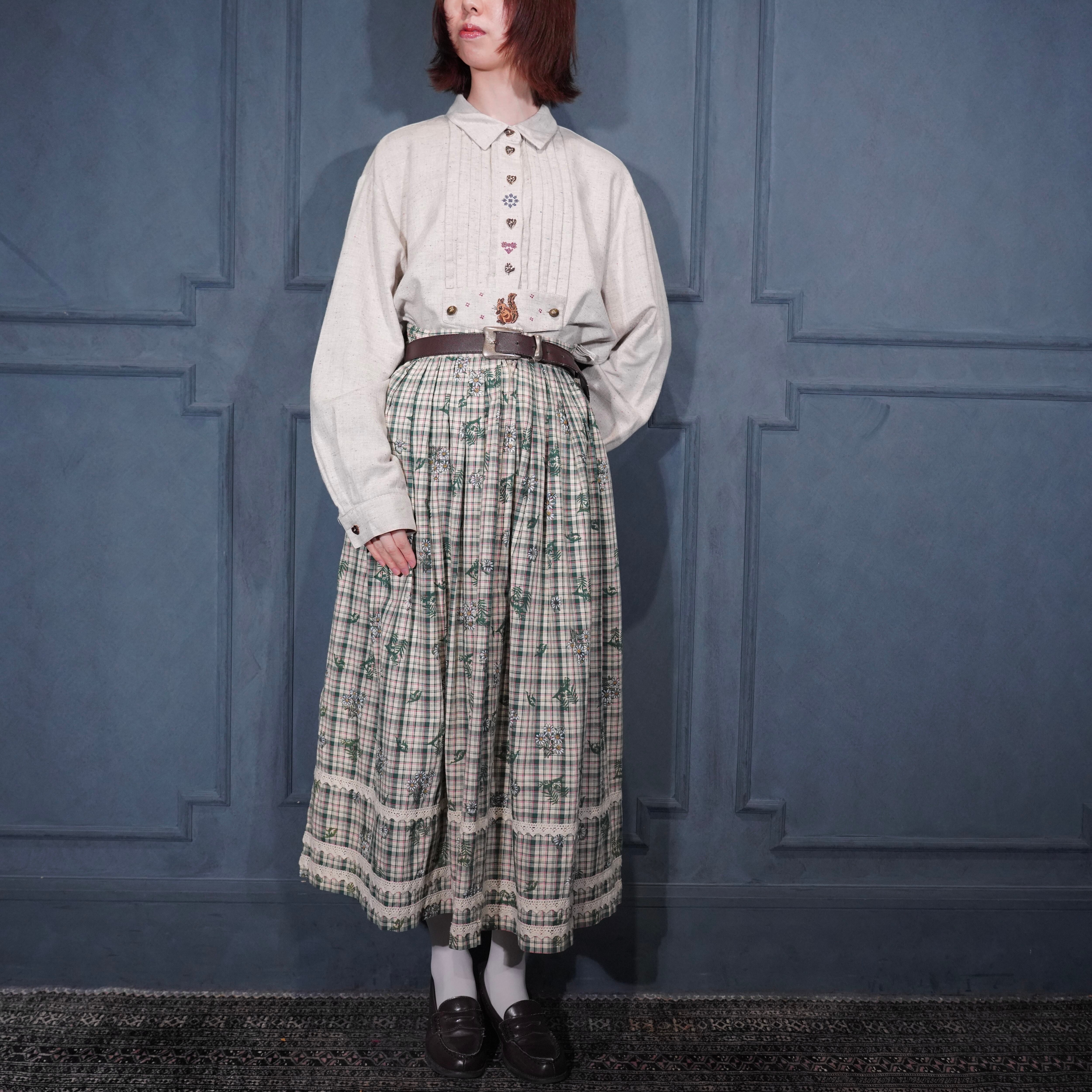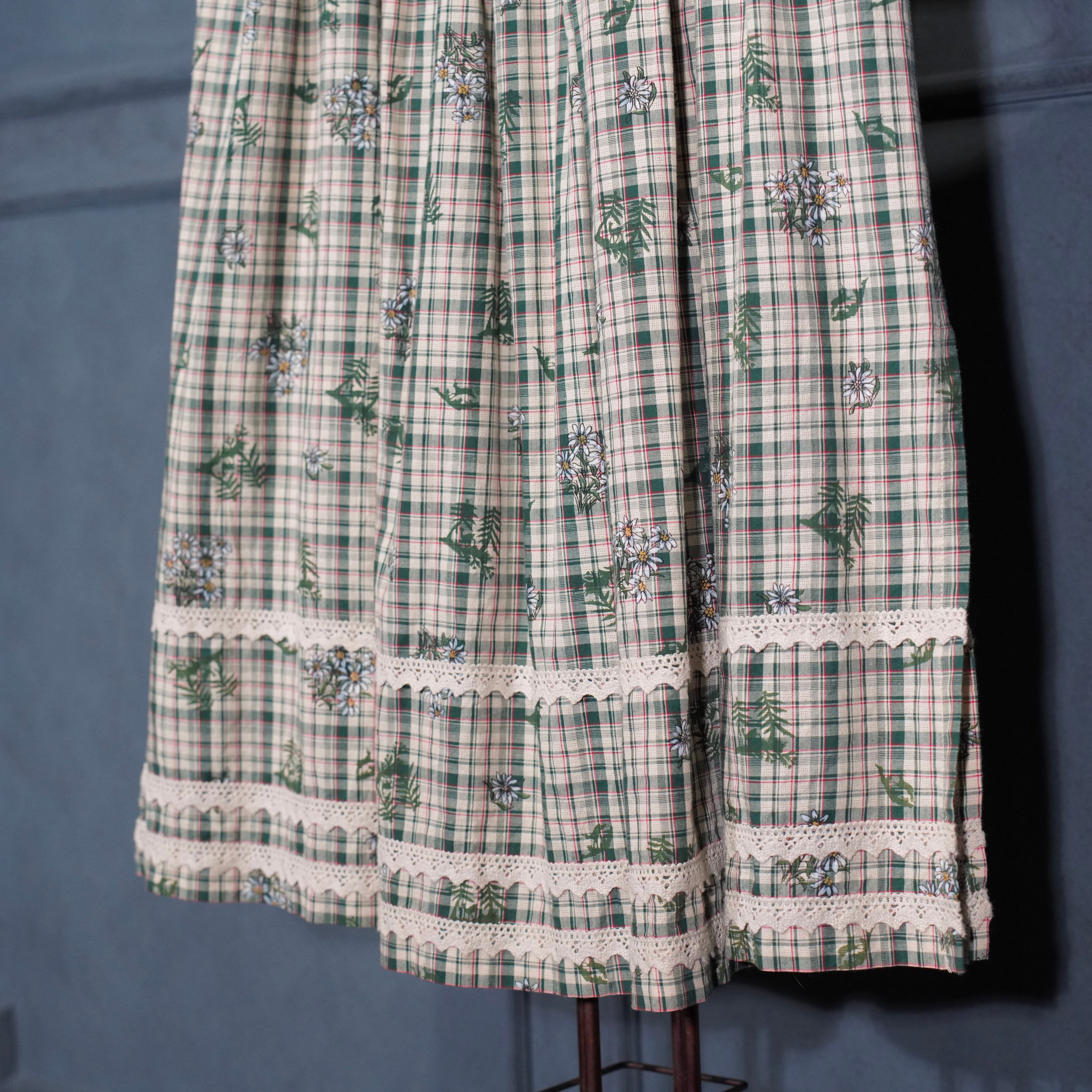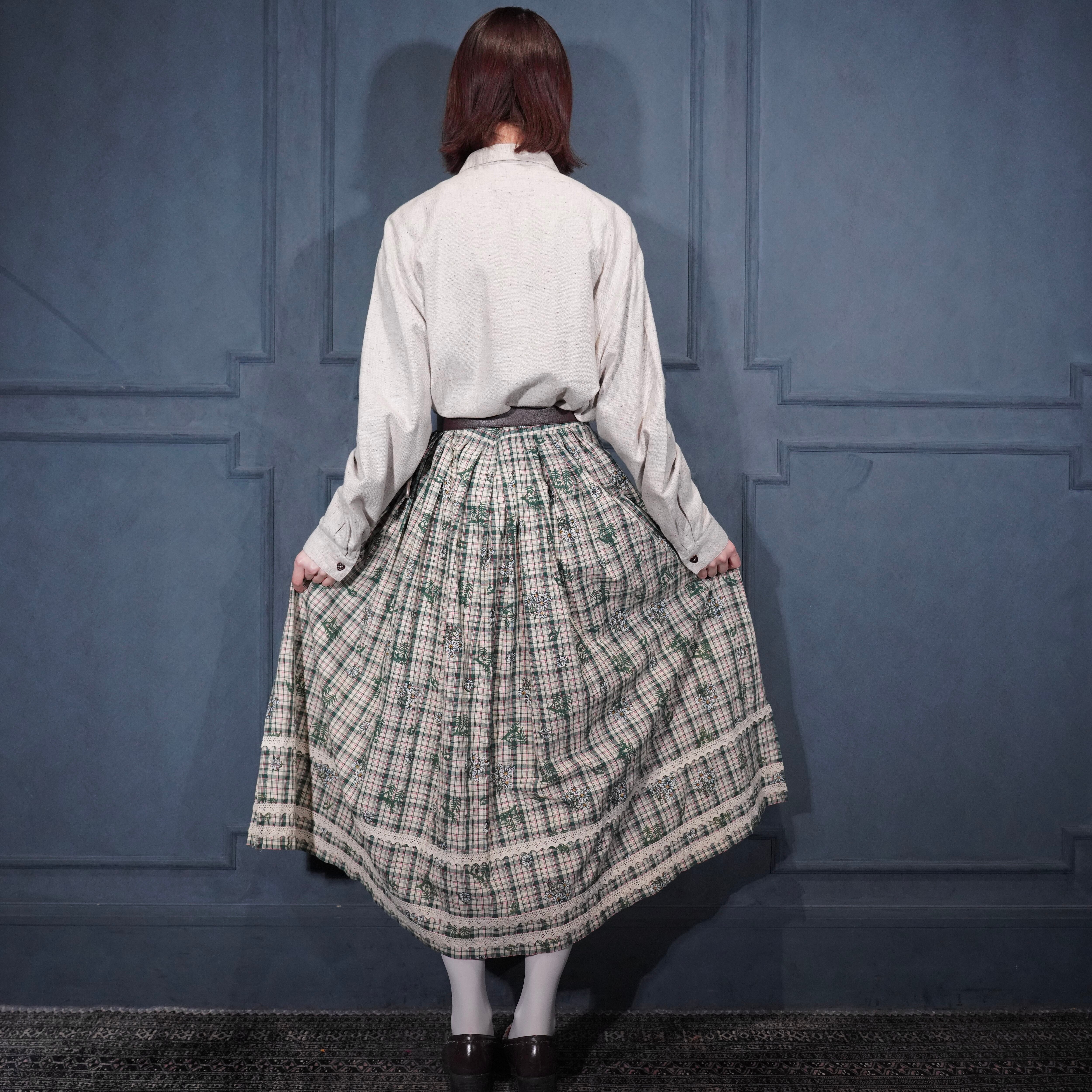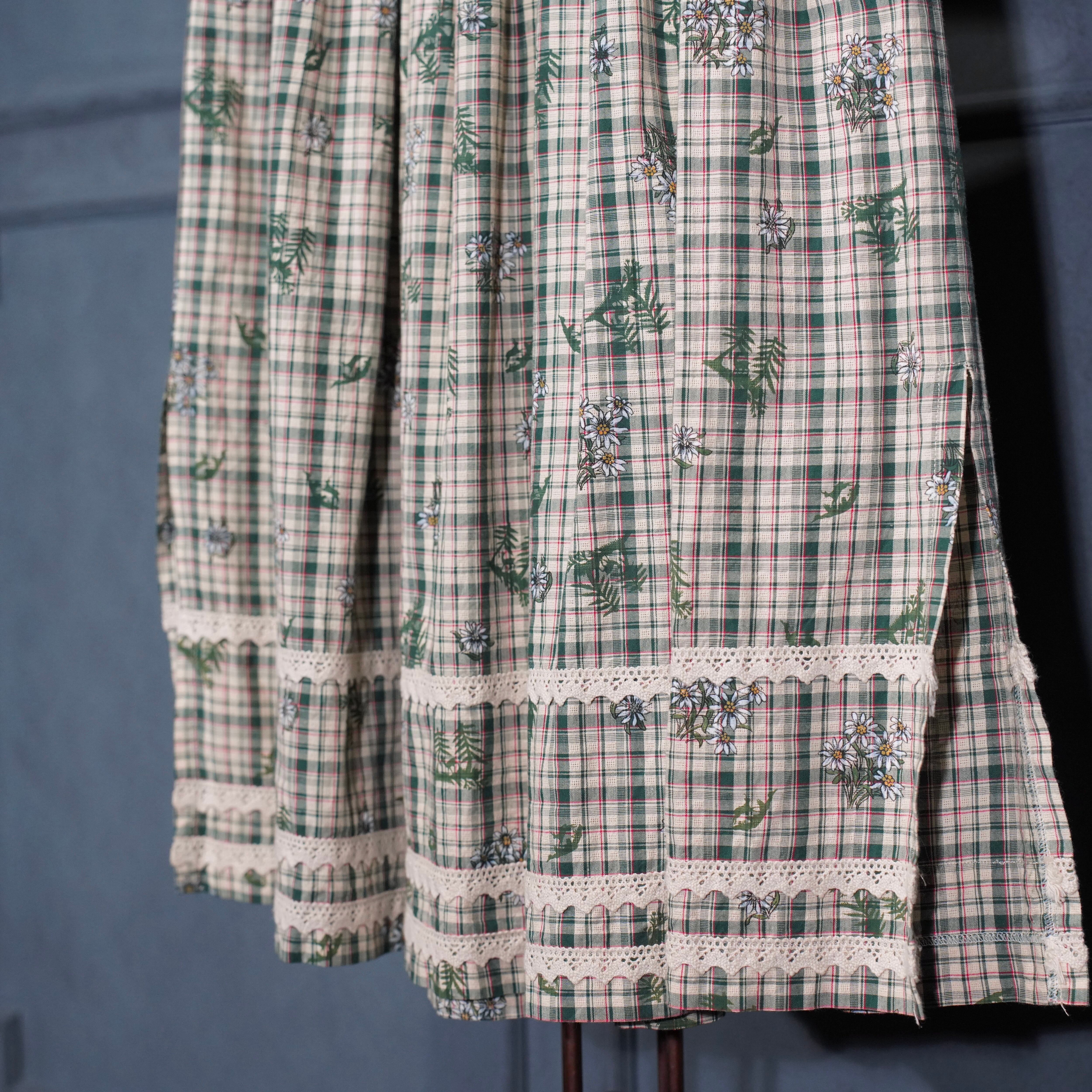 EU VINTAGE Ullmann Landhausmode CHECK PATTERNED FLOWER EMBROIDERY LACE DESIGN LONG SKIRT/ヨーロッパ古着チェック柄お花刺繍レースデザインロングスカート