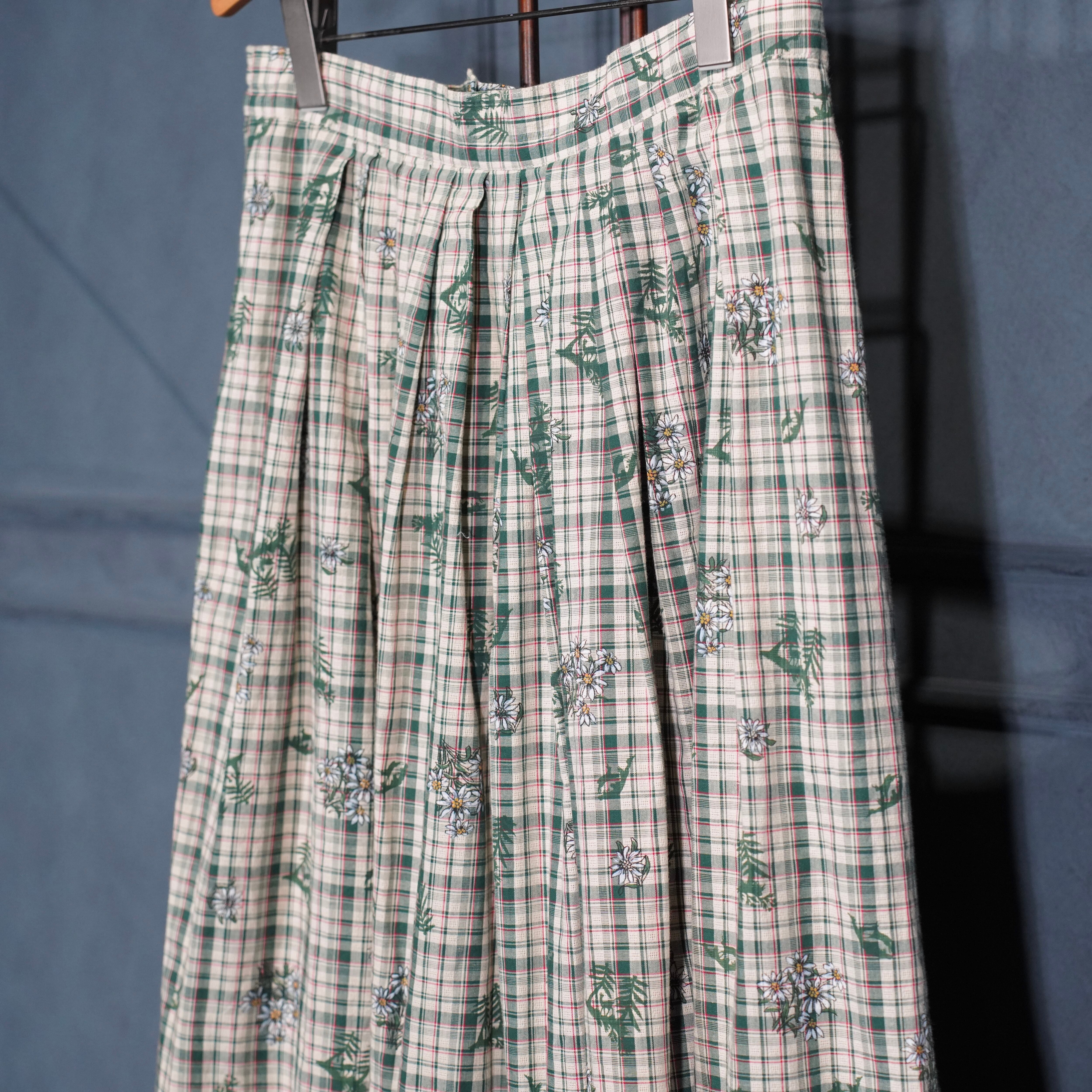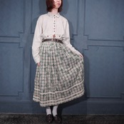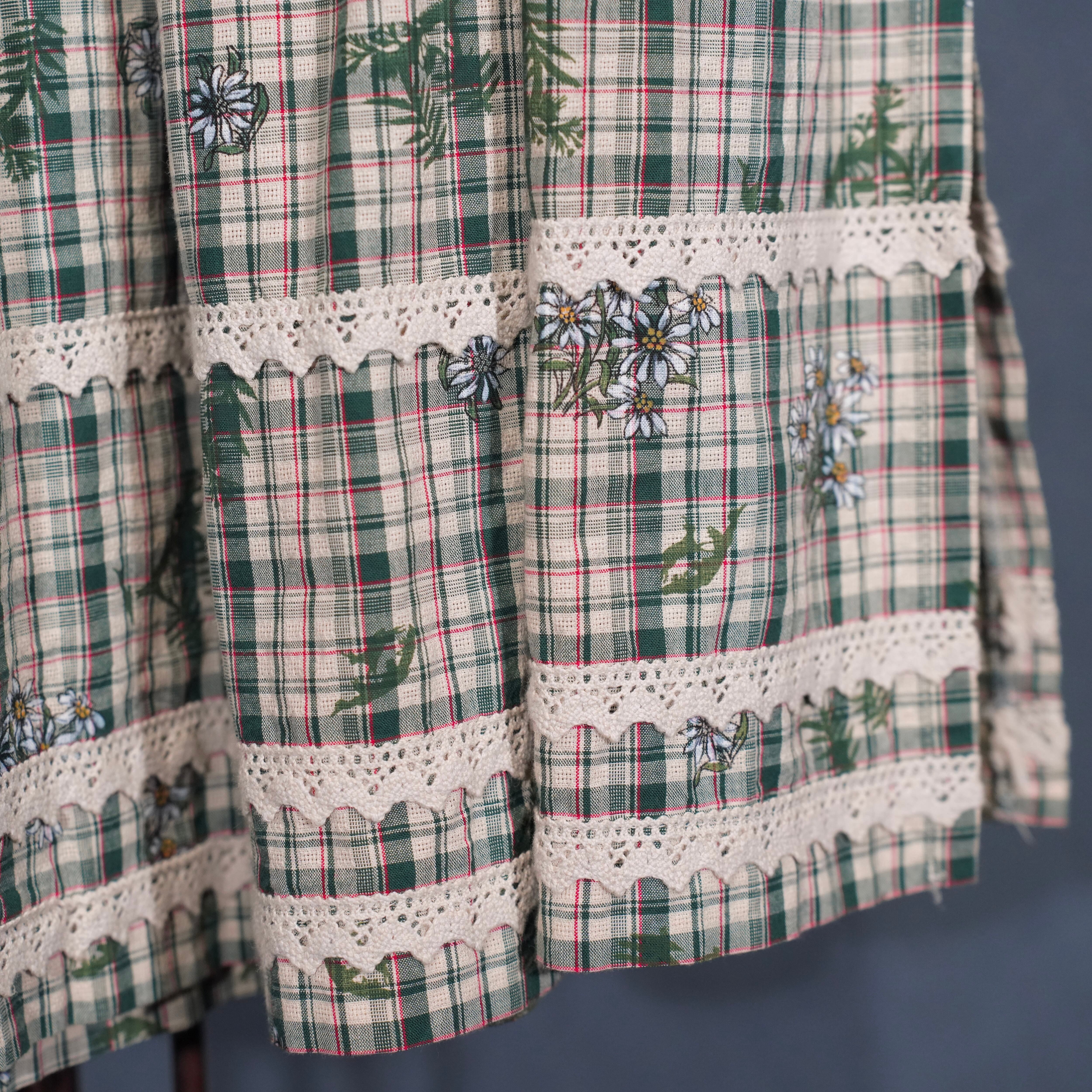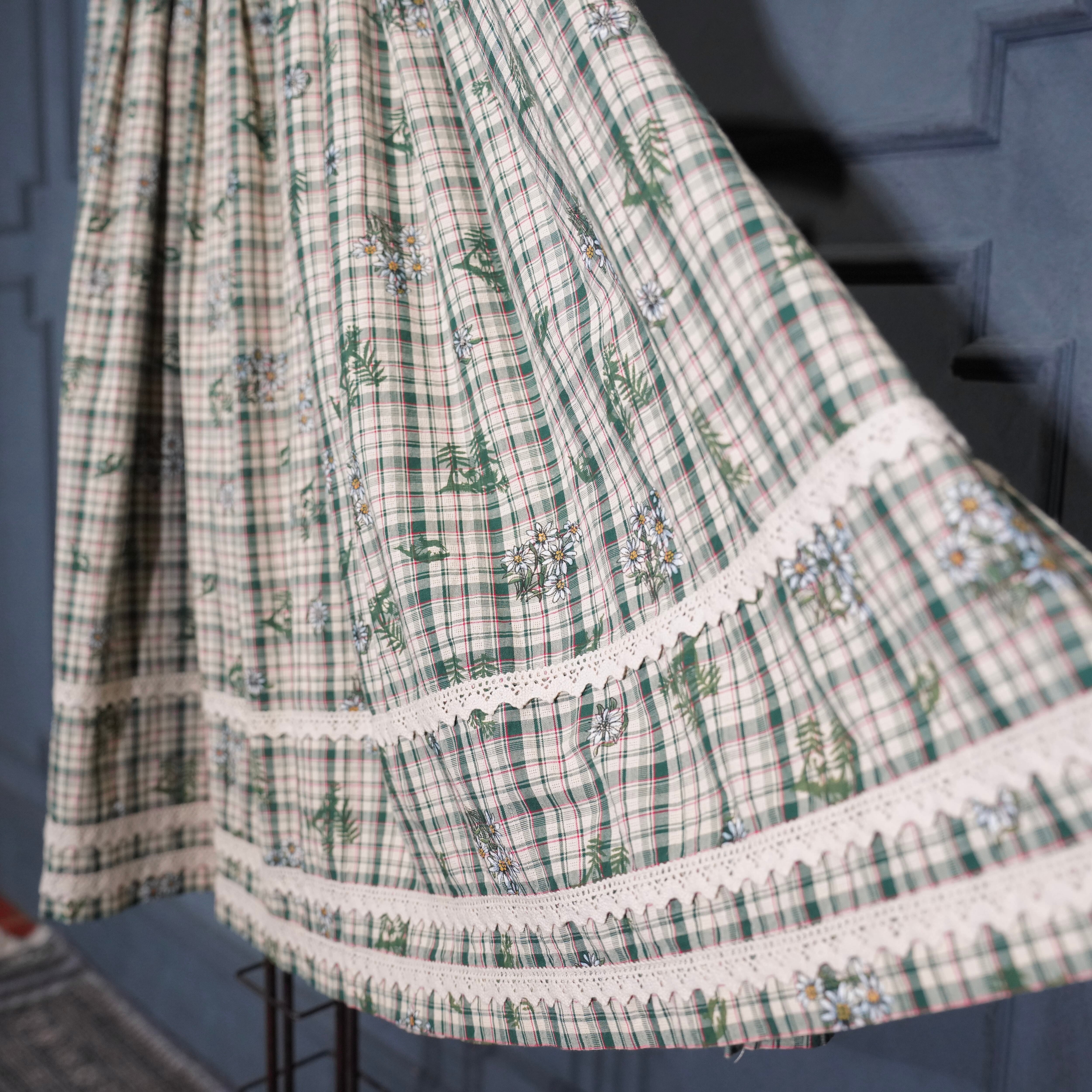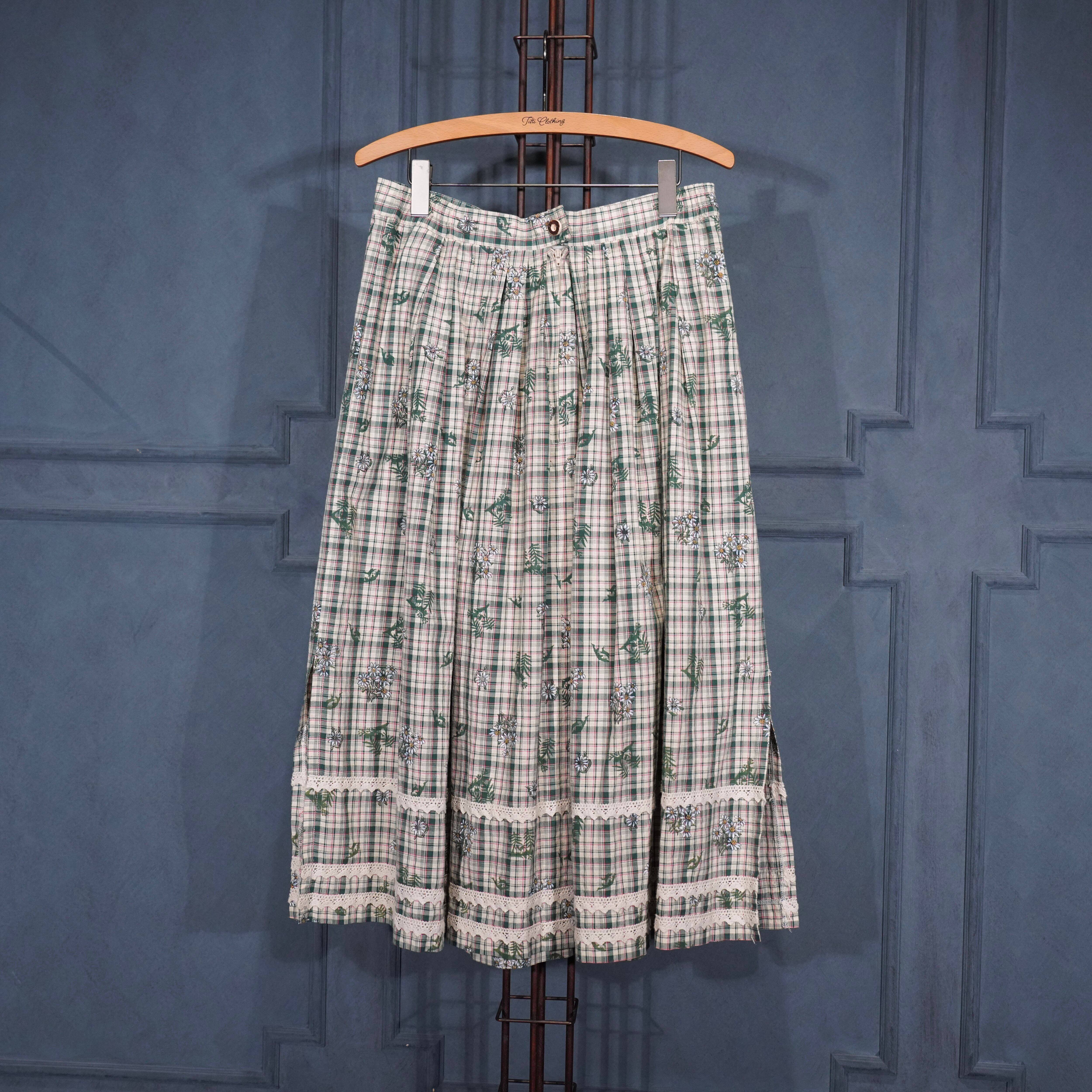 EU VINTAGE Ullmann Landhausmode CHECK PATTERNED FLOWER EMBROIDERY LACE DESIGN LONG SKIRT/ヨーロッパ古着チェック柄お花刺繍レースデザインロングスカート