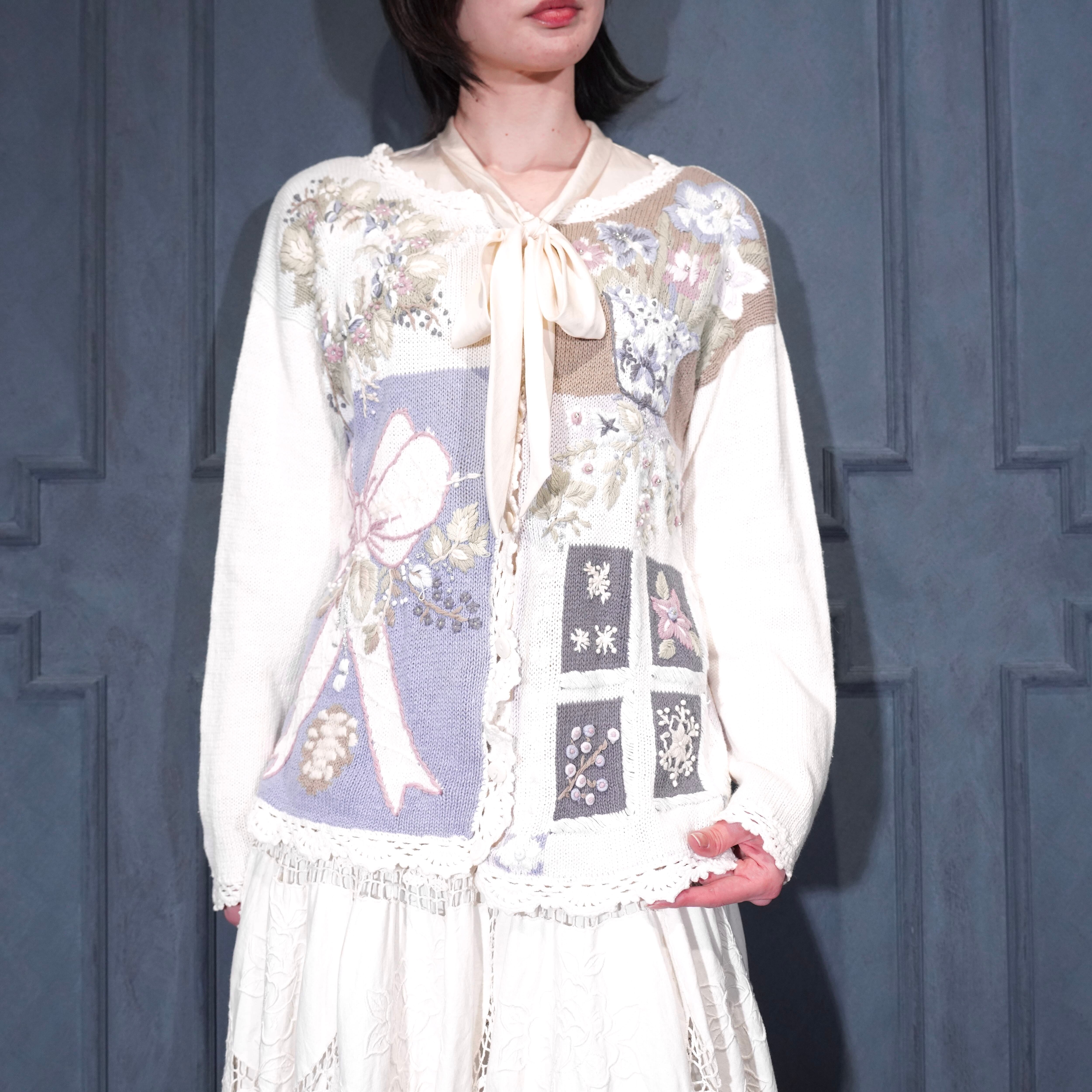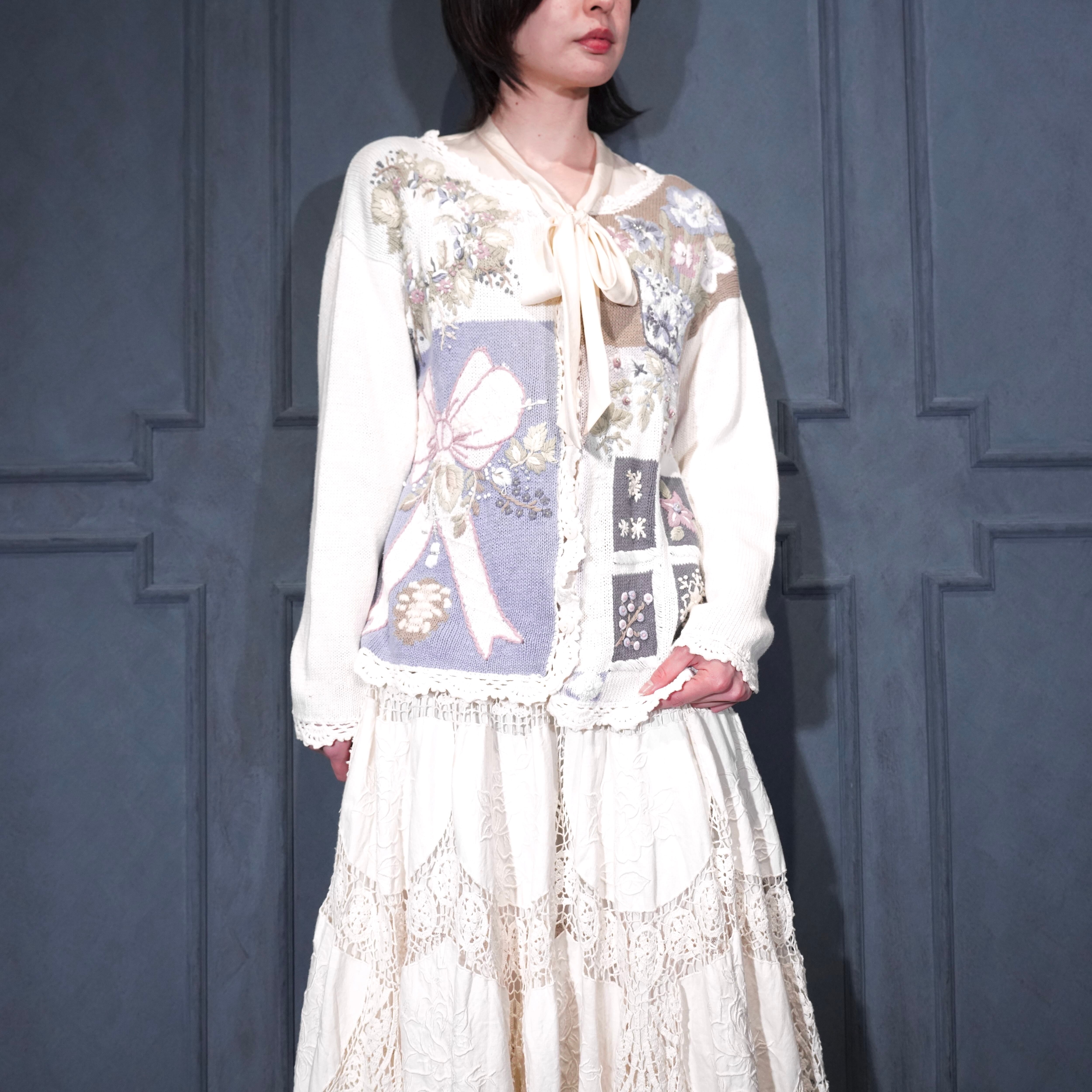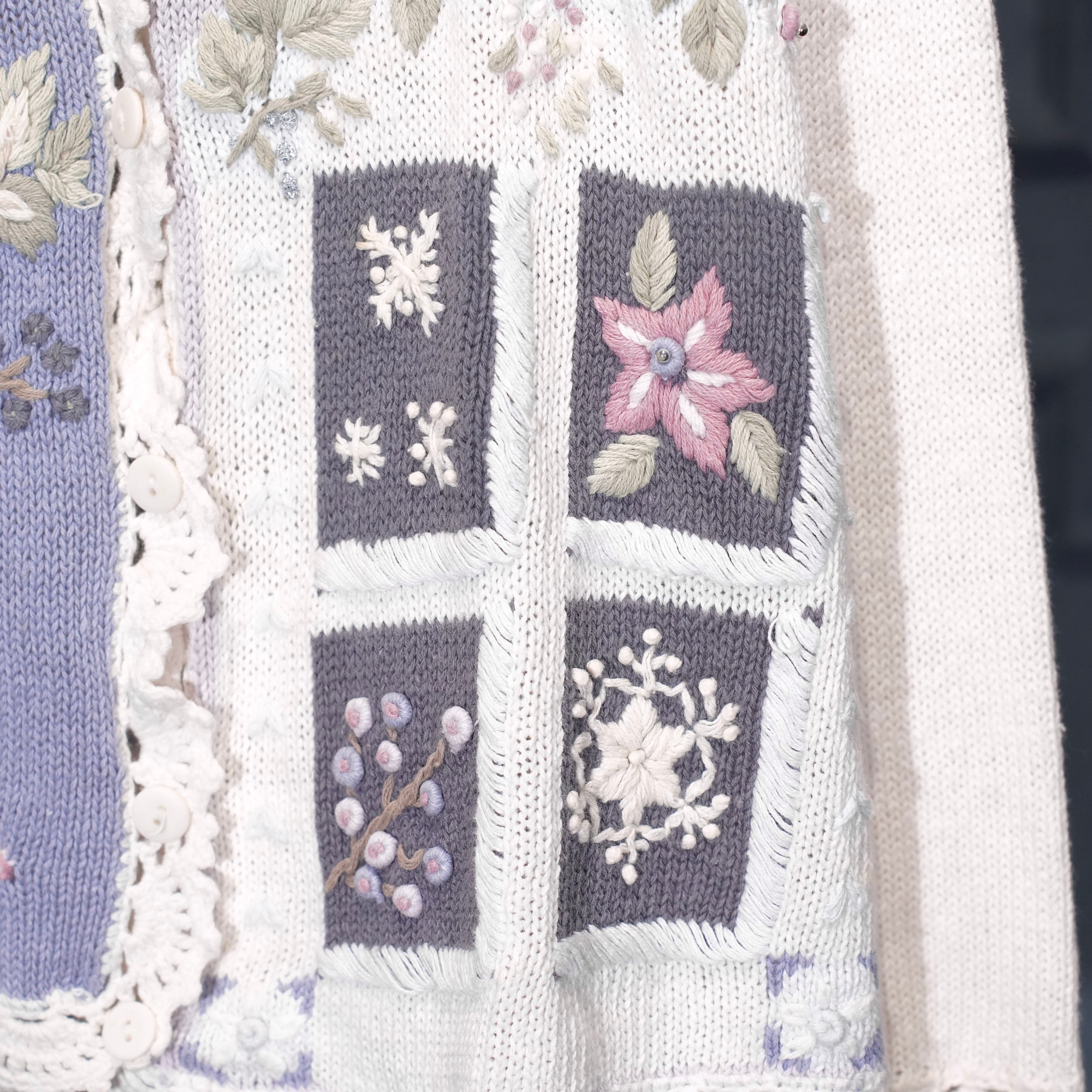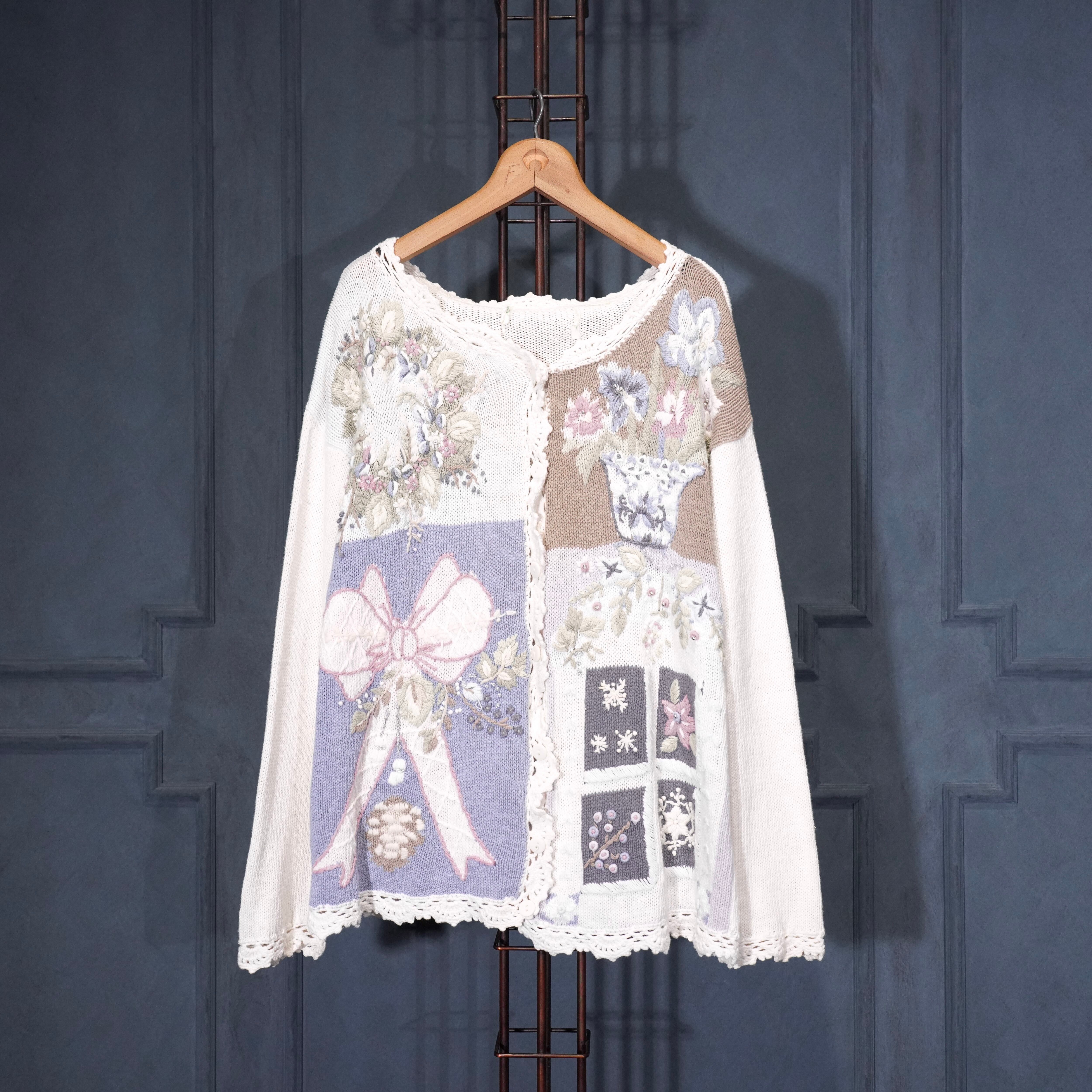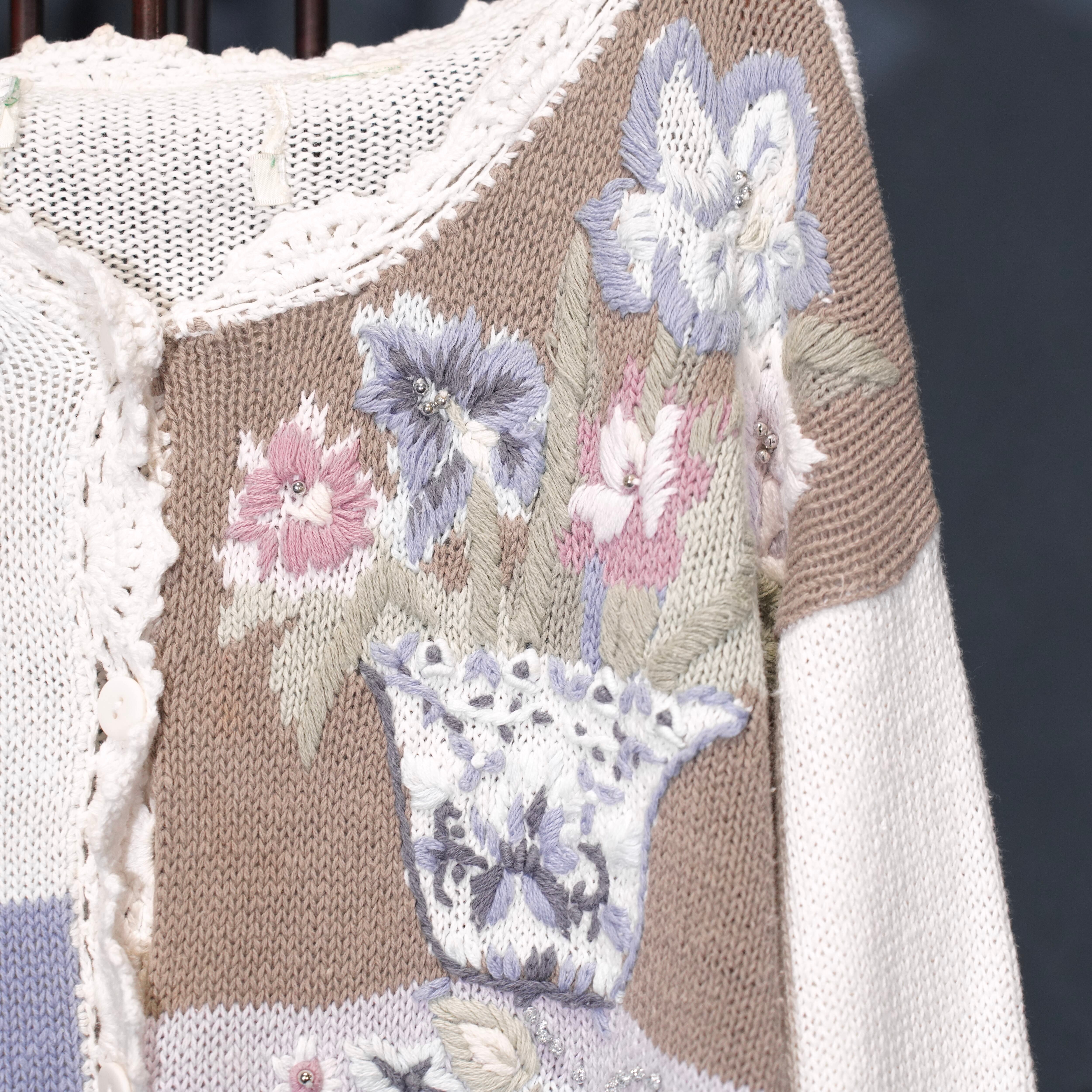 USA VINTAGE FLOWER EMBROIDERY DESIGN COTTON RAMIE HAND KNIT CARDIGAN/アメリカ古着お花刺繍デザインコットンラミーハンドニットカーディガン