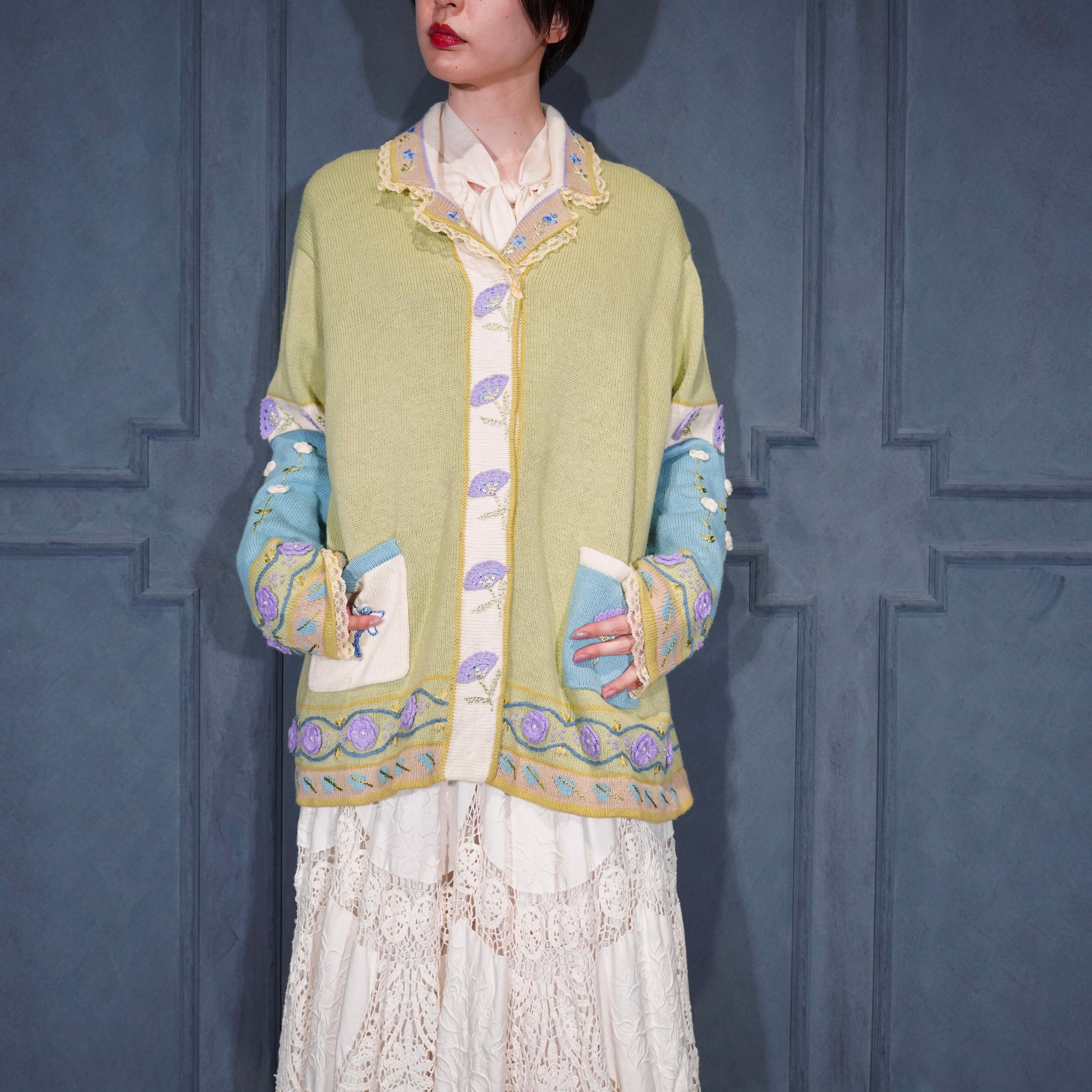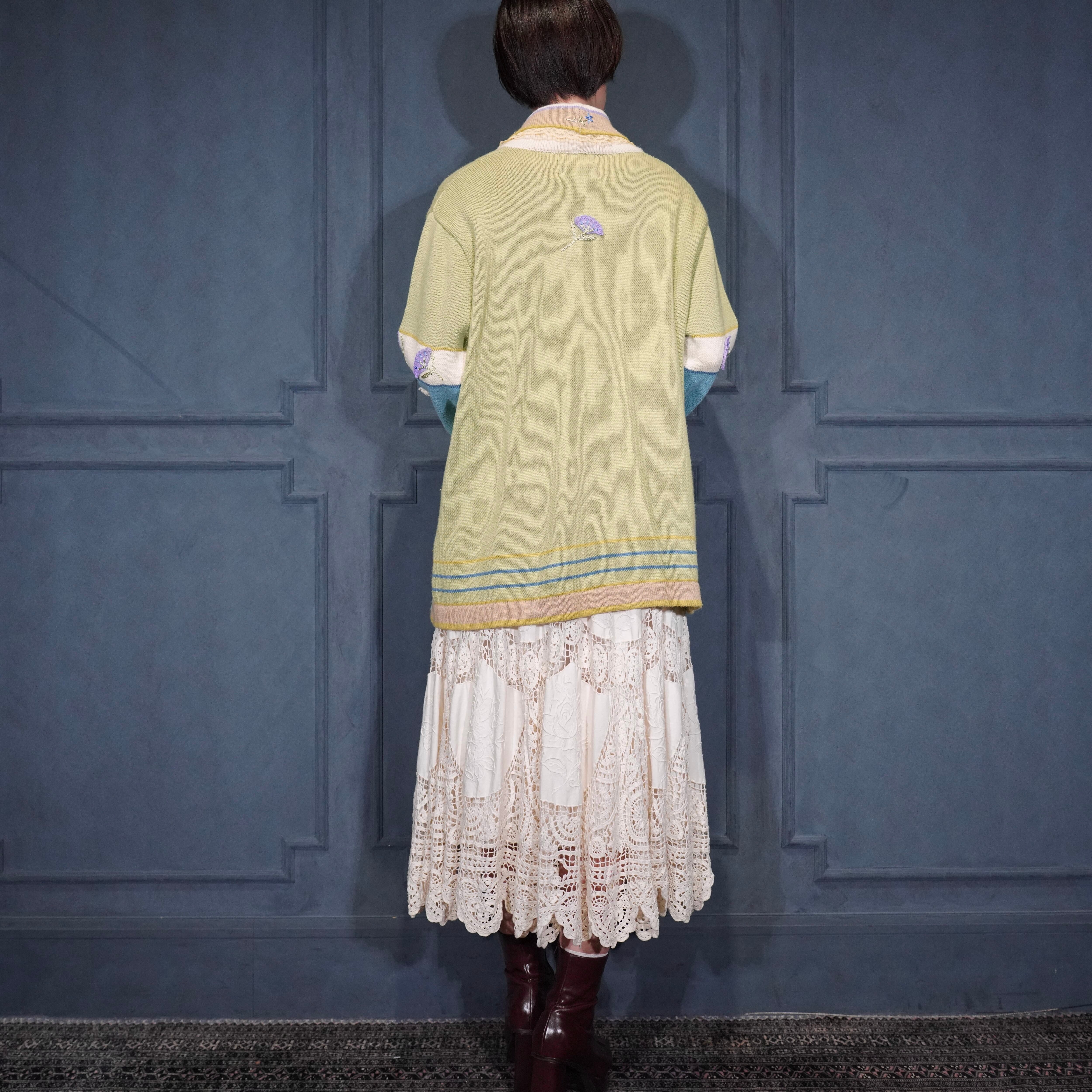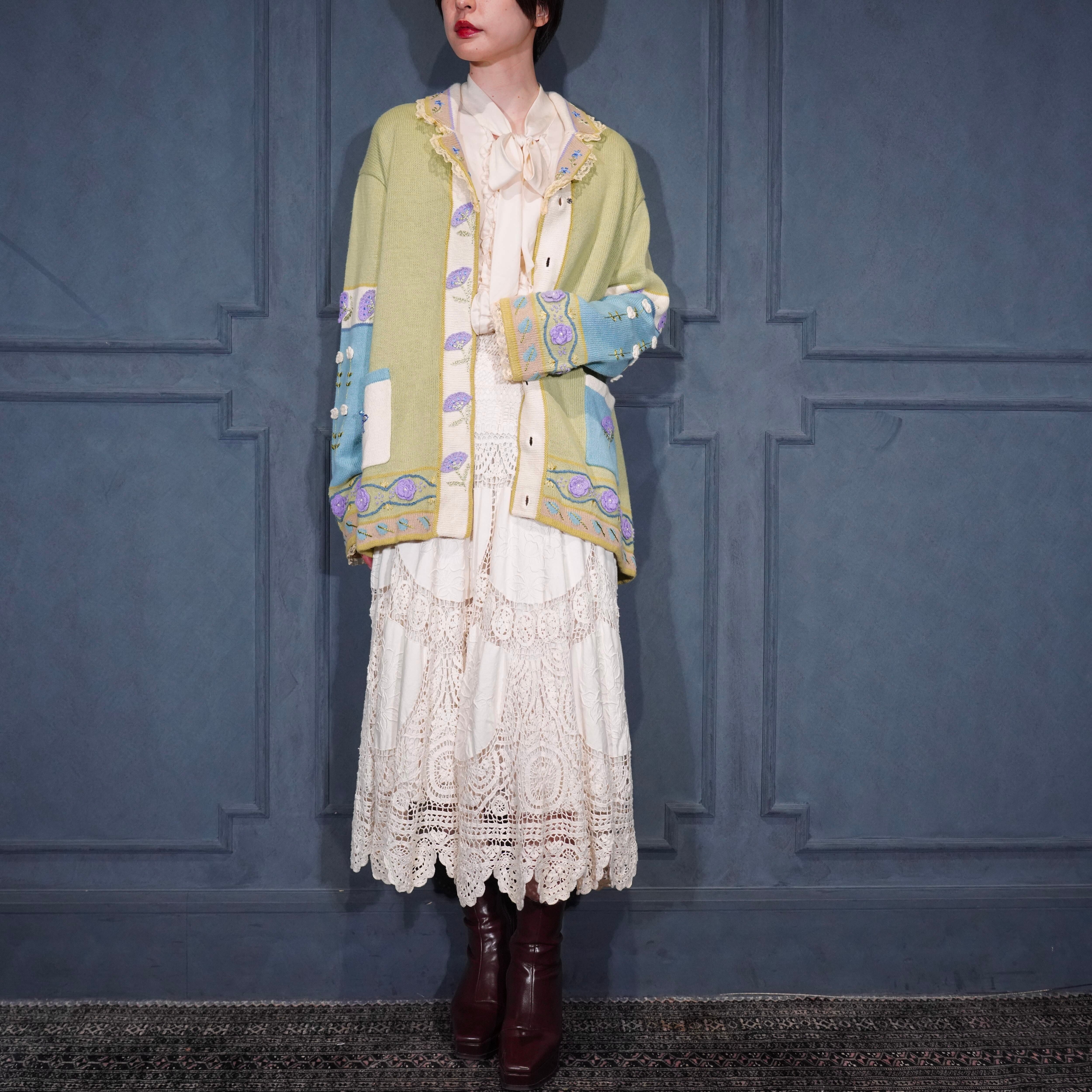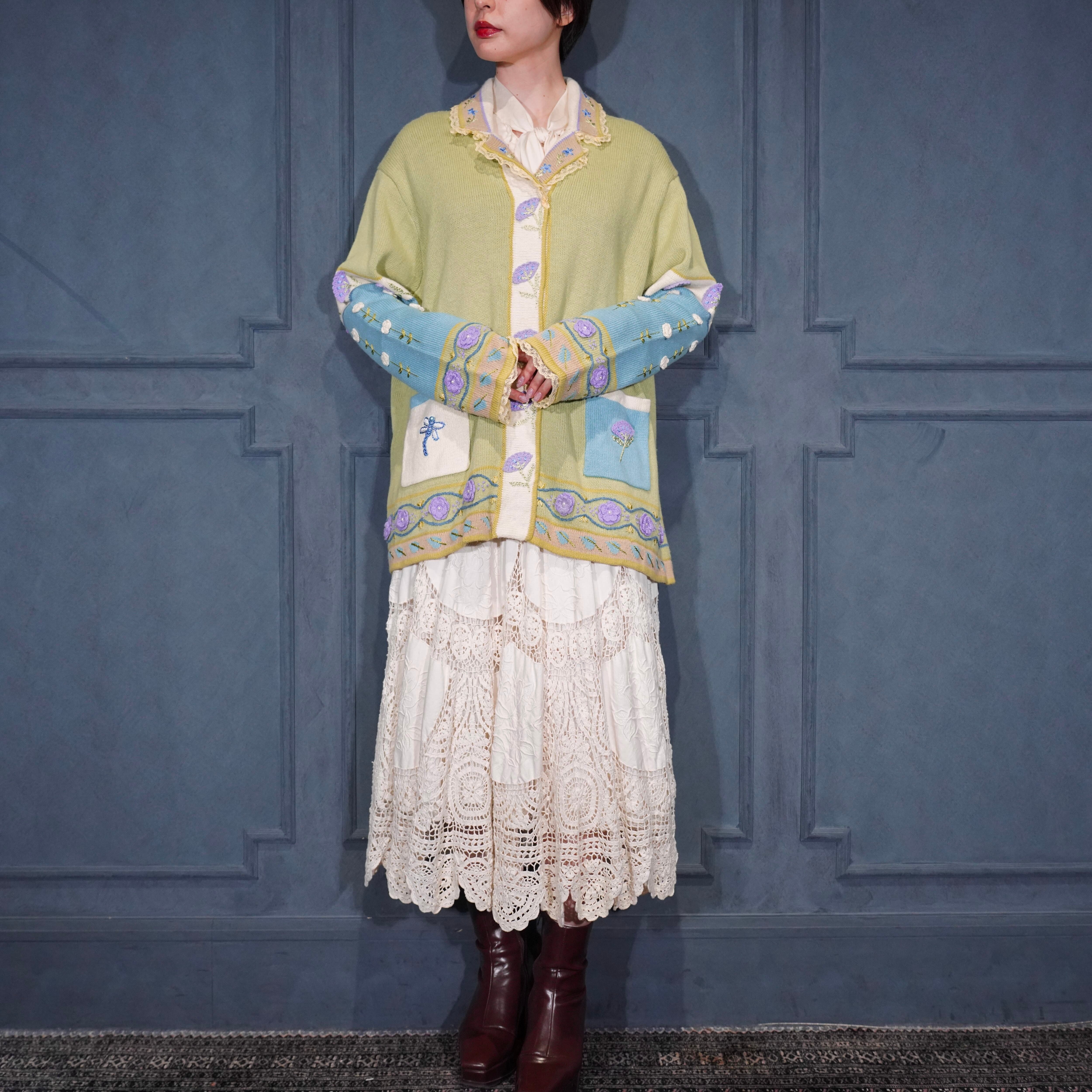 USA VINTAGE Storybook Knits FLOWER BUTTON EMBROIDERY LACE DESIGN COTTON RAMIE HAND KNIT JACKET/アメリカ古着お花ボタン刺繍レースデザインコットンラミーハンドニットジャケット(カーディガン)
