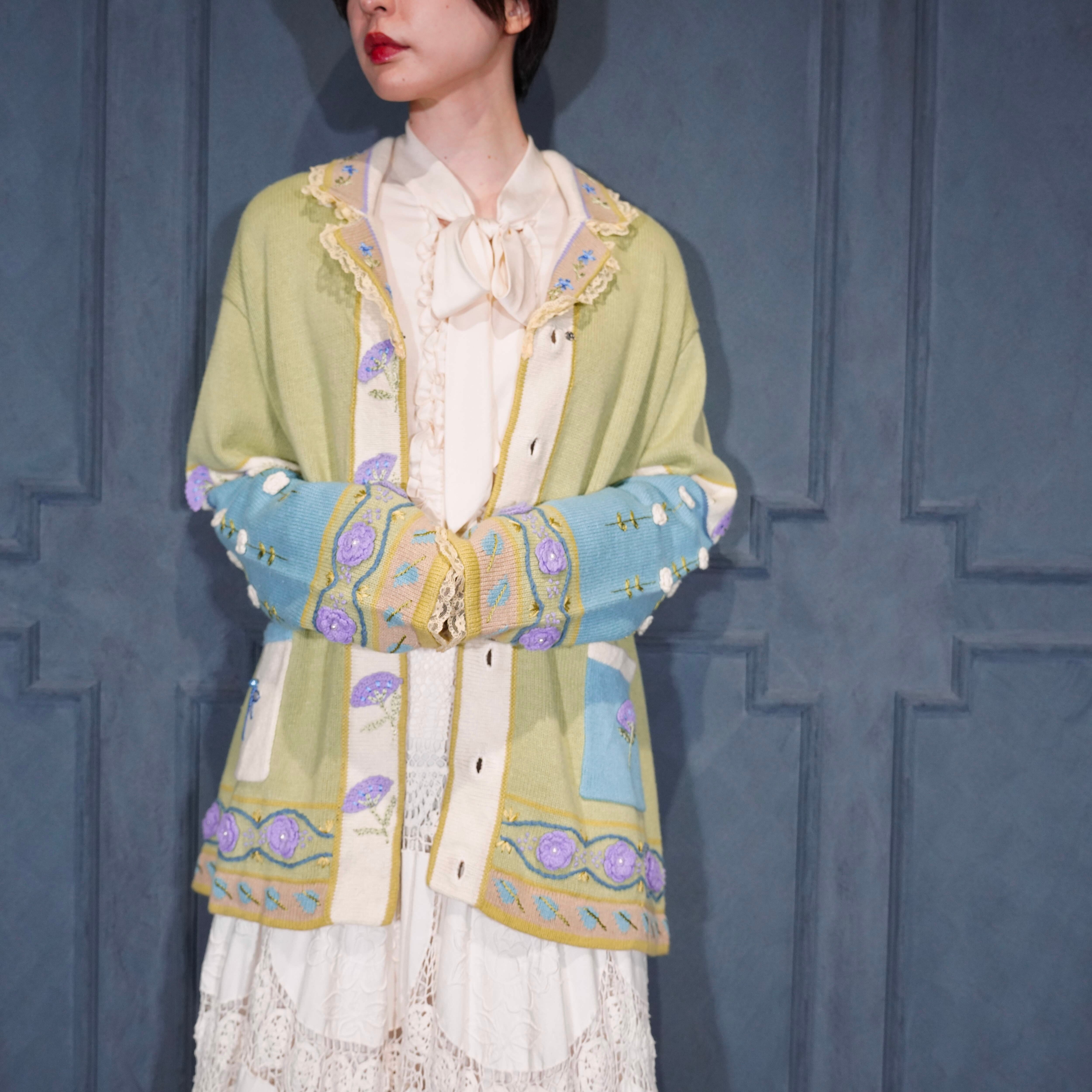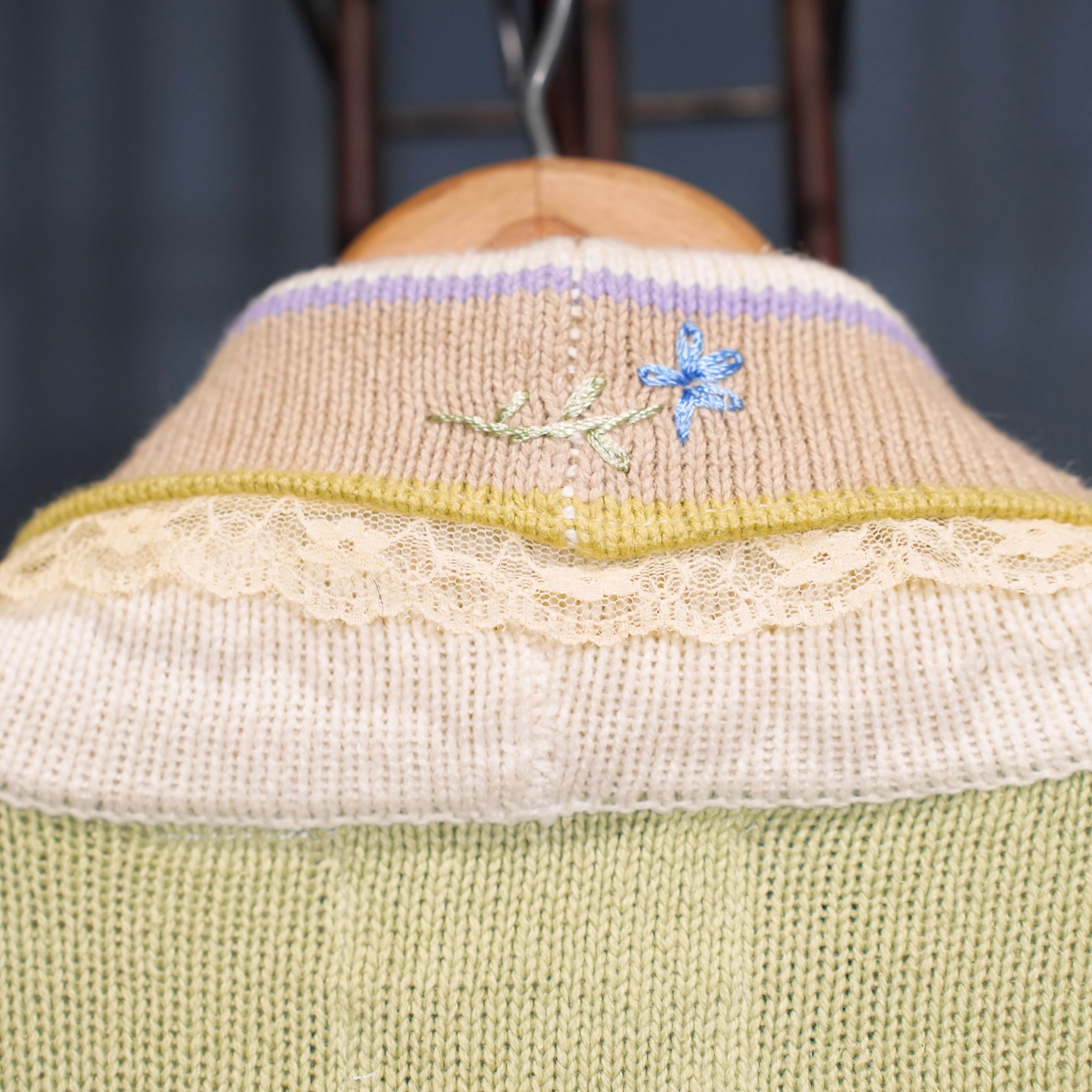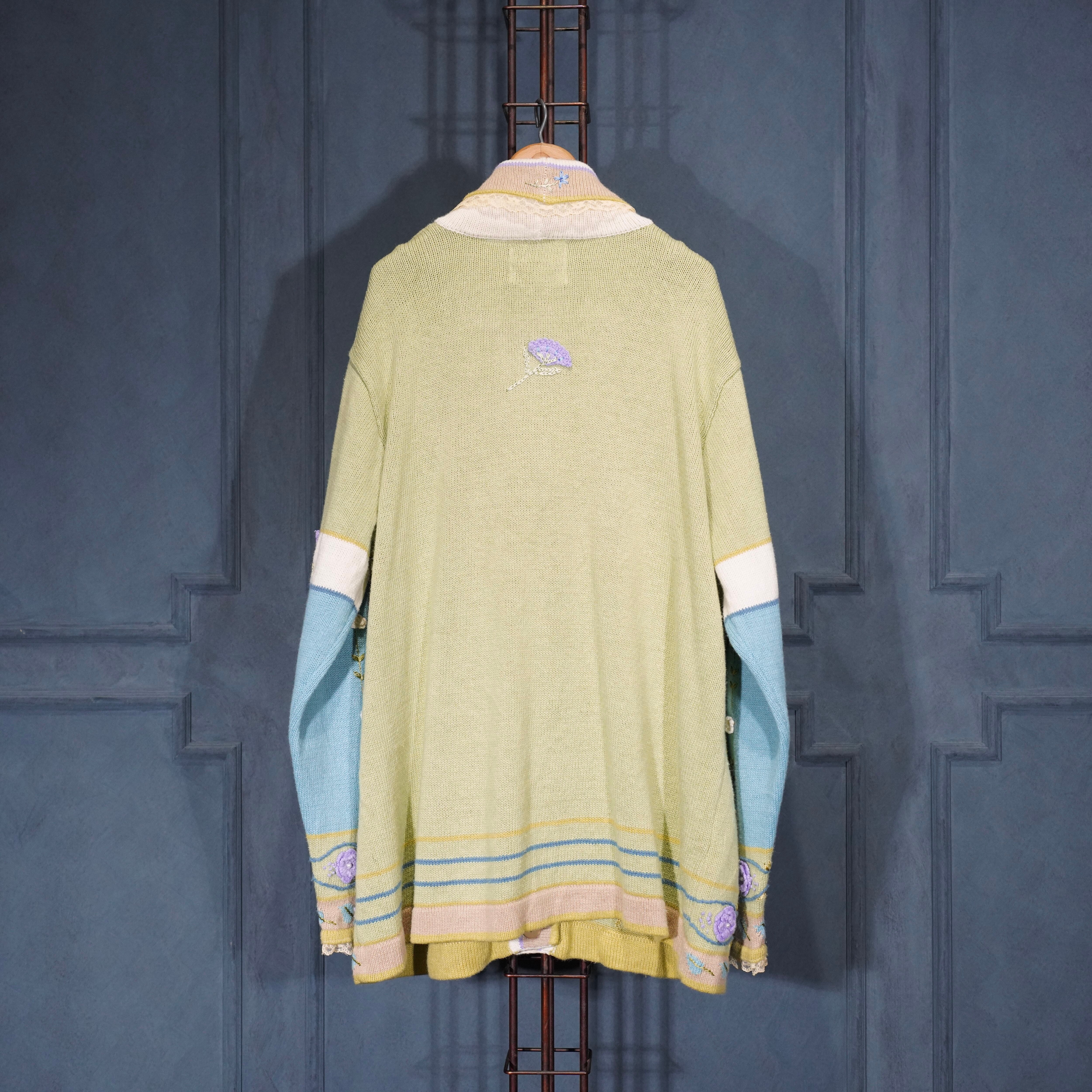 USA VINTAGE Storybook Knits FLOWER BUTTON EMBROIDERY LACE DESIGN COTTON RAMIE HAND KNIT JACKET/アメリカ古着お花ボタン刺繍レースデザインコットンラミーハンドニットジャケット(カーディガン)