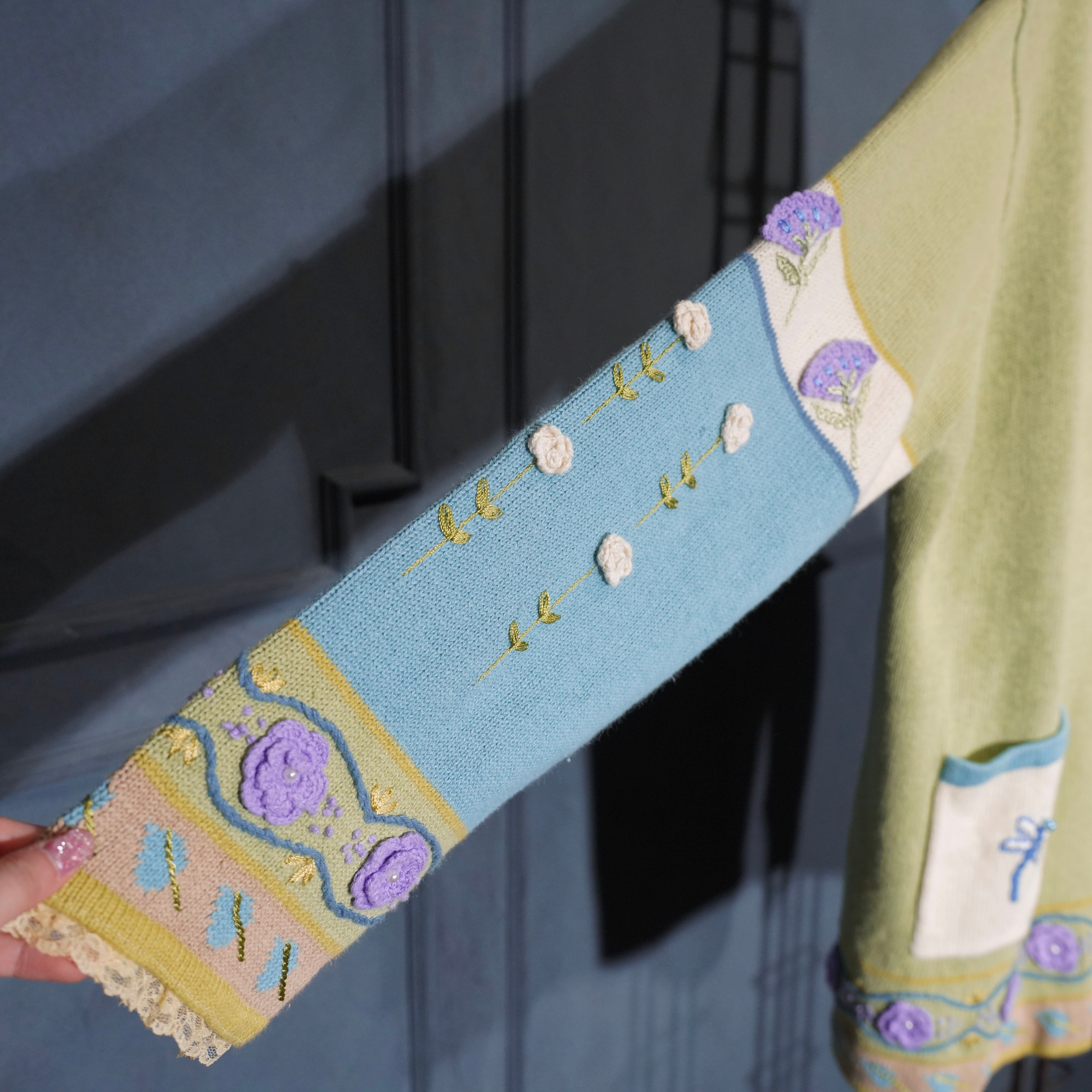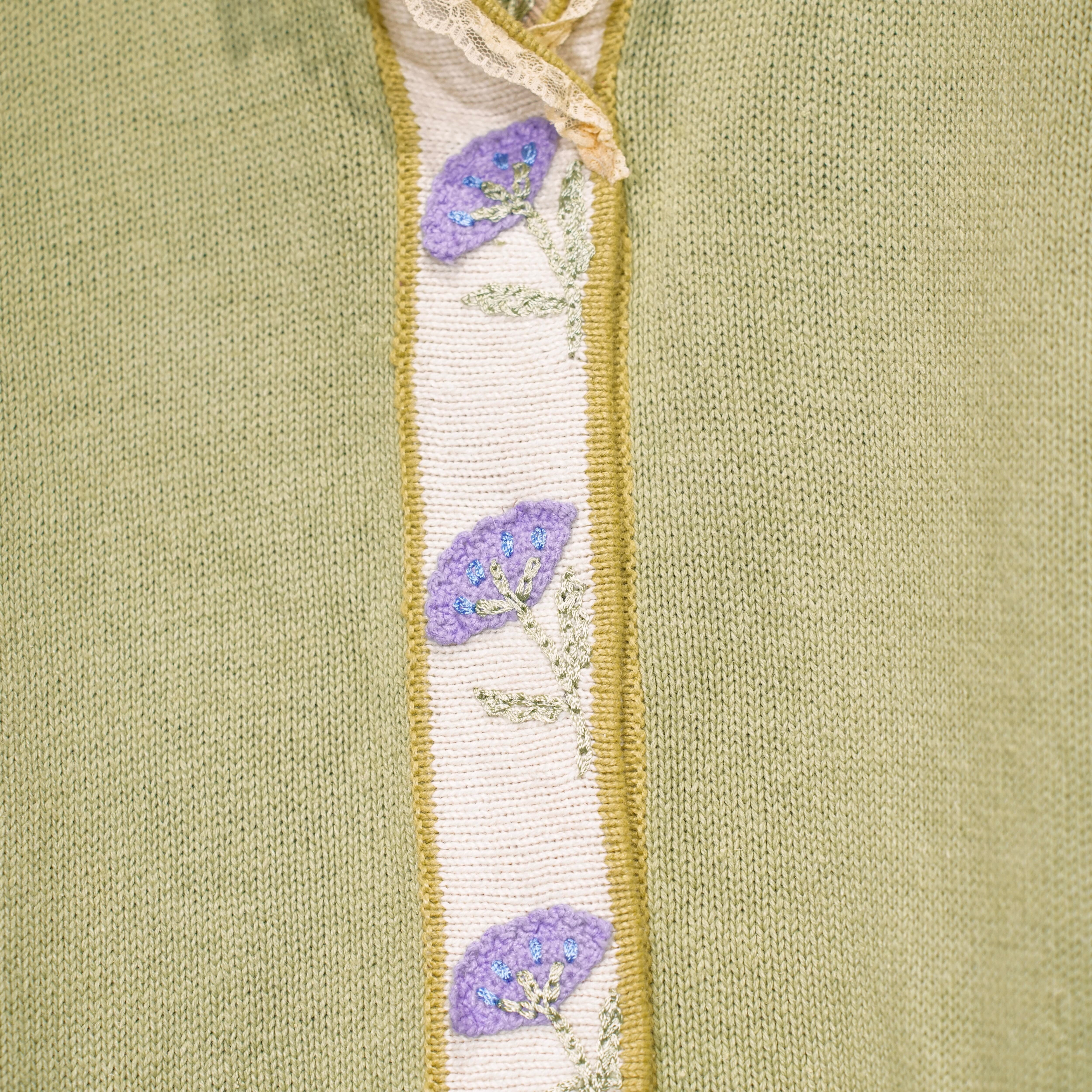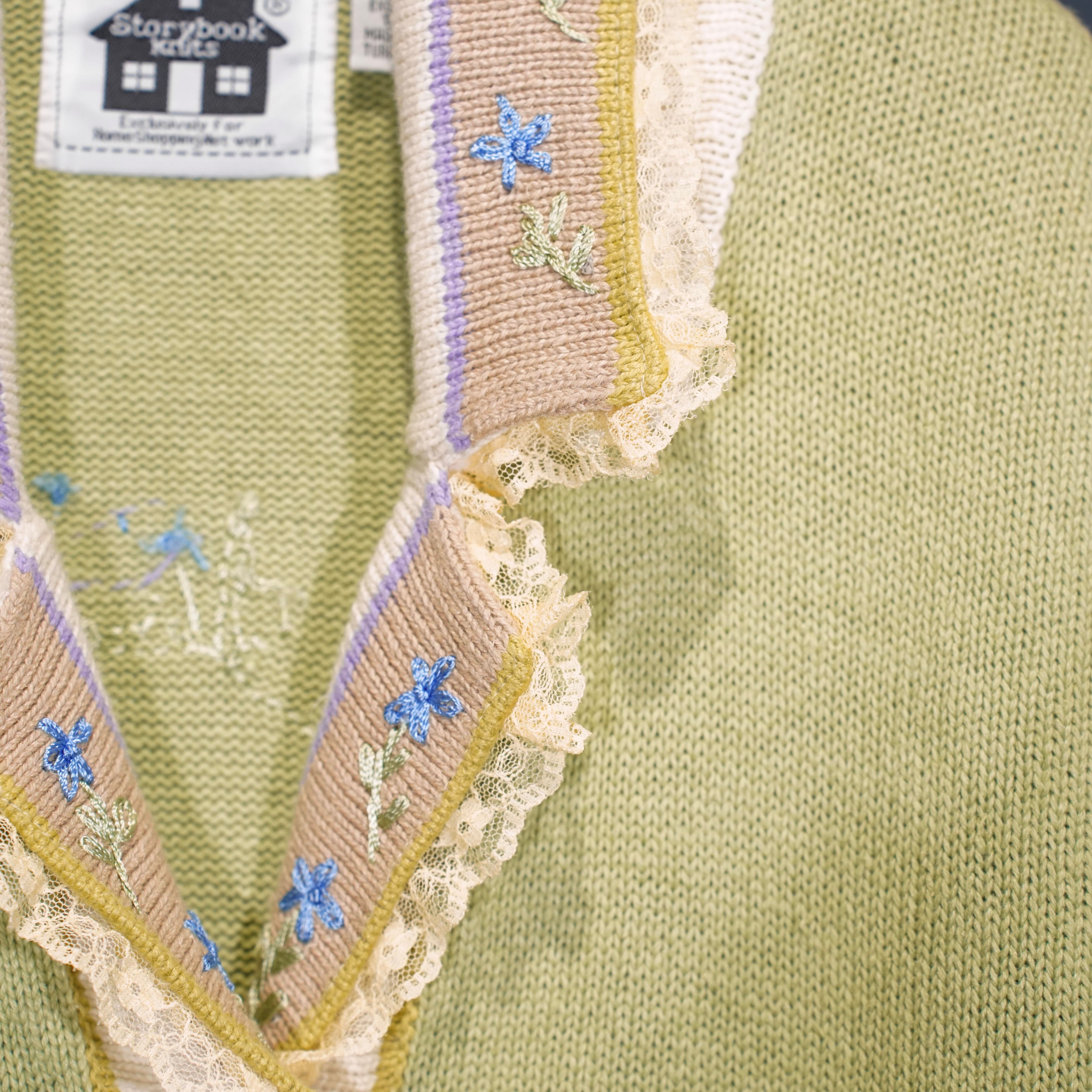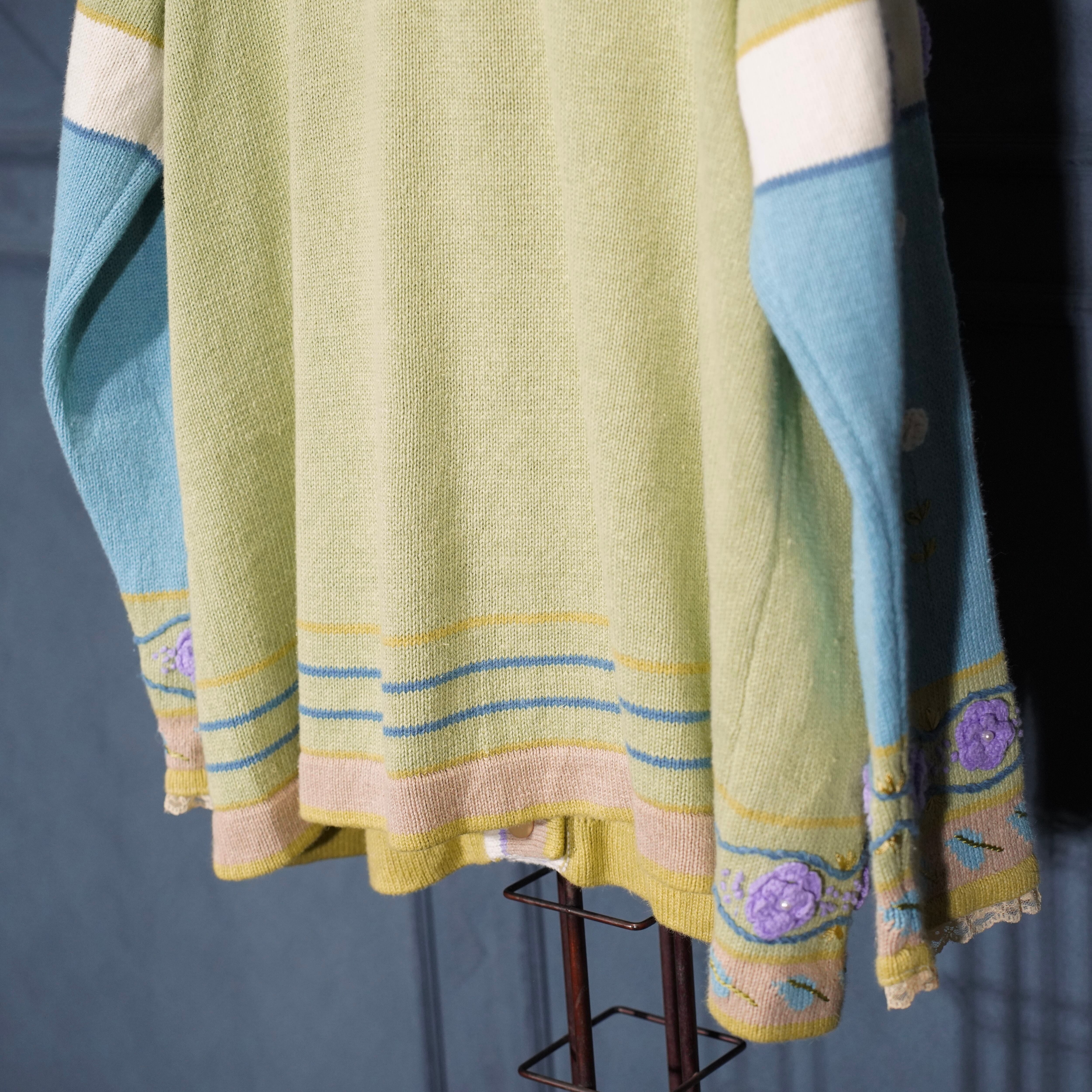 USA VINTAGE Storybook Knits FLOWER BUTTON EMBROIDERY LACE DESIGN COTTON RAMIE HAND KNIT JACKET/アメリカ古着お花ボタン刺繍レースデザインコットンラミーハンドニットジャケット(カーディガン)