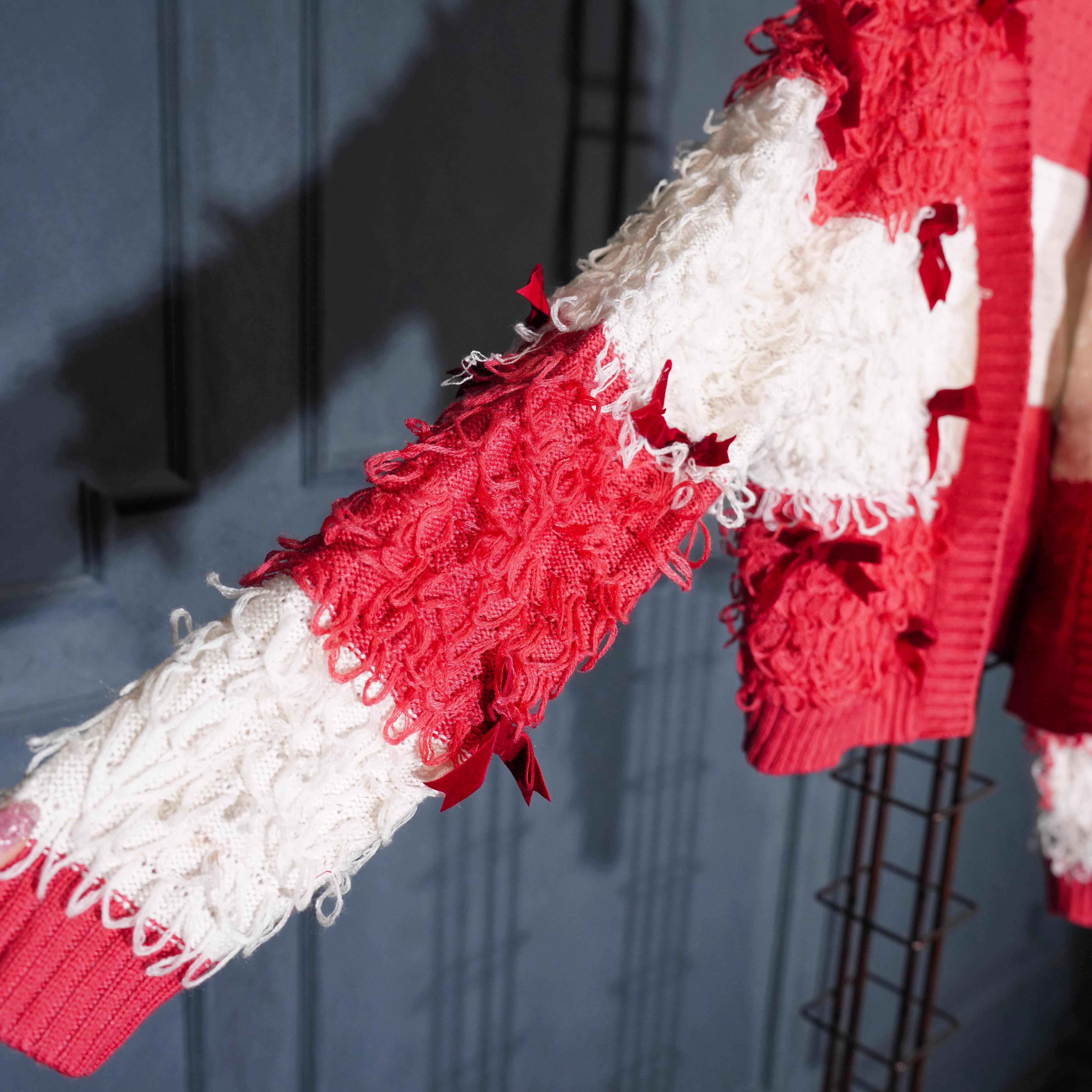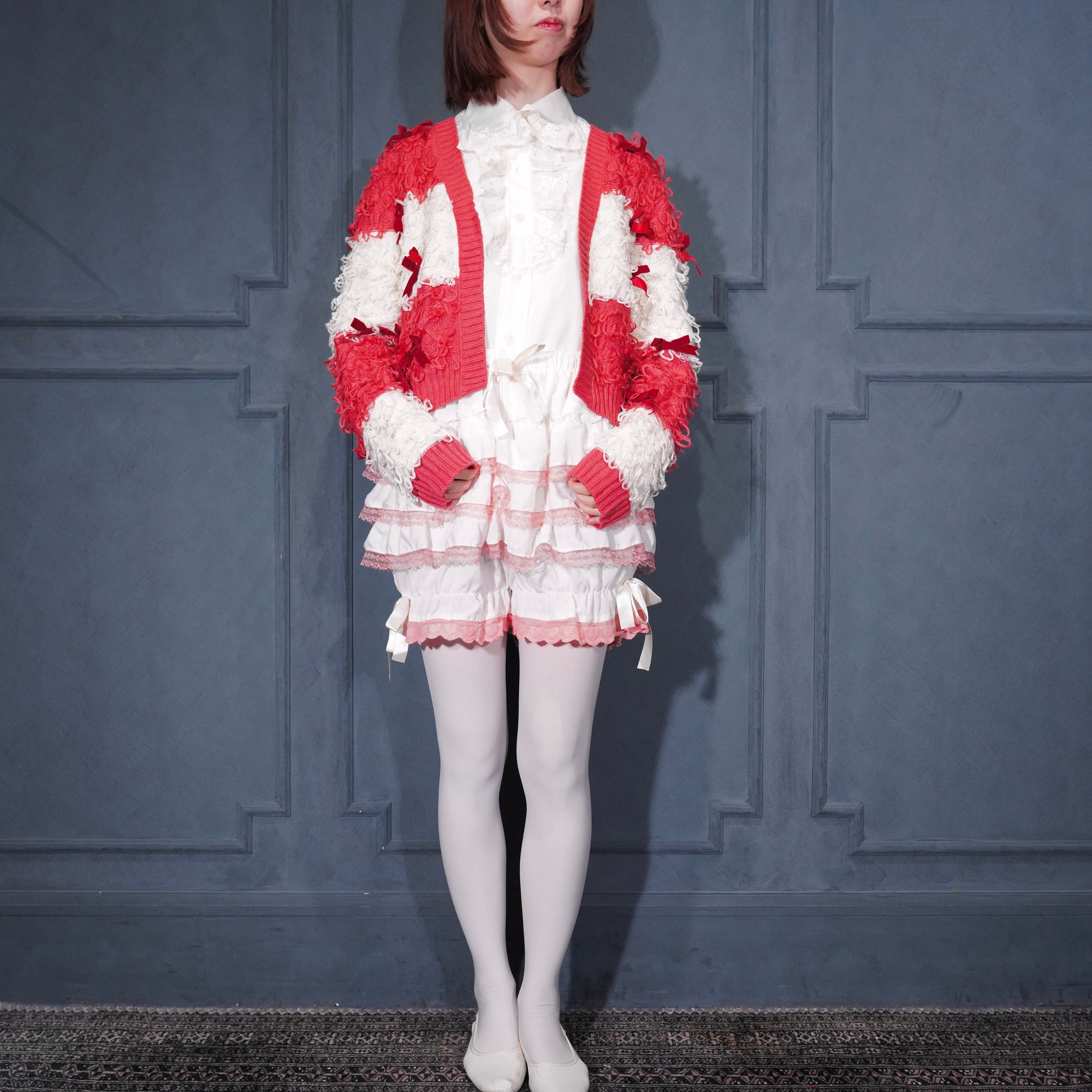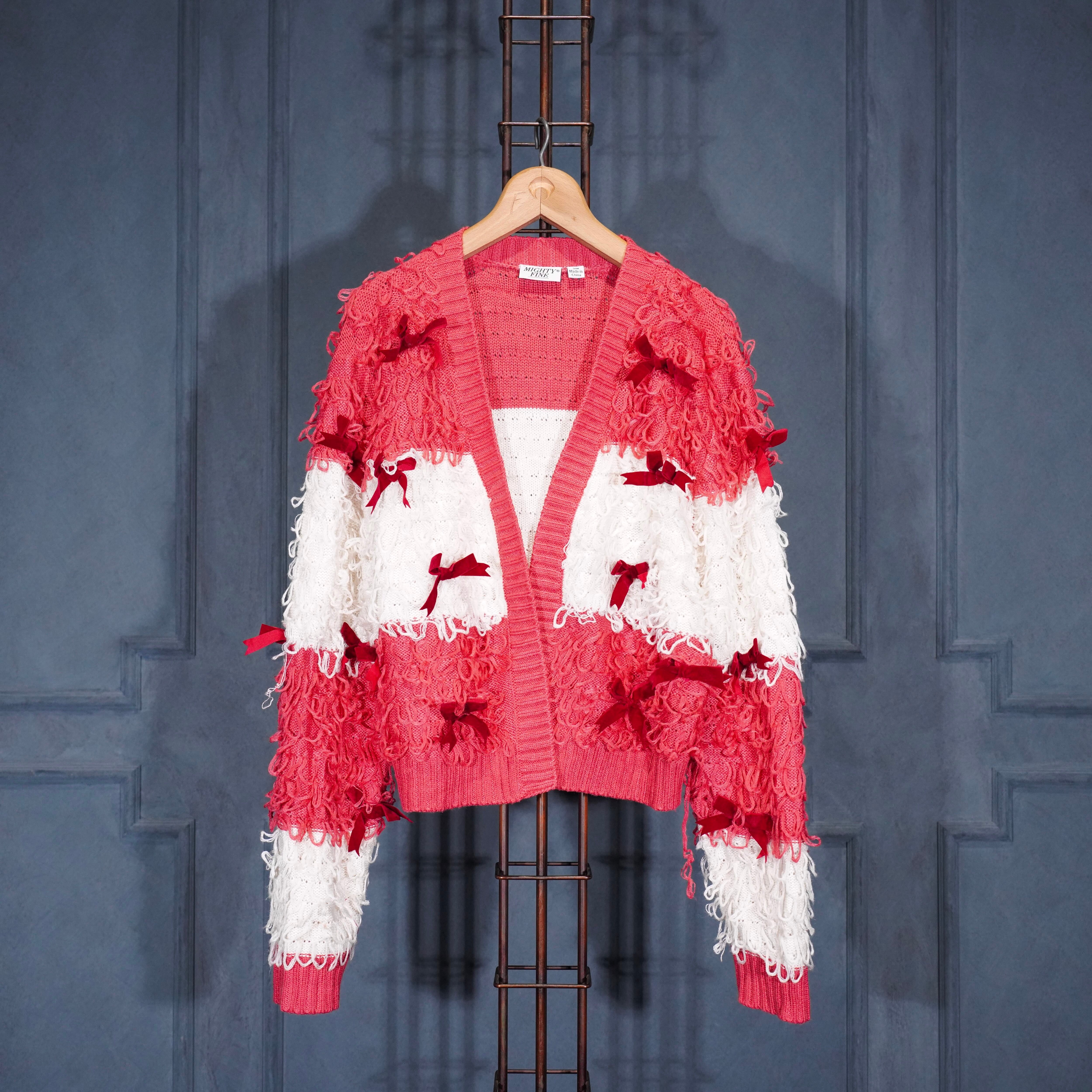 USA VINTAGE MIGHTY FINE RIBBON DESIGN SHAGGY KNIT CARDIGAN/アメリカ古着リボンデザインシャギーニットカーディガン