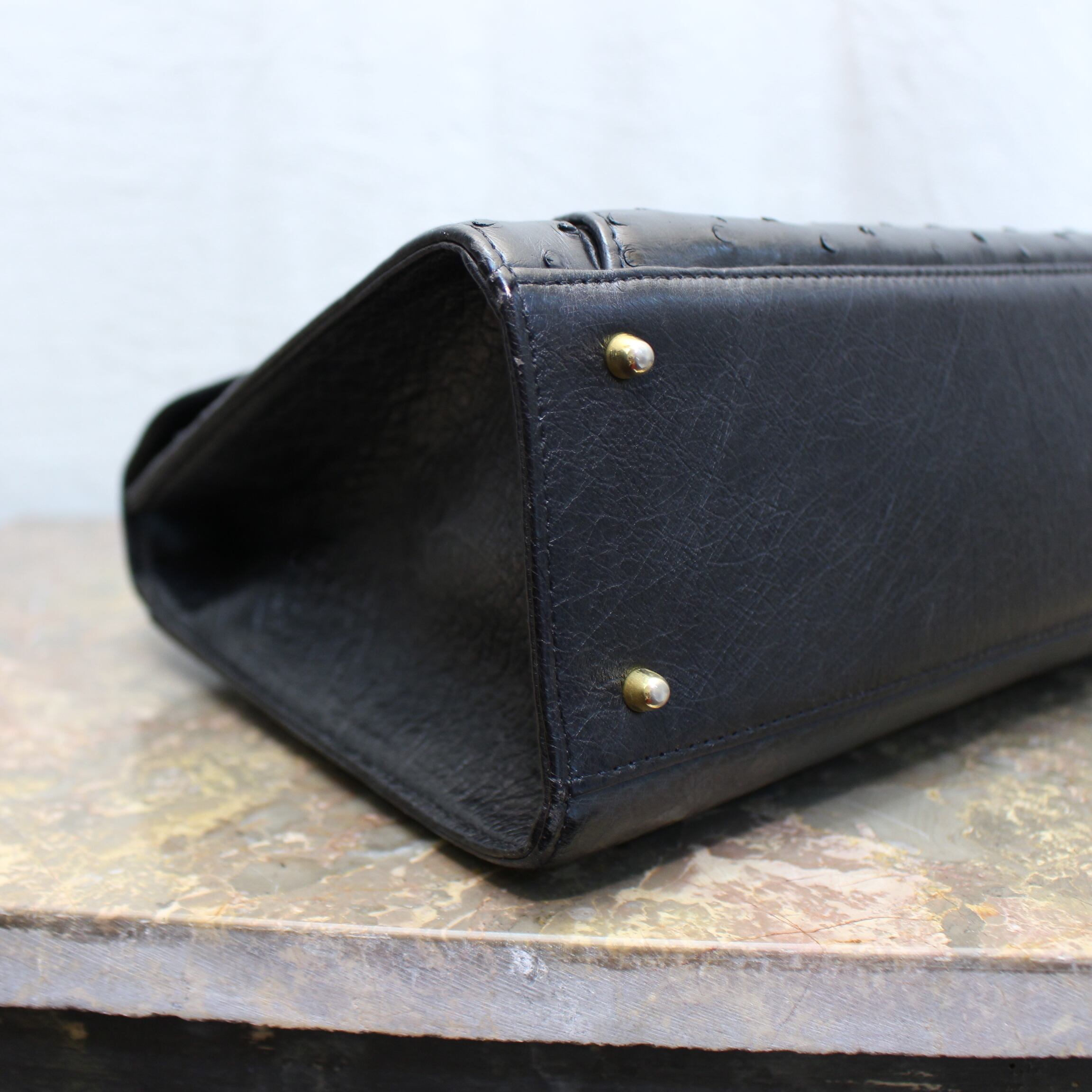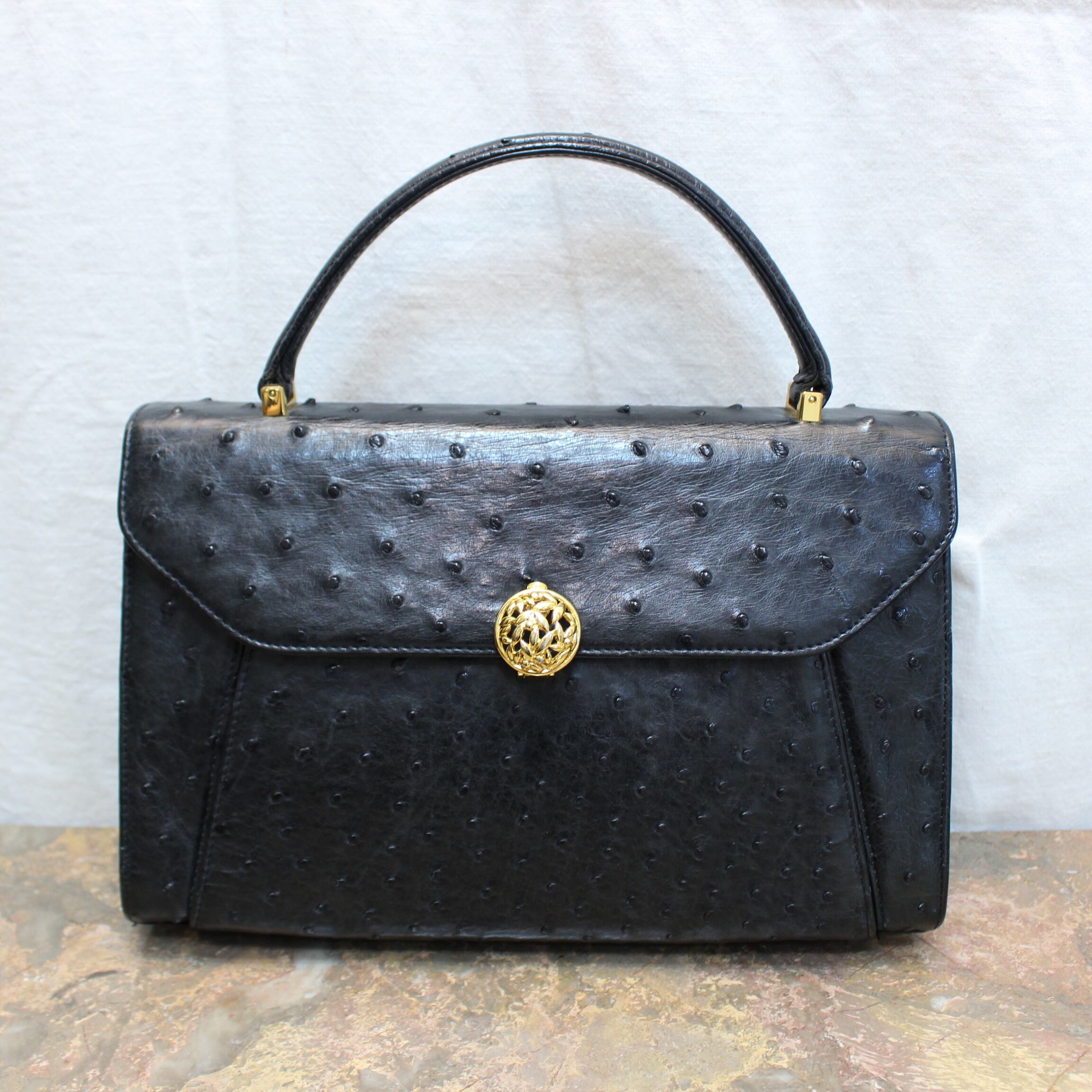 上質なオーストリッチレザーを使用したハンドバッグ。フロントの金具が高級感があり、オンオフ問わず使えるバッグです。