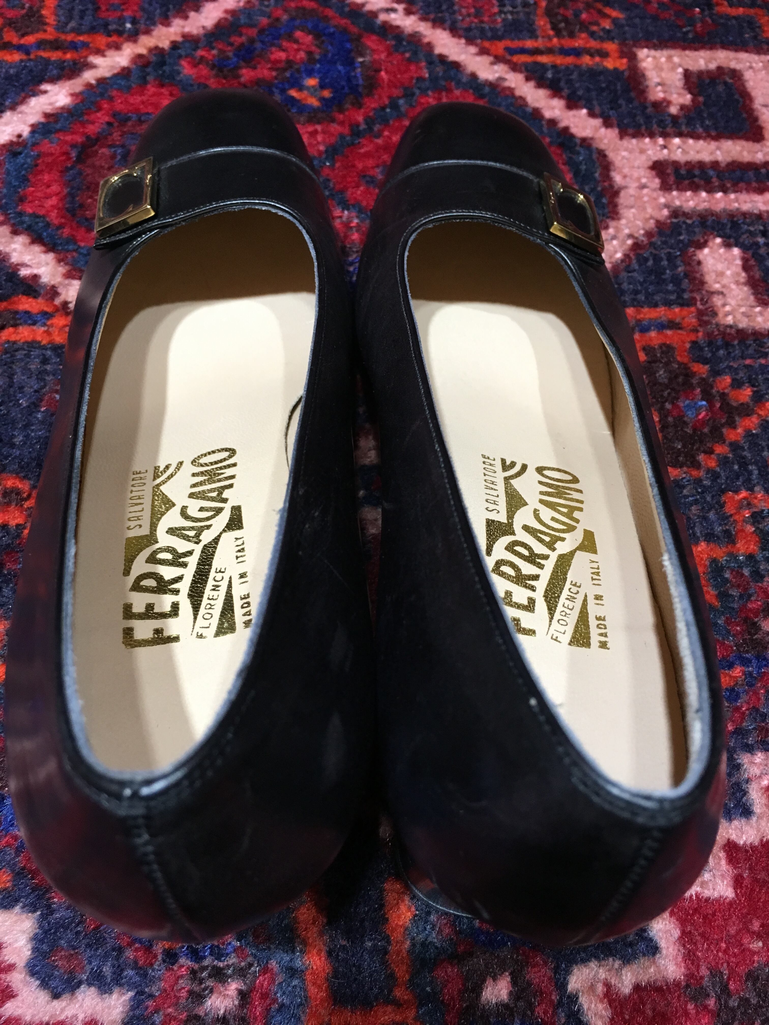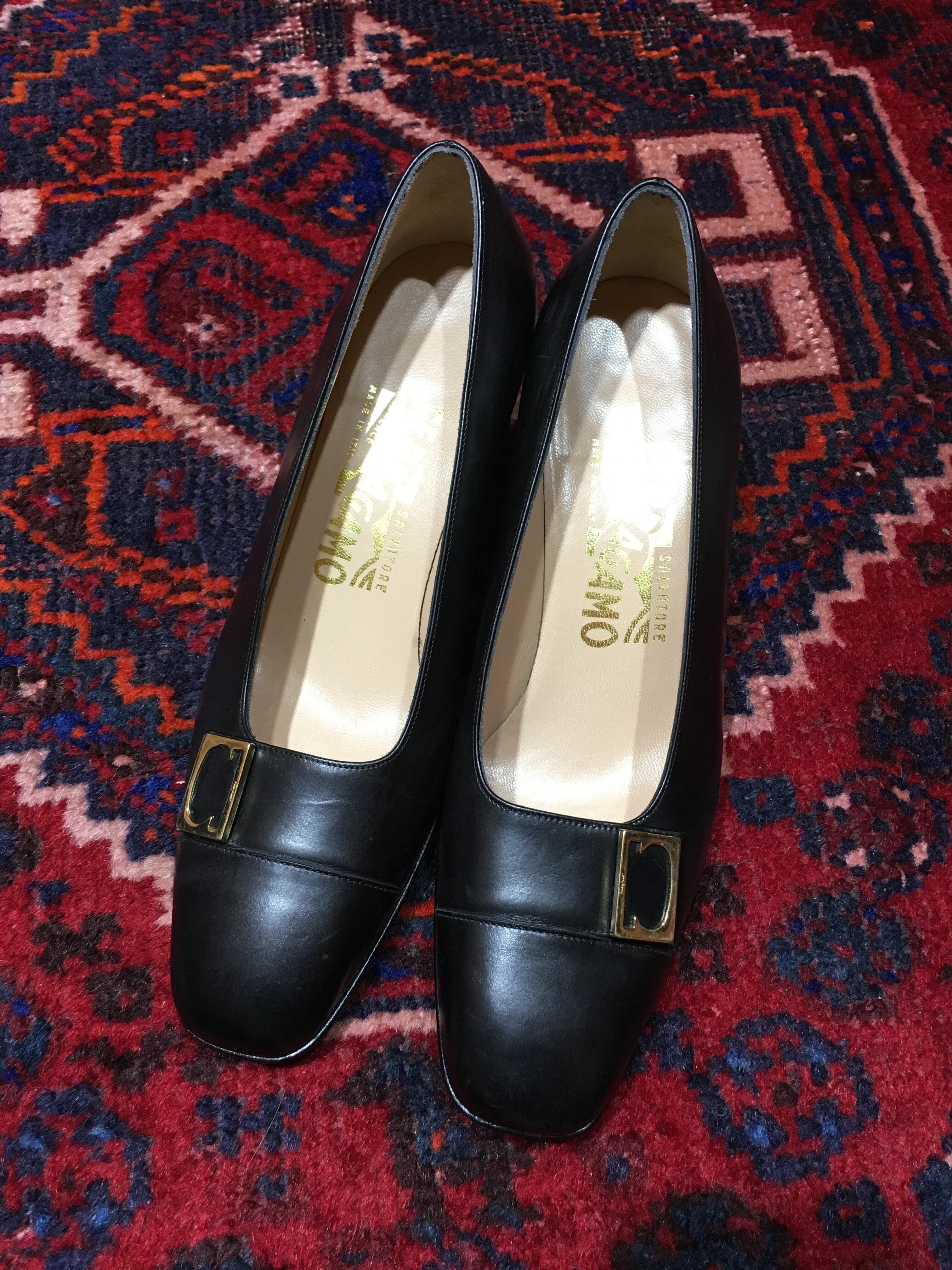 人気のSalvatore Ferragamoのレザーパンプス。フロントには金具がついたモデルです。アッパーには硬めのすべすべしたレザーを使用しています。こちらもレトロライクですが今っぽく合わせられるペアです。
