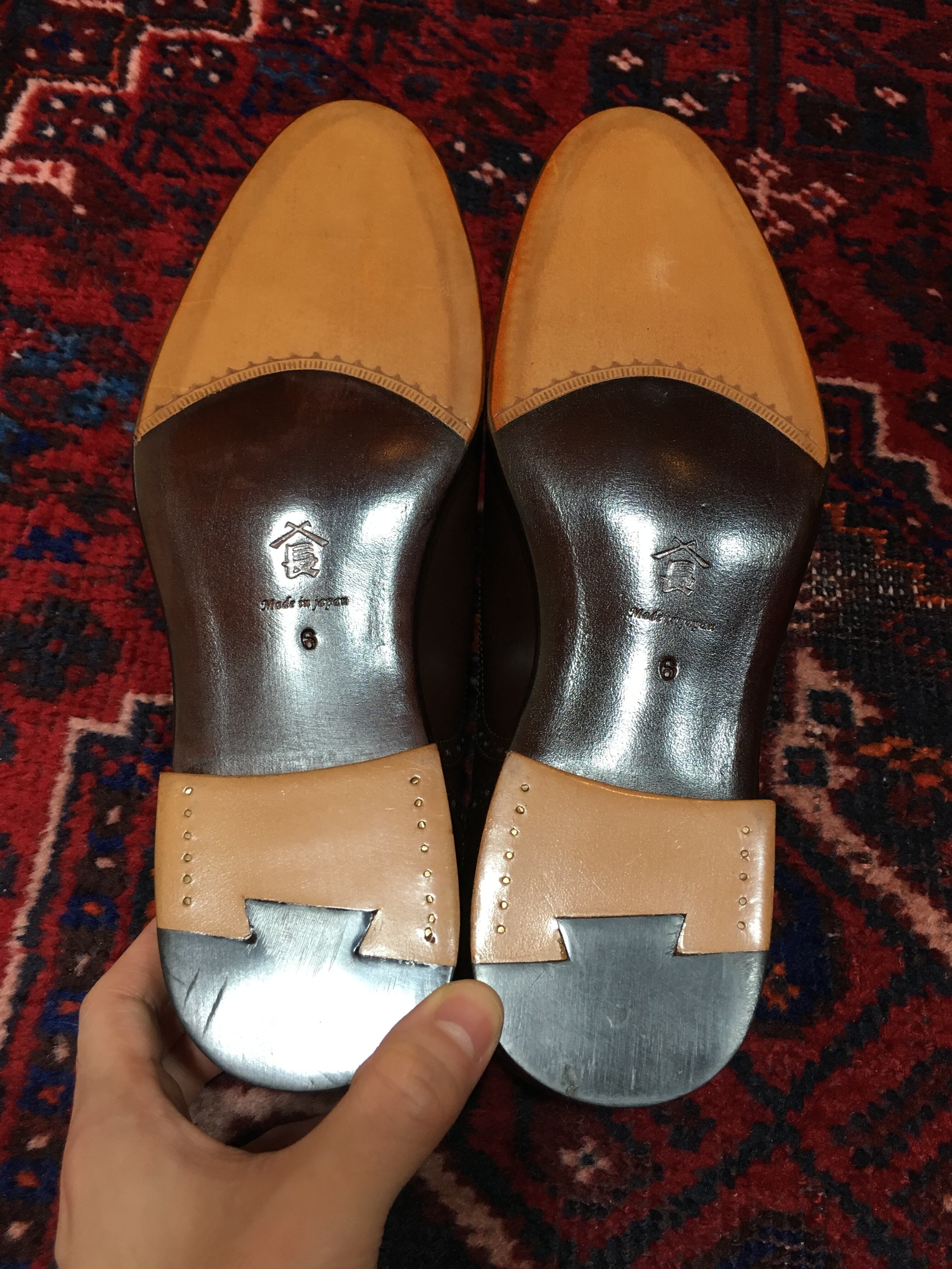 人気ブランド三陽山長。控えめなメダリオンが品の良いペア。何といってもアッパーの革質が極上で、みずみずしく、光沢が出しやすいペアです。こんがり焼いたパンのようなアンティークの風合いが素敵で合わせるものを選ばないペアです。