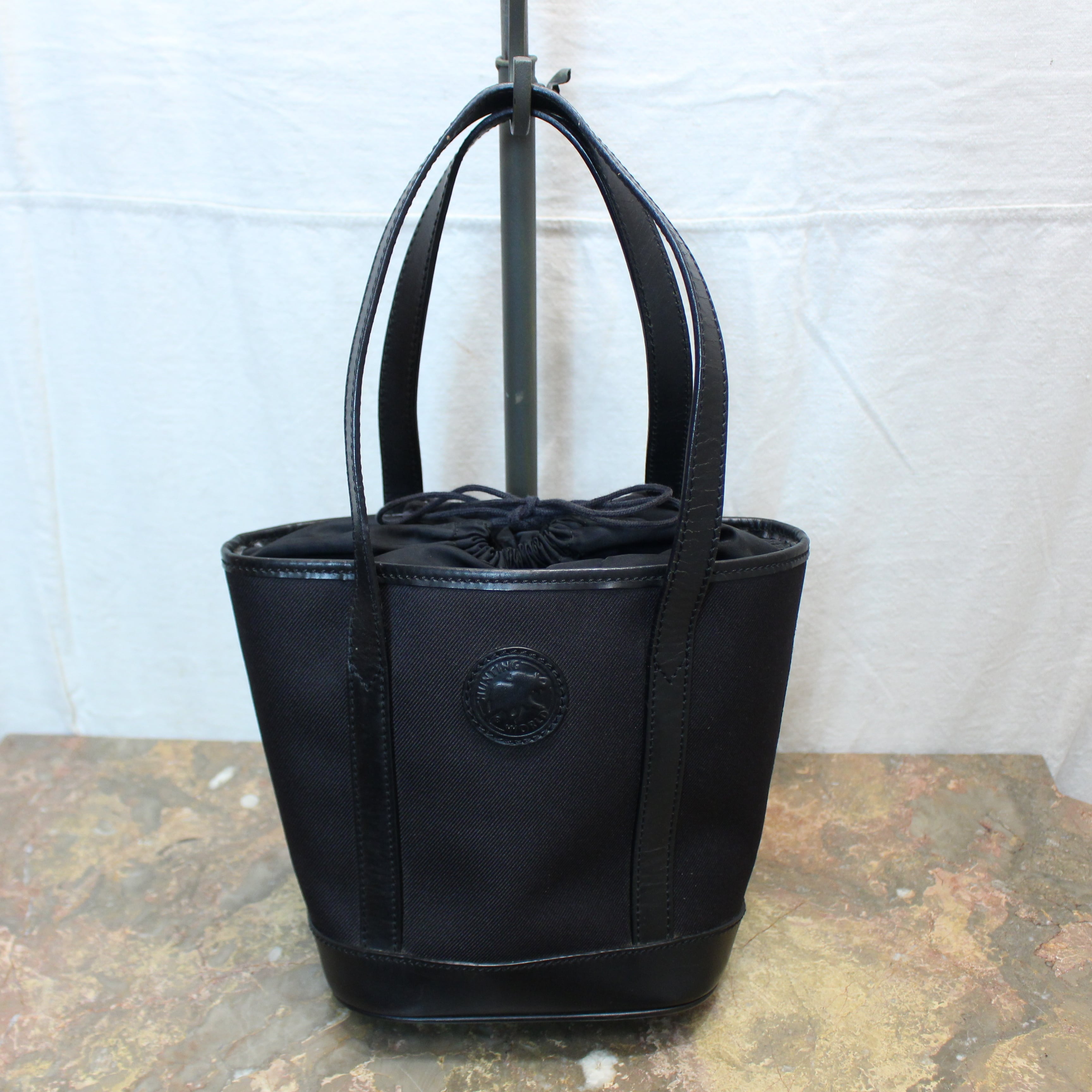 しっかりとしたキャンバス生地とレザーを使用したバッグ。バケツ型の可愛いフォルムで合わせやすいバッグです。
