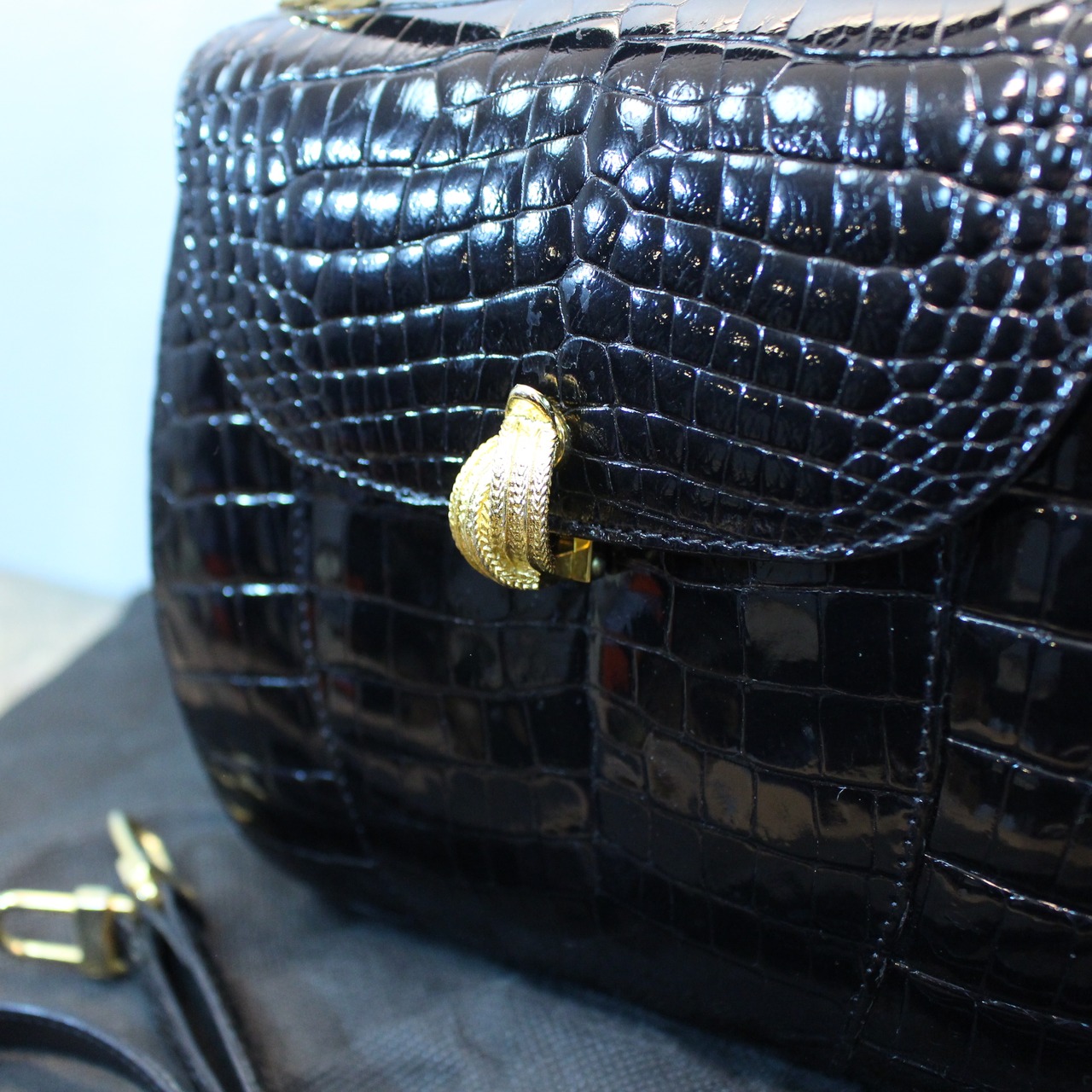 革の王様、革の宝石とも呼べるクロコダイルレザーを使用したバッグ。非常に高額で、物によっては数百万円も普通です。こちらは上質なシャイニングクロコダイルを使用したバッグ。光沢があり、光にあたると宝石のように輝きます。2way仕様で、気分に応じて使い分け可能です。フロント金具のデザインが素敵で、高級感があります。