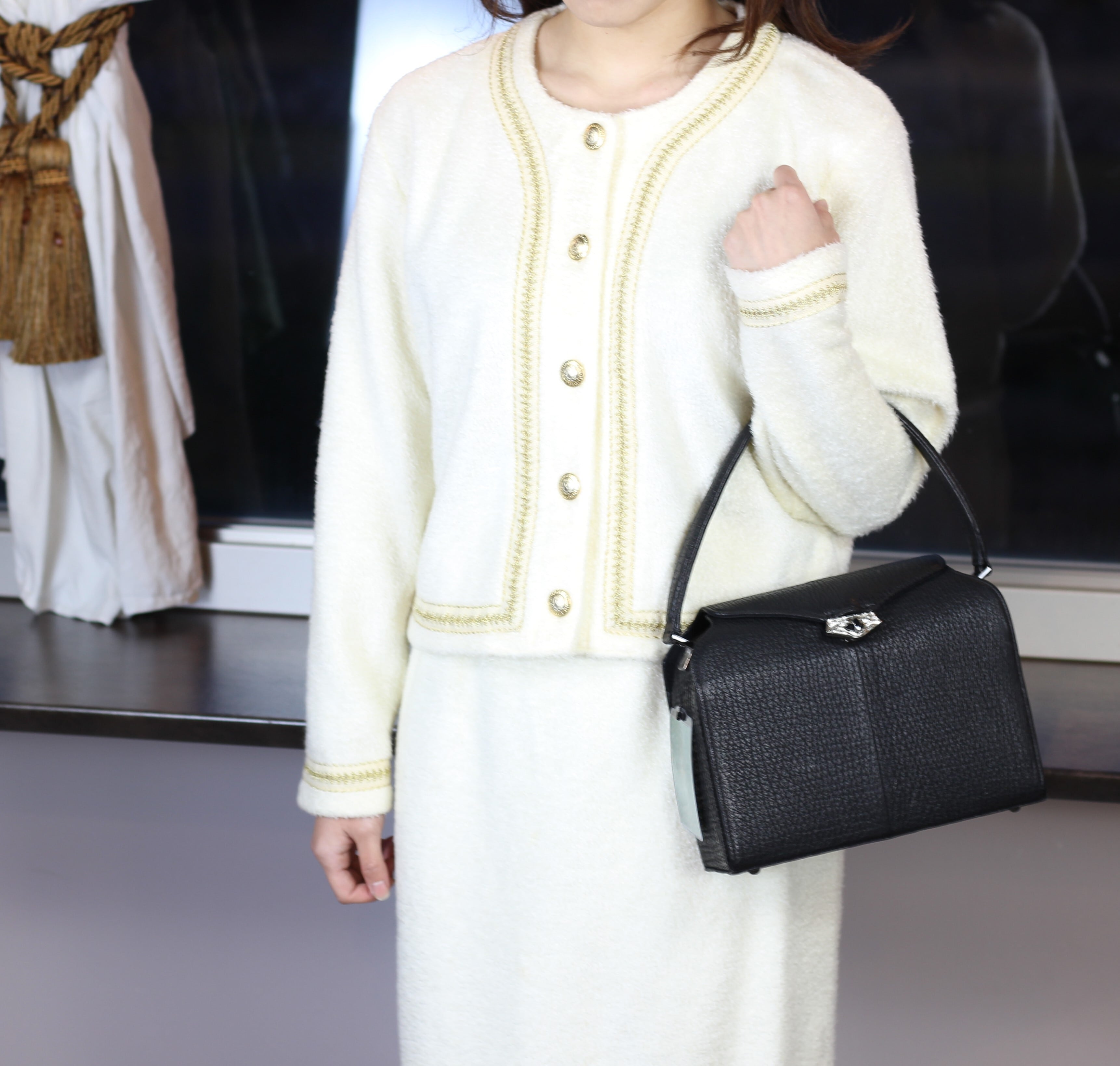 安心のJRAマークがついたエキゾチックレザー、サメ革のバッグ。