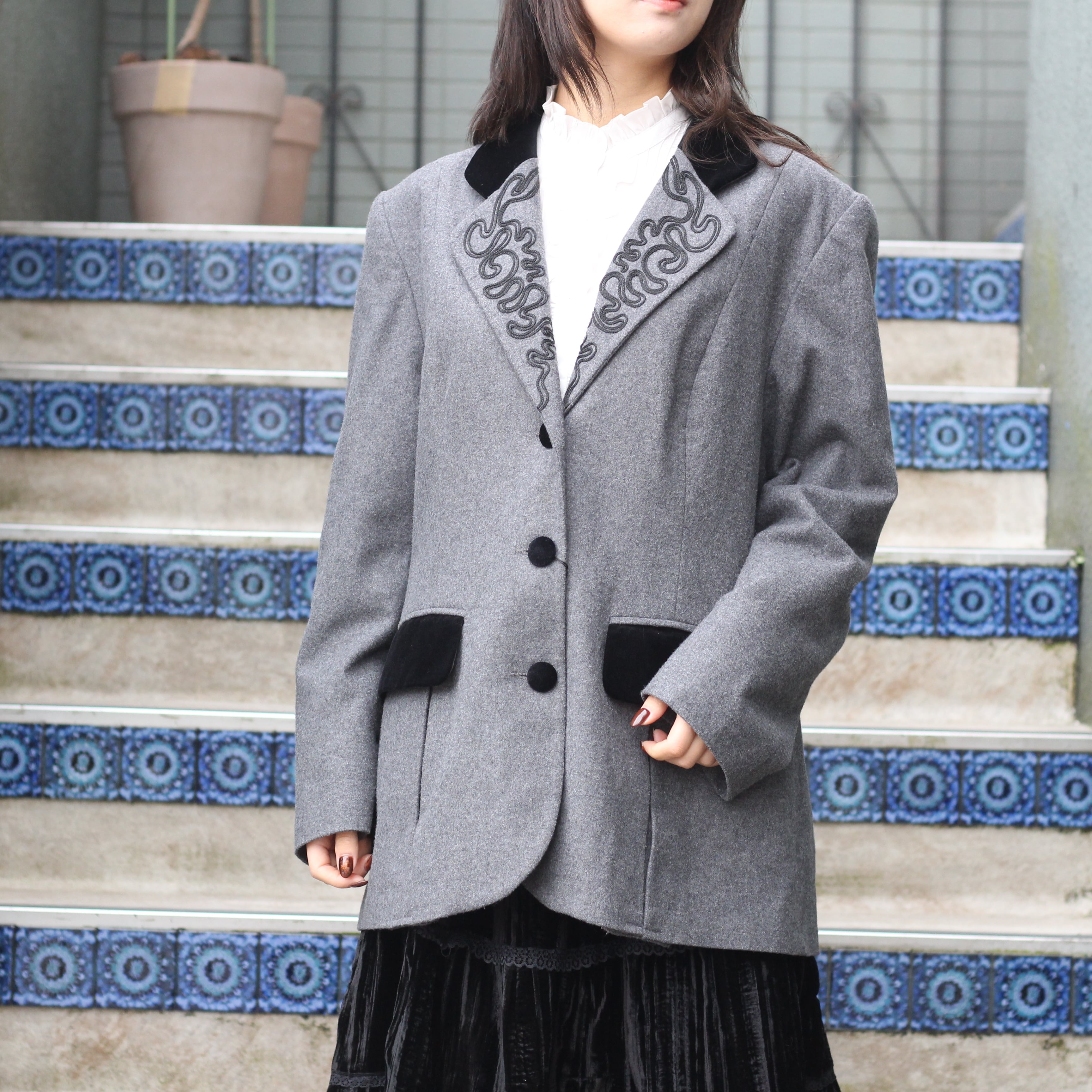 EU VINTAGE Kendyia EMBROIDERY VELOUR PIPING WOOL DESIGN JACKET/ヨーロッパ古着刺繍ベロアパイピングウールデザインジャケット