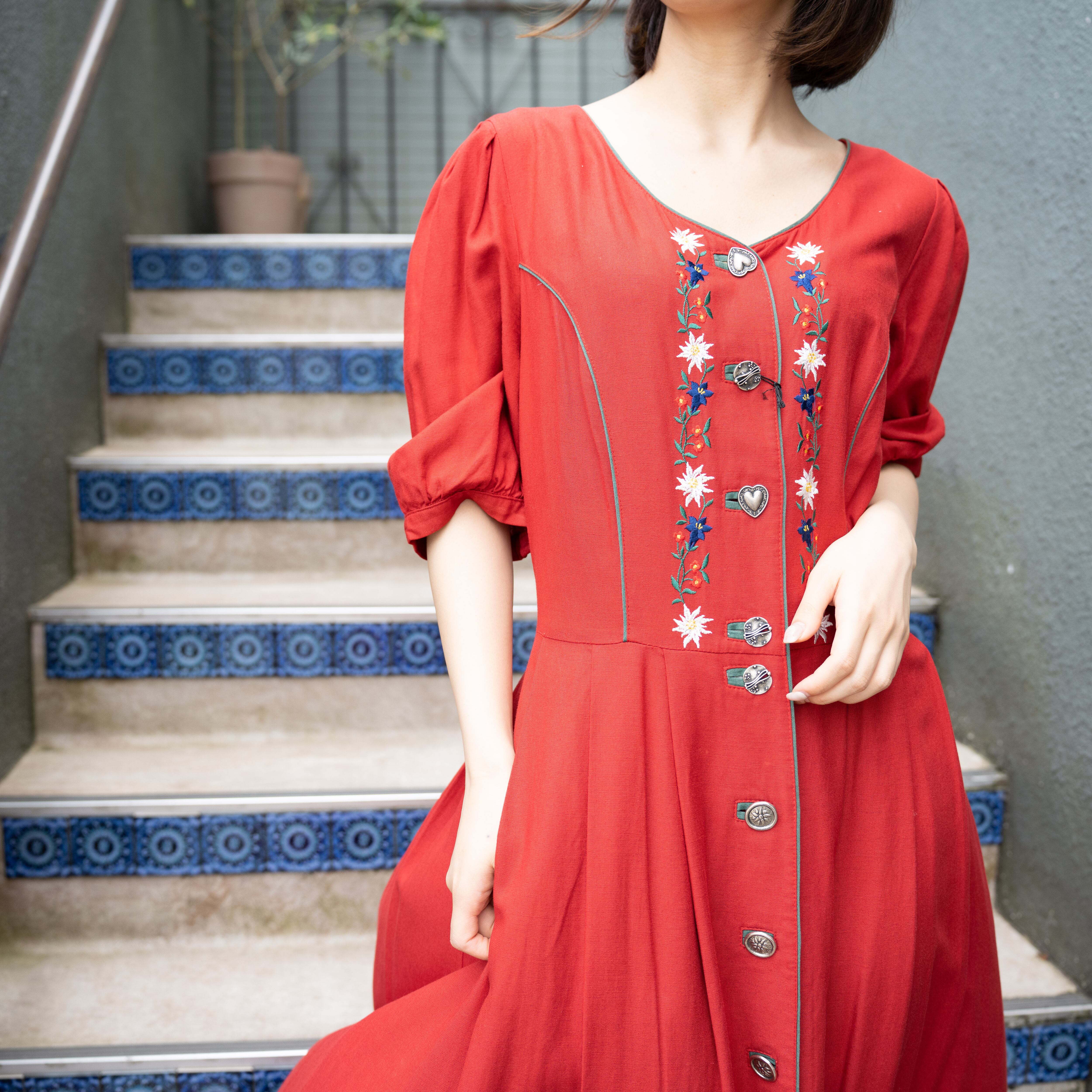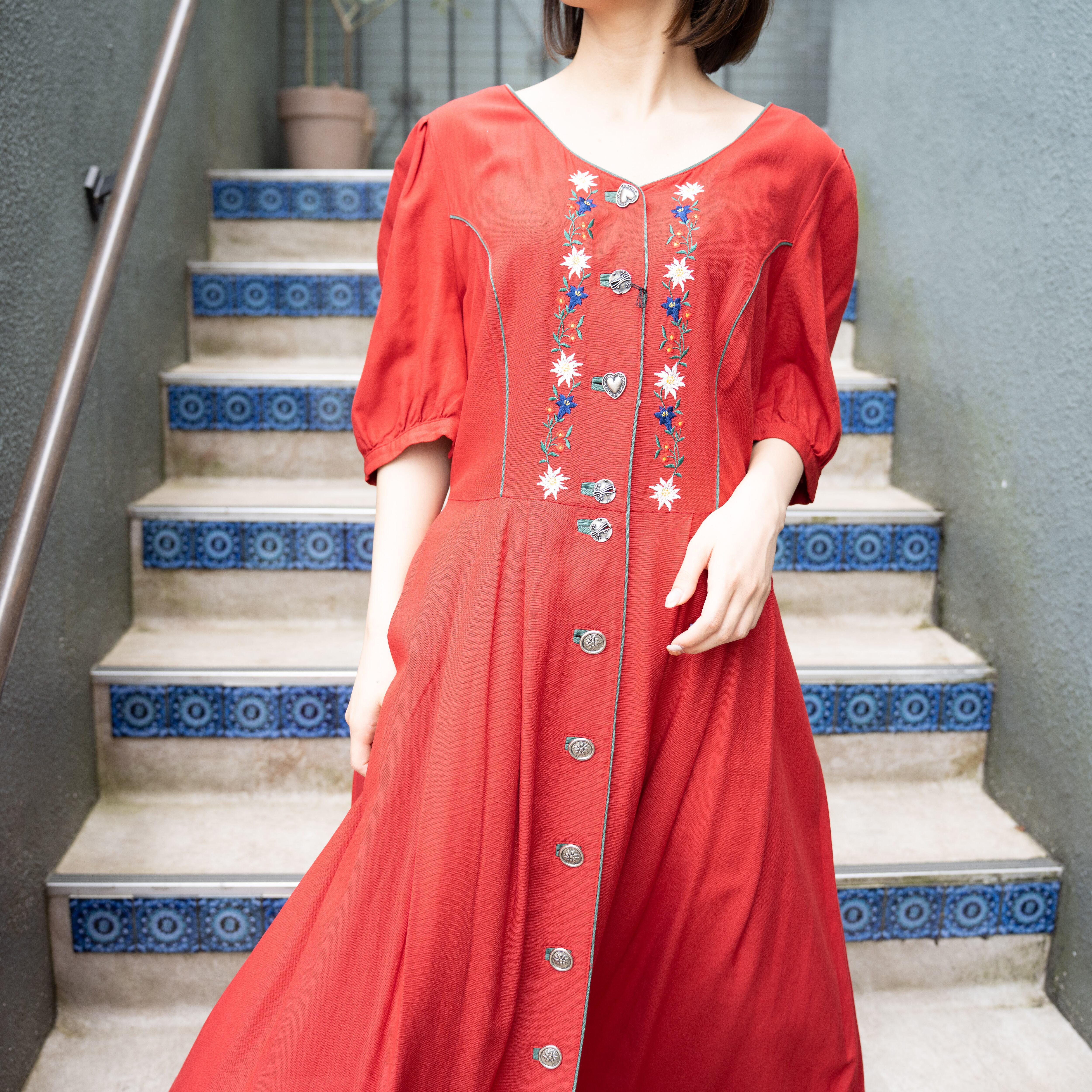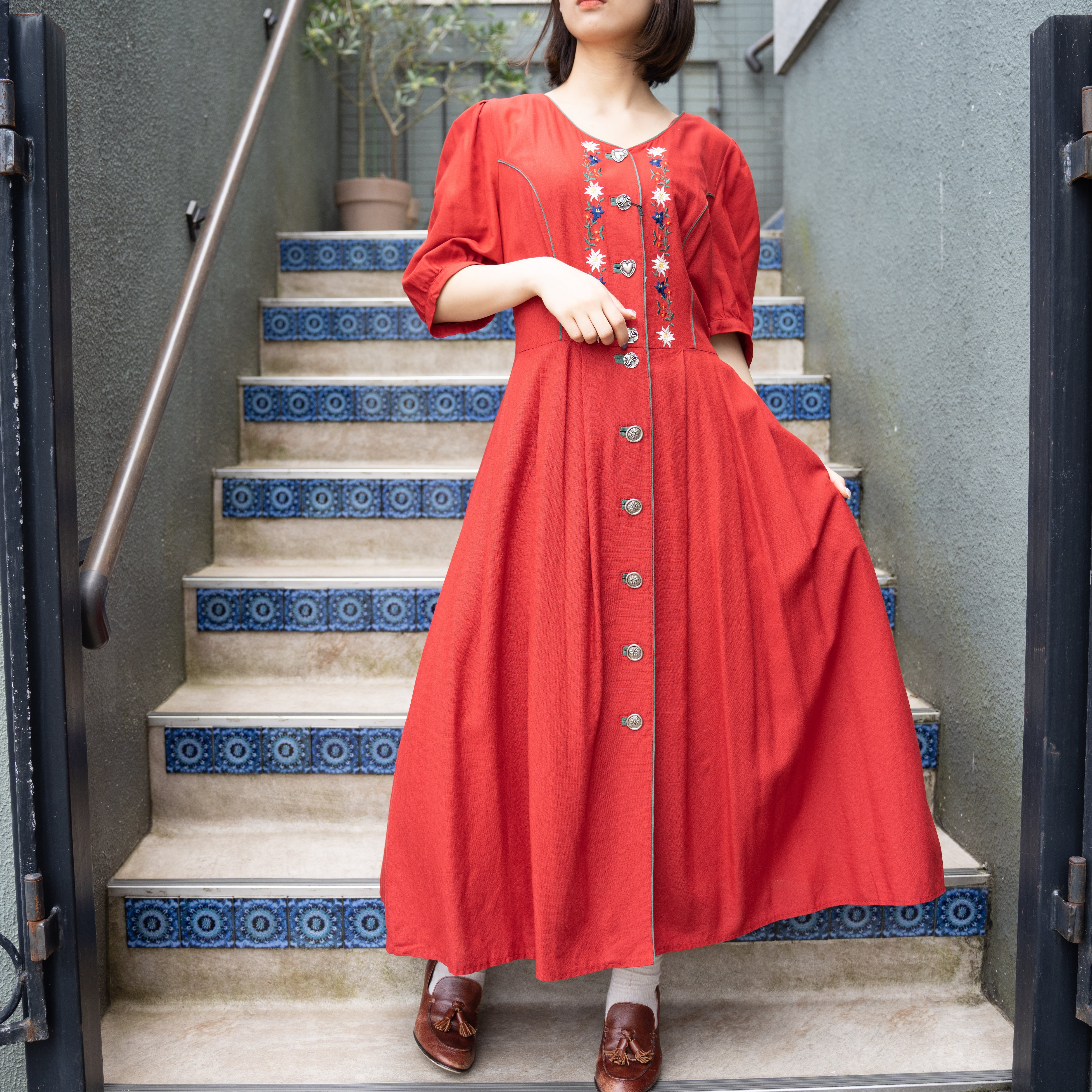 EU VINTAGE METAL BUTTON EMBROIDERY DESIGN TYROLEAN ONE PIECE/ヨーロッパ古着メタルボタン刺繍デザインチロリアンワンピース
