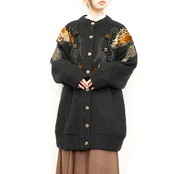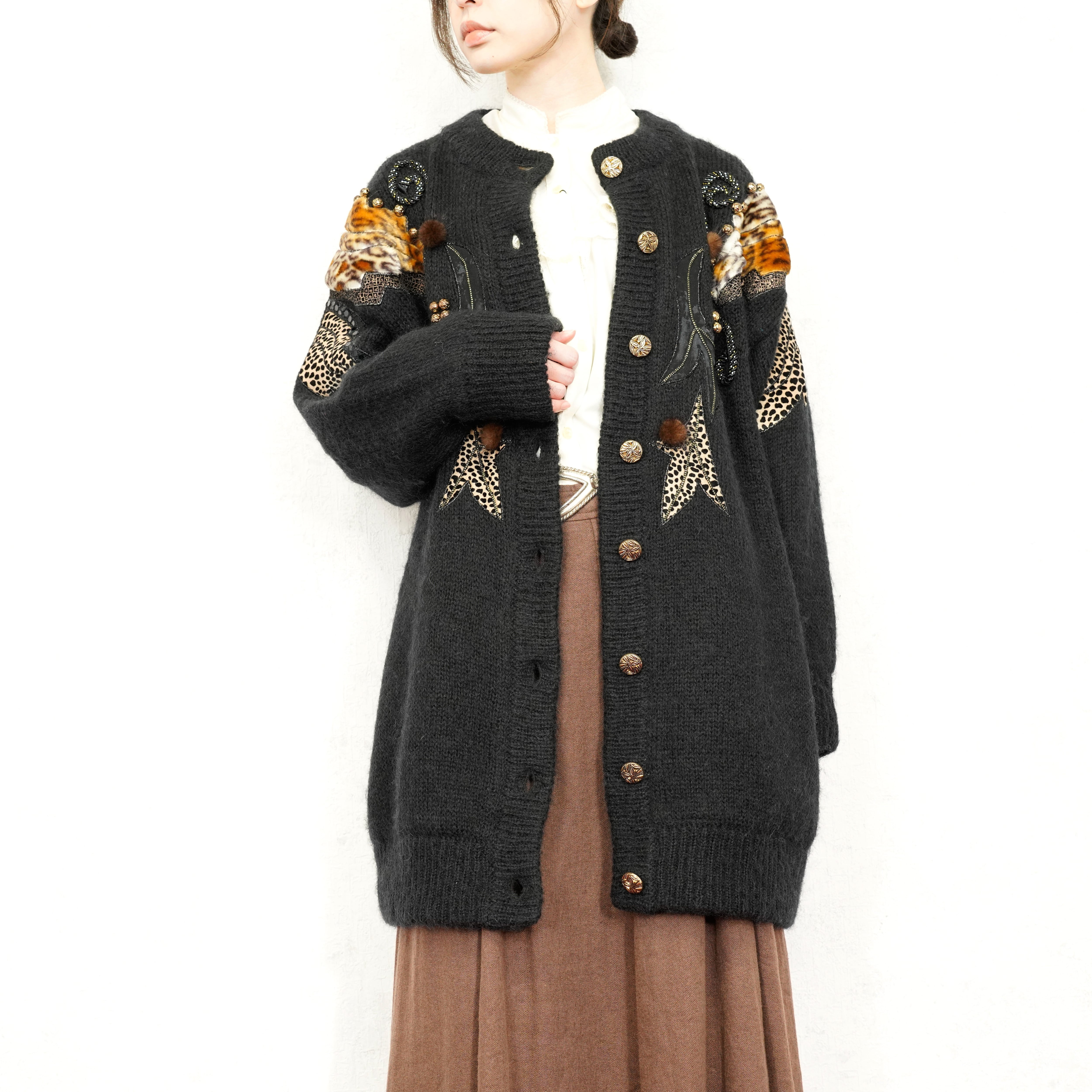 USA VINTAGE VELOUR EMBROIDERY SWITCHED DESIGN MOHAIR KNIT LONG CARDIGAN/アメリカ古着ベロア刺繍切替デザインモヘアニットロングカーディガン