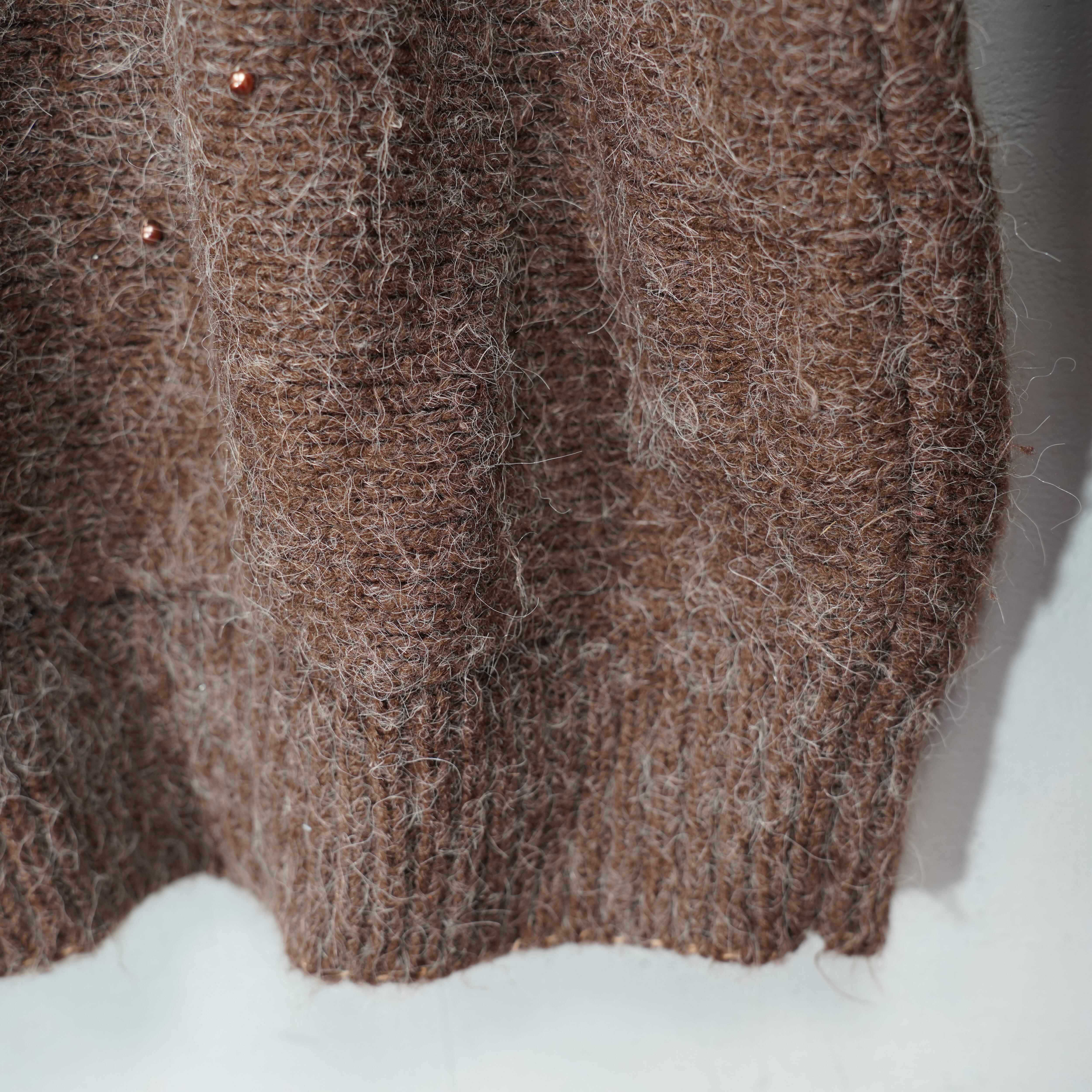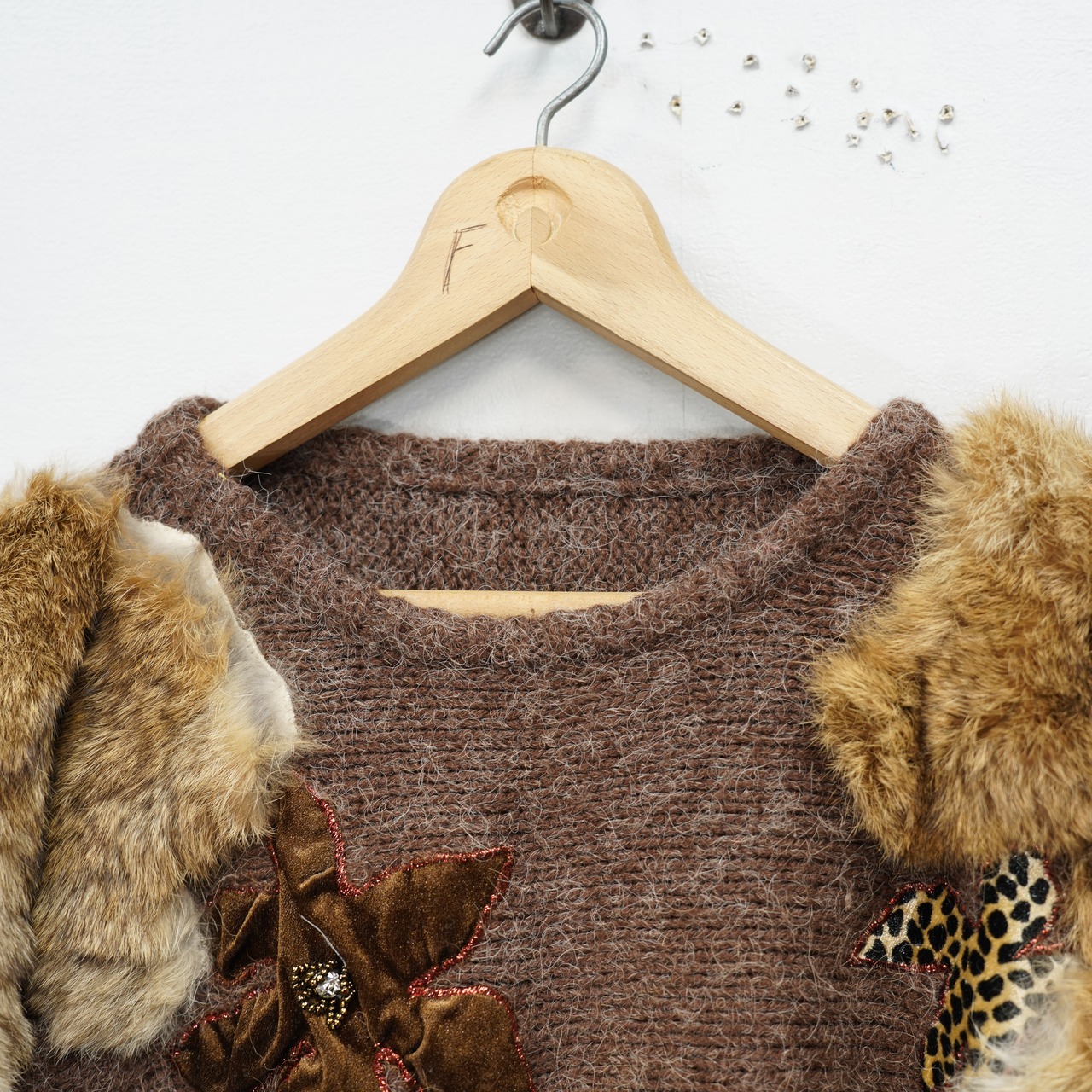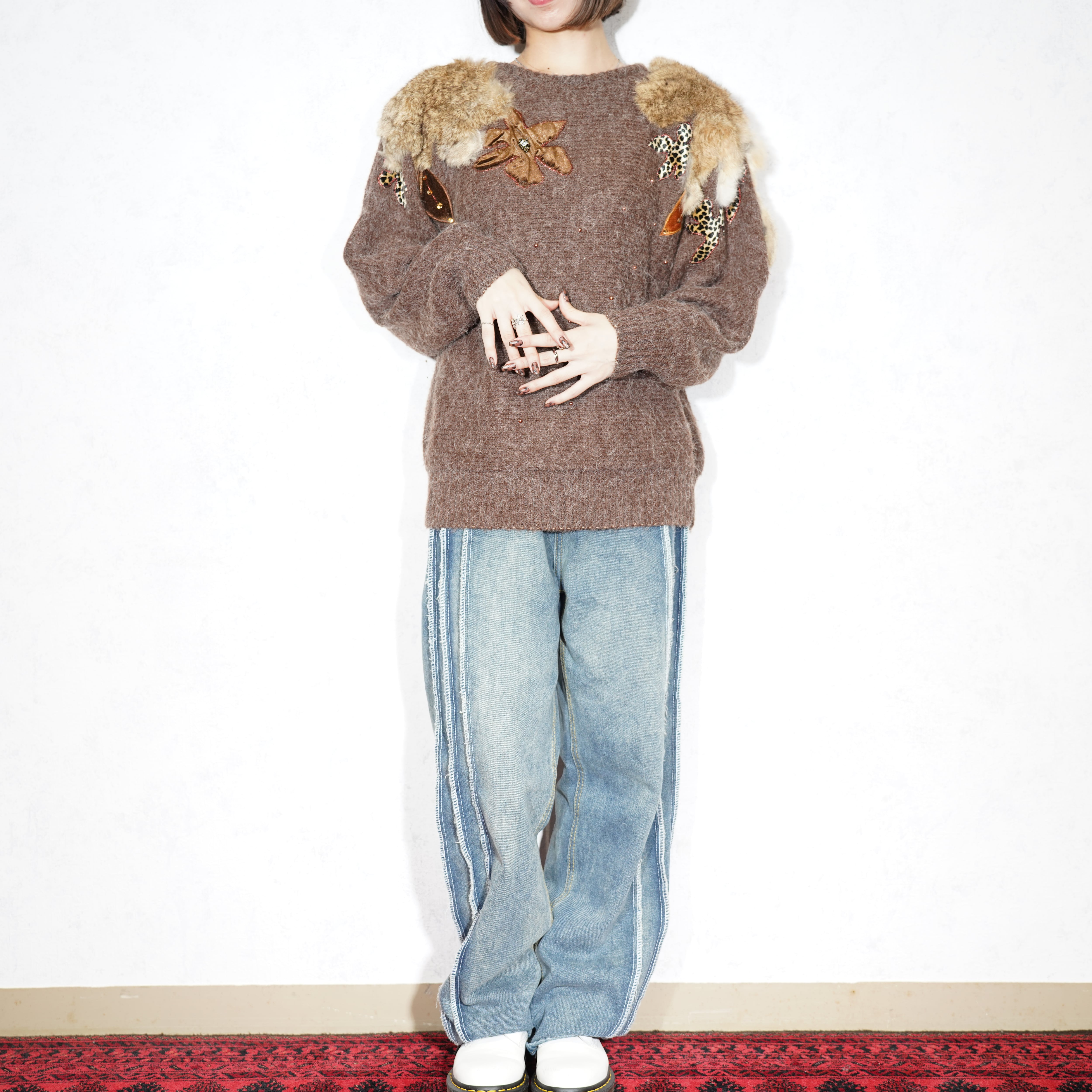 EU VINTAGE FUR LEATHER PATCH DESIGN KNIT/ヨーロッパ古着ファーレザーパッチデザインニット