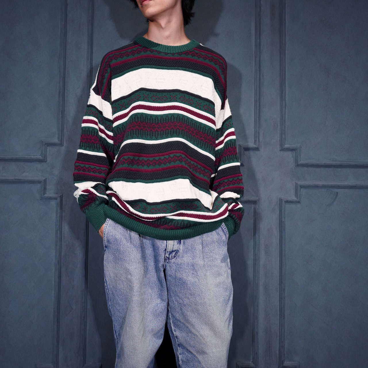 USA VINTAGE Munsingwear Lifestyle MULTI BORDER 3D DESIGN COTTON KNIT MADE IN USA/アメリカ古着マルチボーダー3Dデザインニット