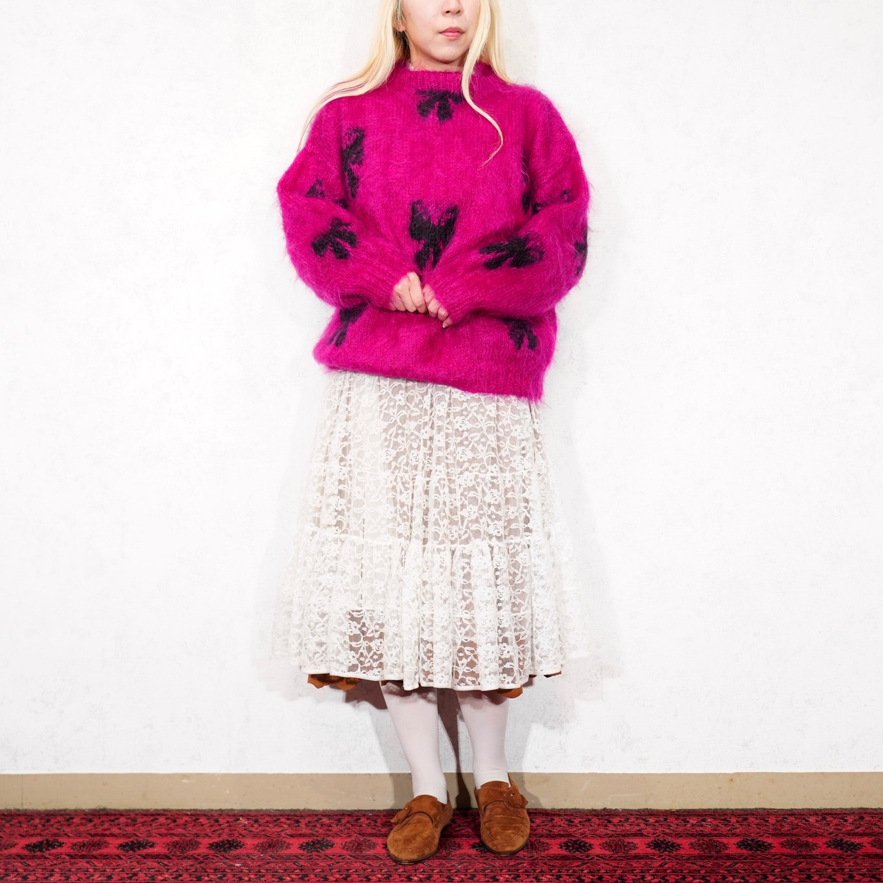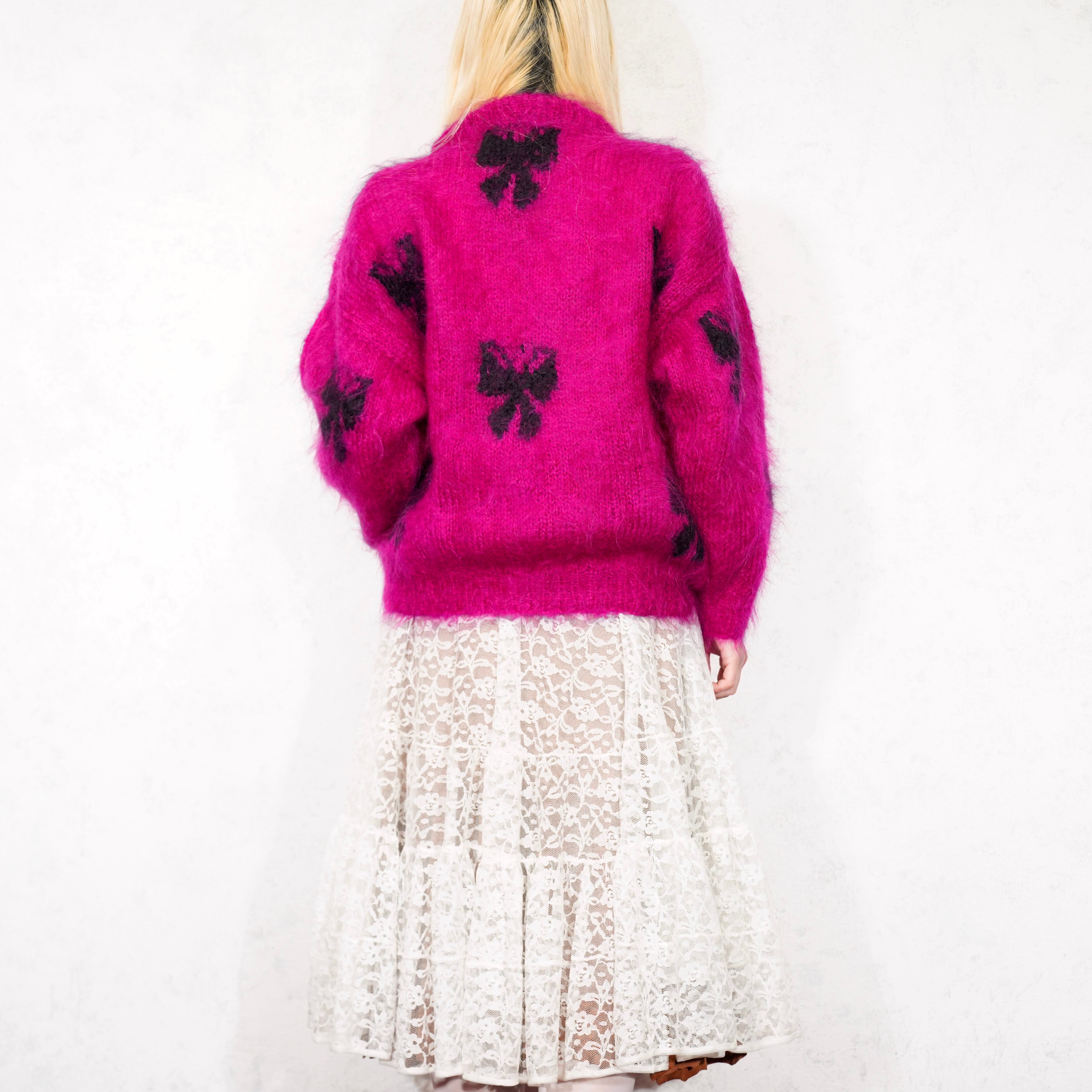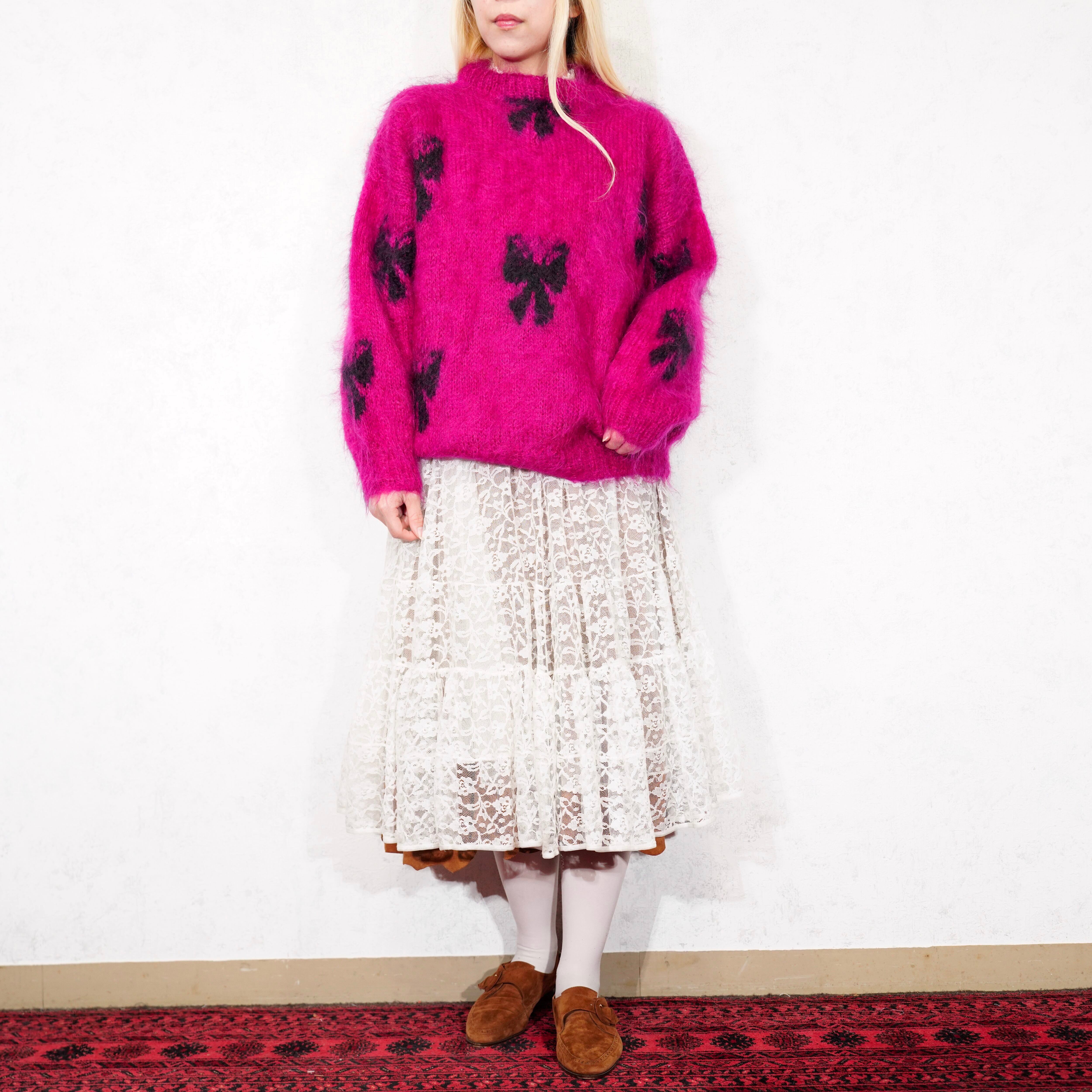 *SPECIAL ITEM* EU VINTAGE myra GARVEY RIBBON PATTERNED LONG MOHAIR HAND KNIT MADE IN IRELAND/ヨーロッパ古着リボン柄ロングモヘアハンドニット