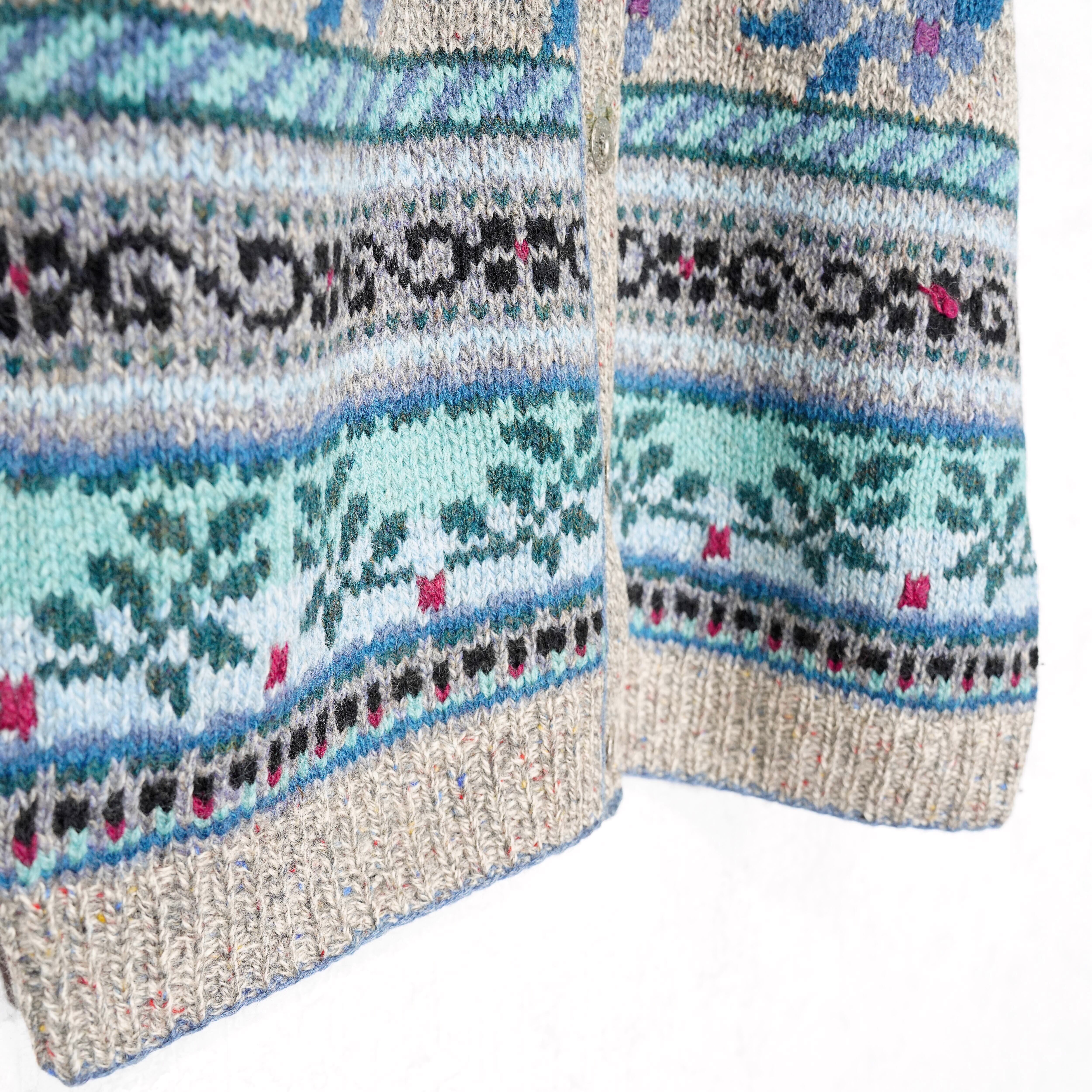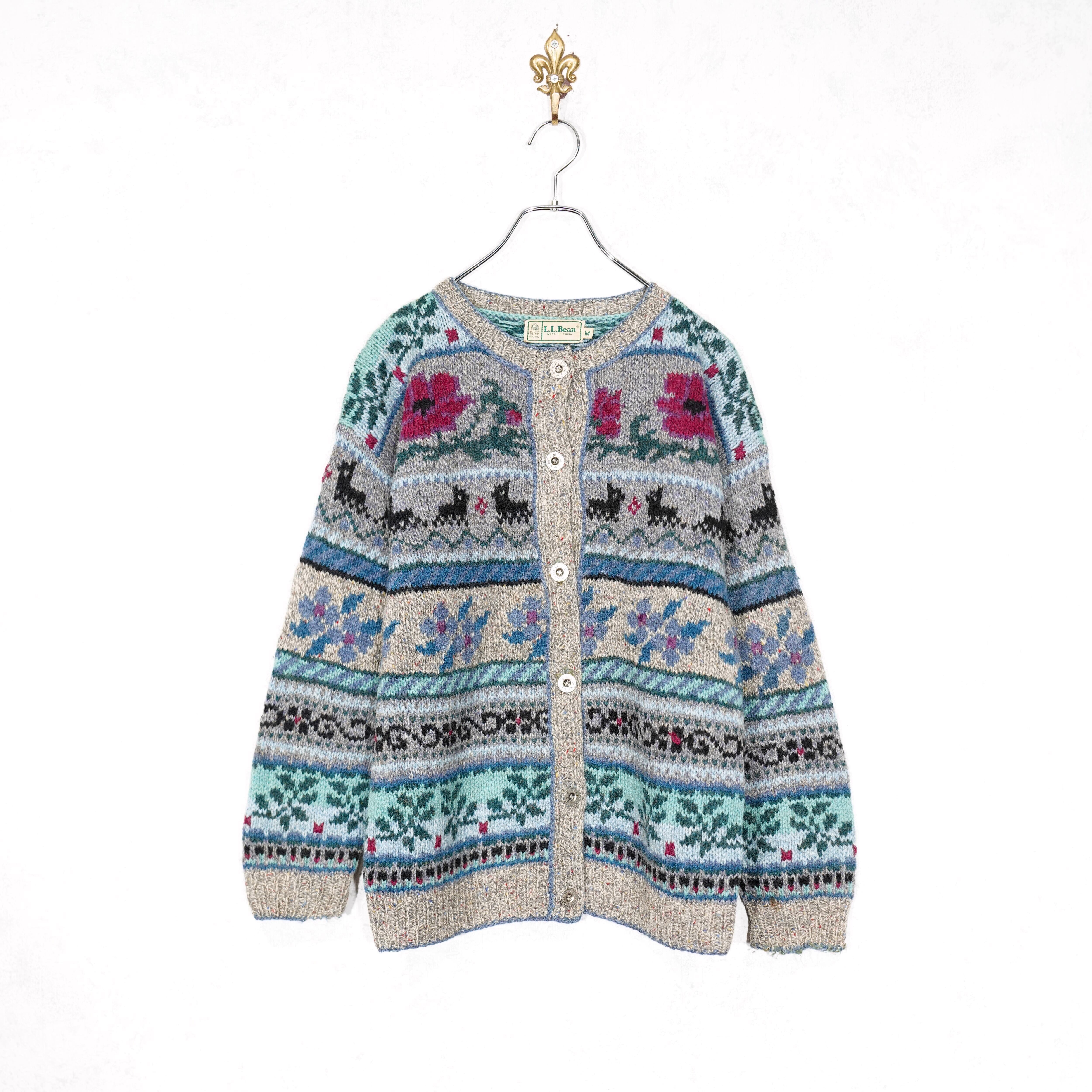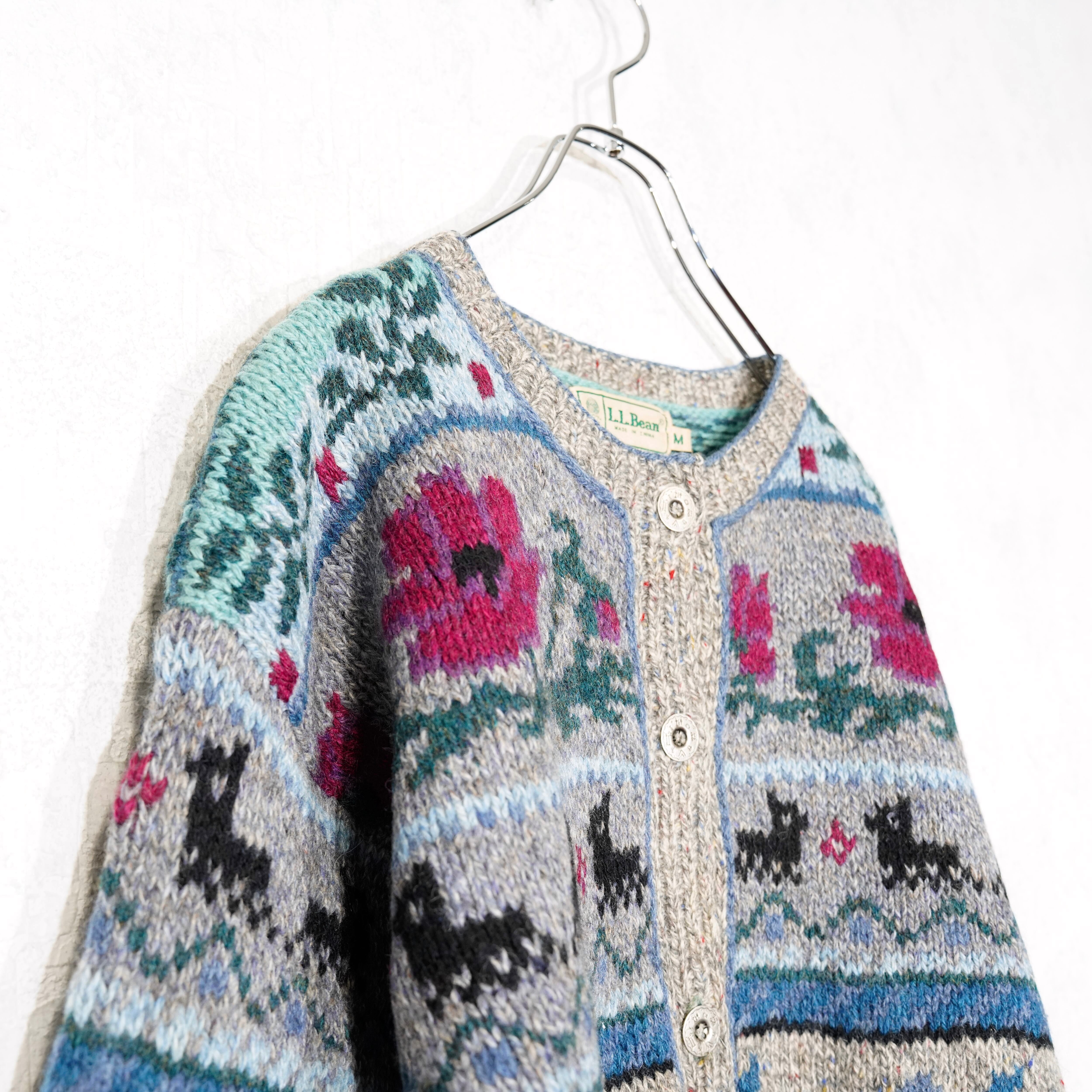 USA VINTAGE LL BEAN FLOWER ANIMAL PATTERNED DESIGN WOOL KNIT CARDIGAN/アメリカ古着エルエルビーンお花アニマル柄デザインニットカーディガン