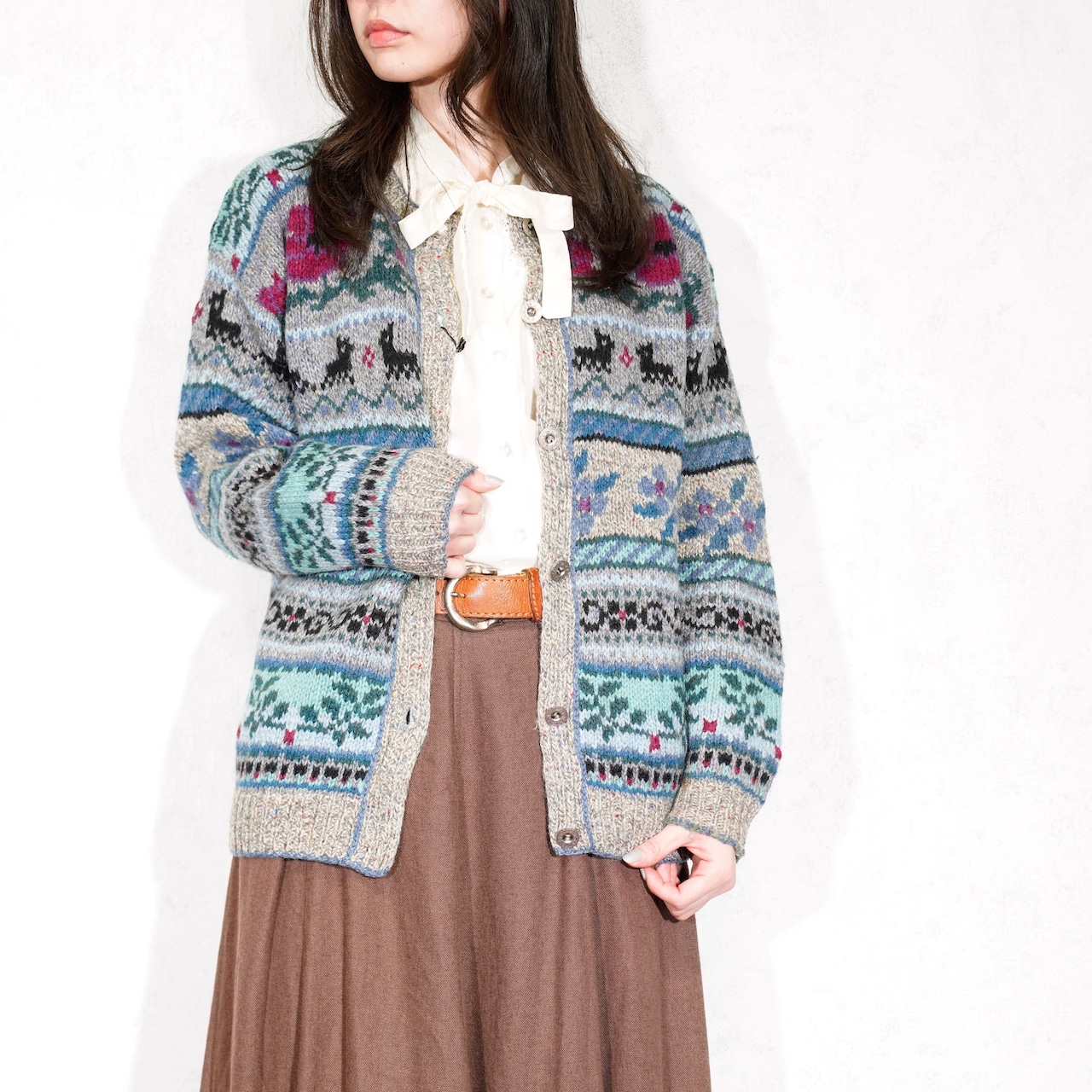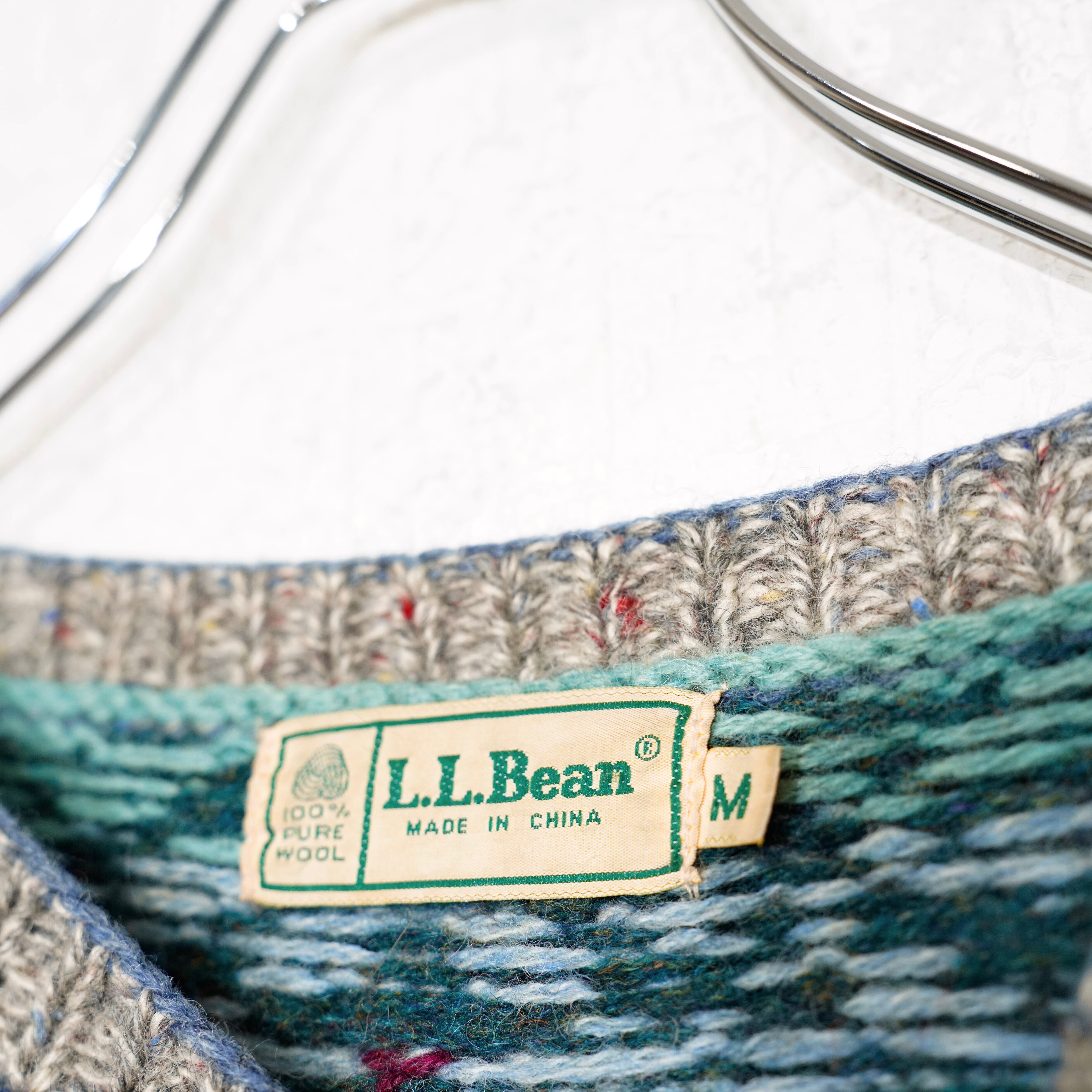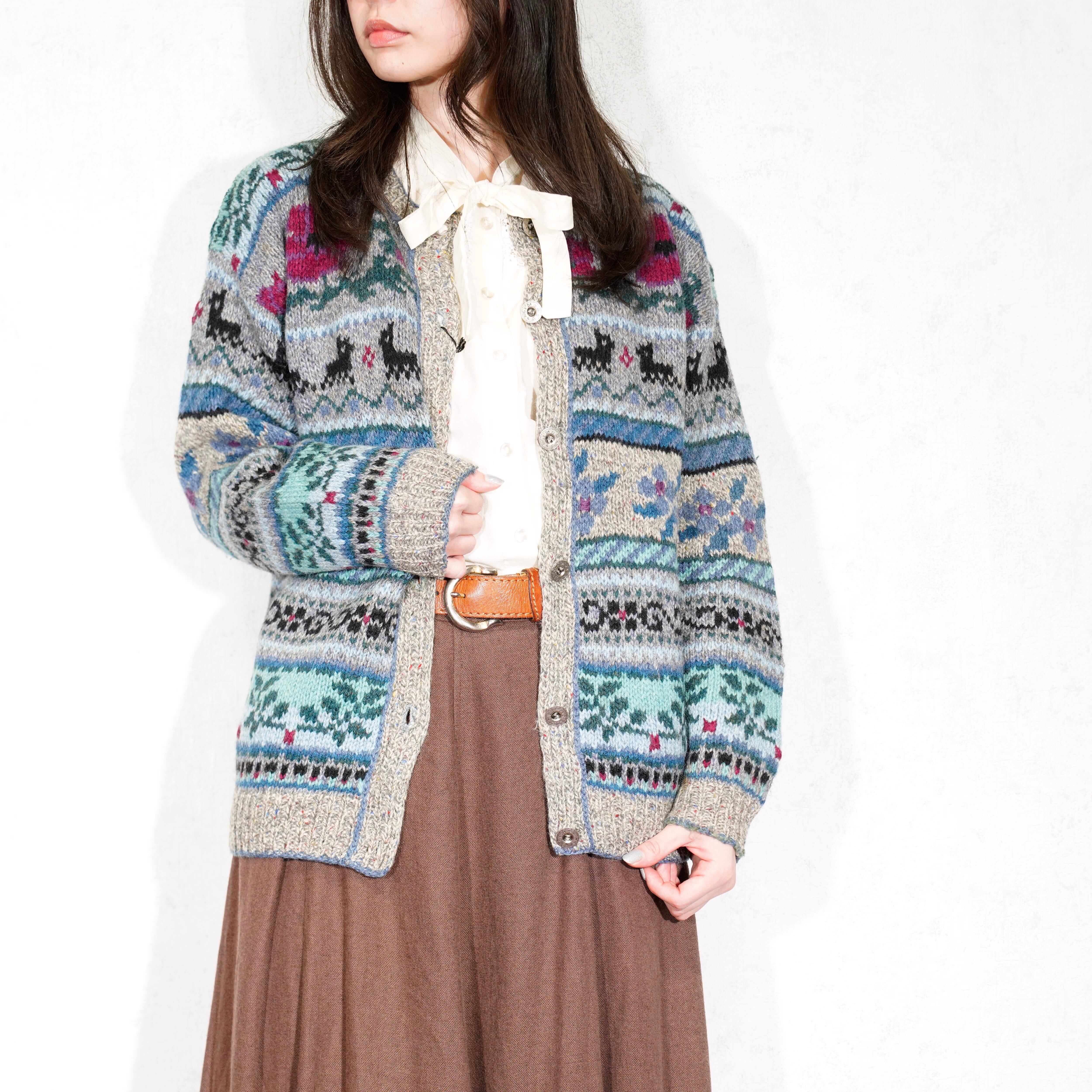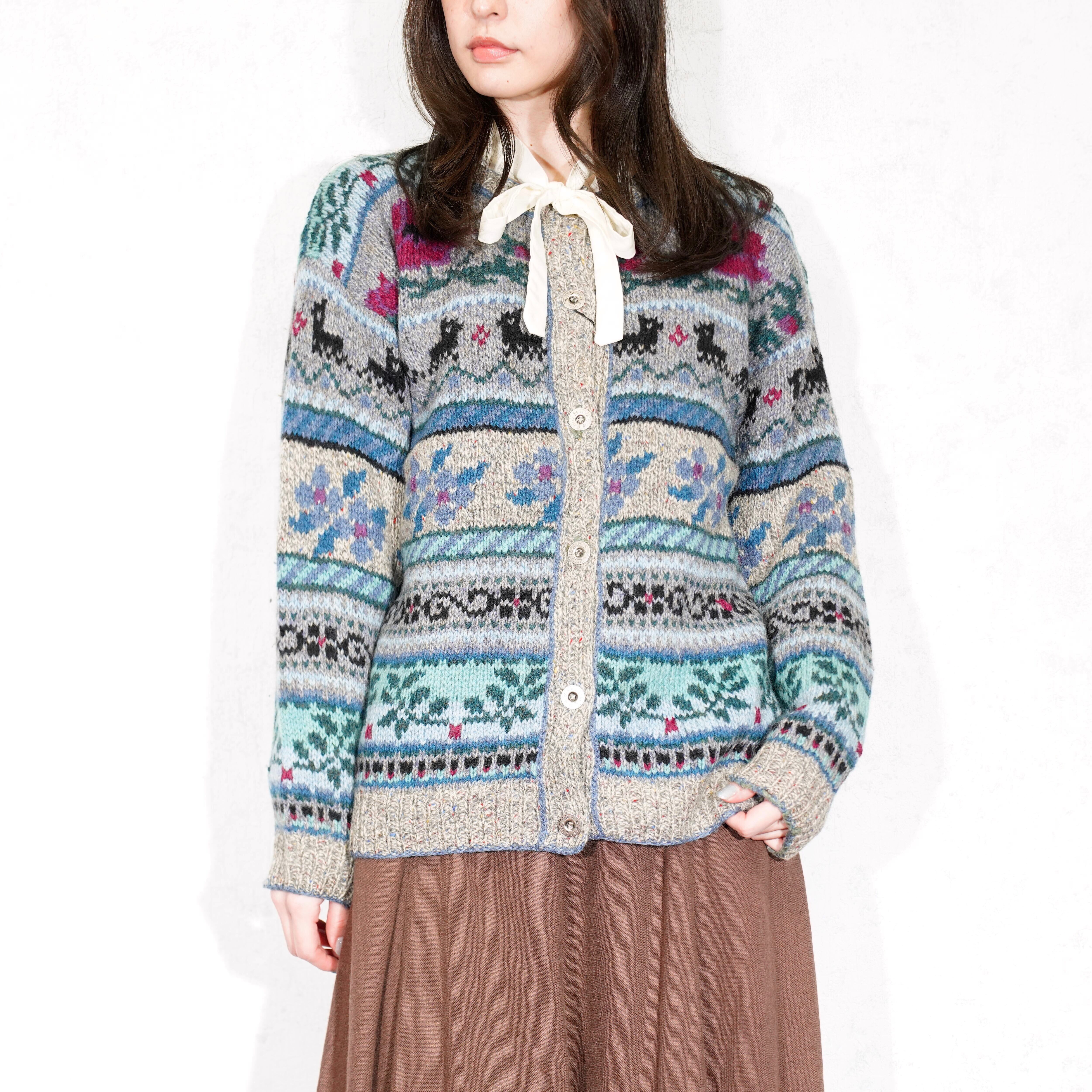 USA VINTAGE LL BEAN FLOWER ANIMAL PATTERNED DESIGN WOOL KNIT CARDIGAN/アメリカ古着エルエルビーンお花アニマル柄デザインニットカーディガン