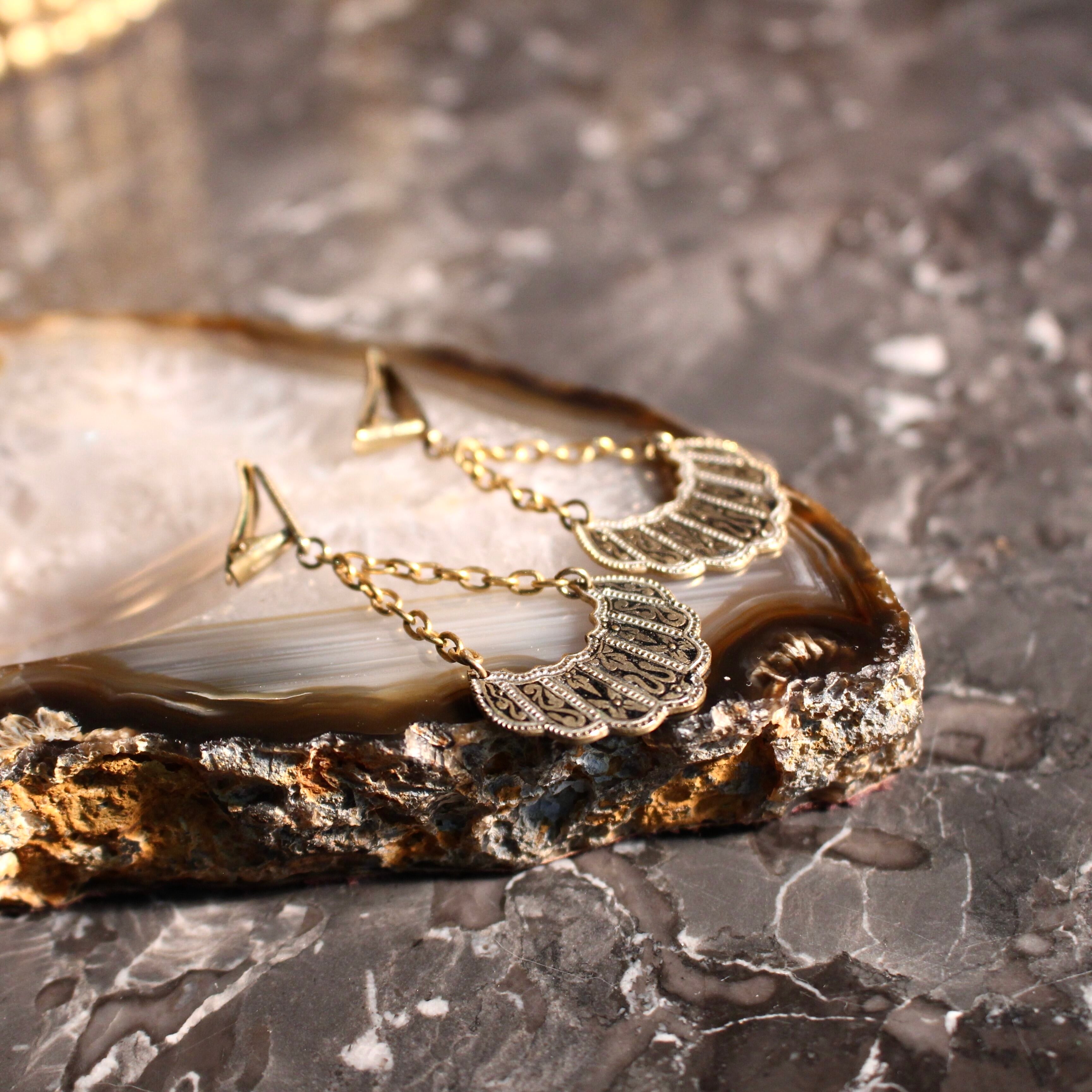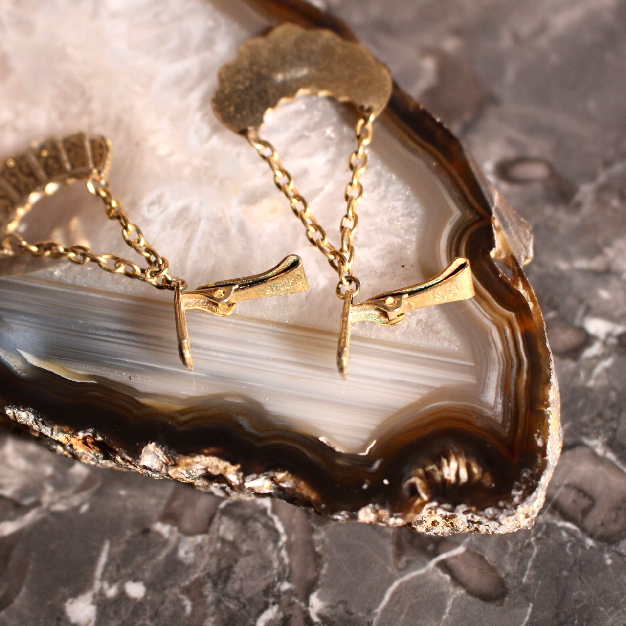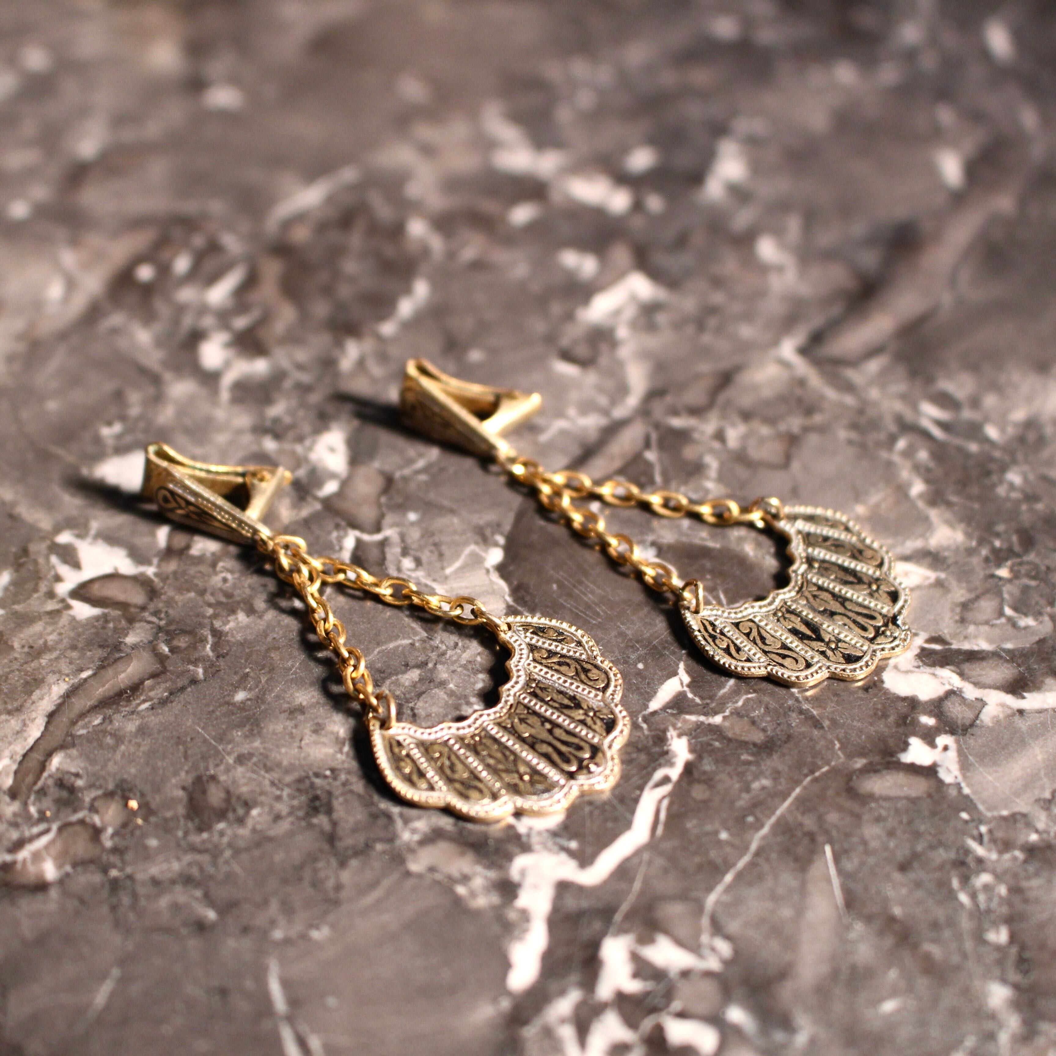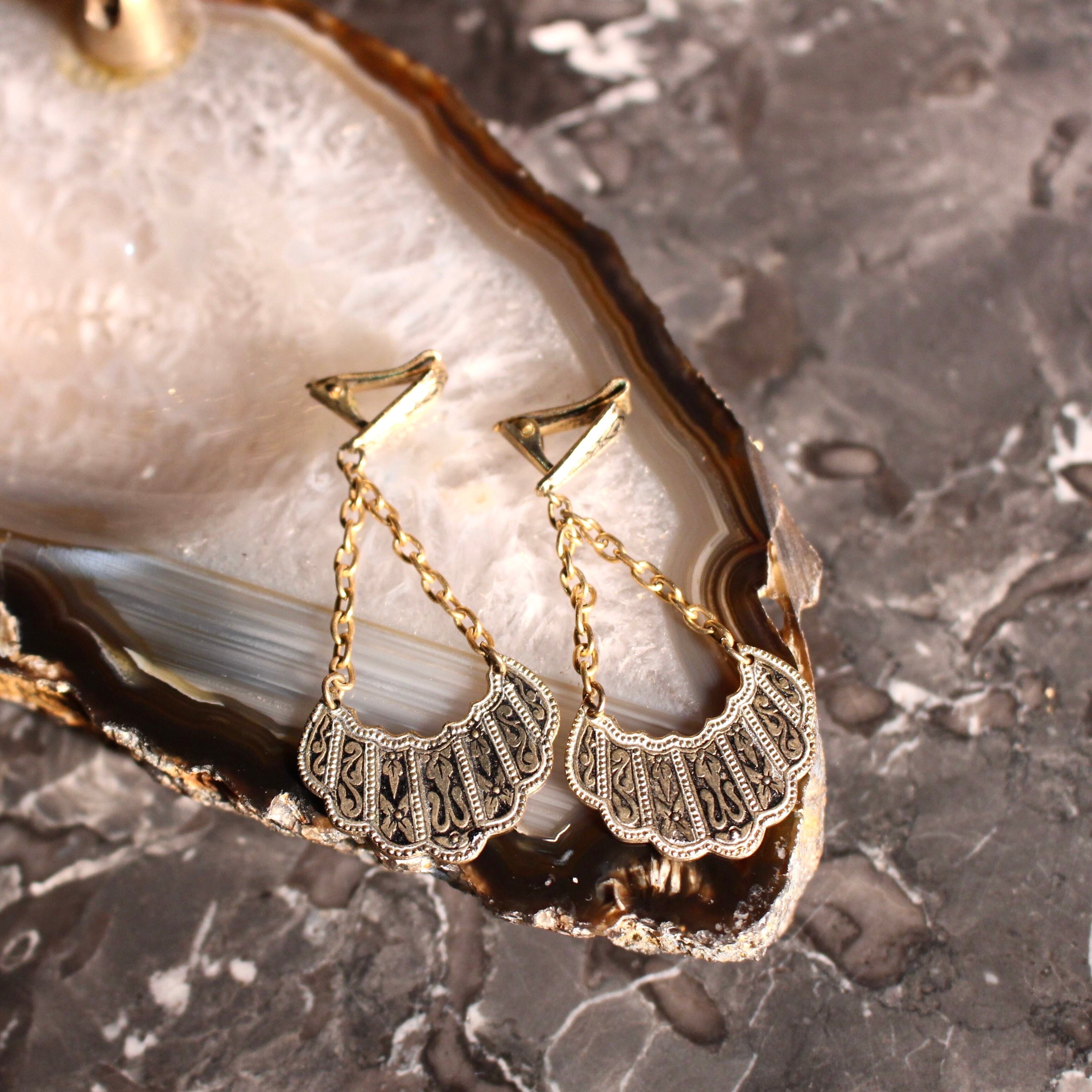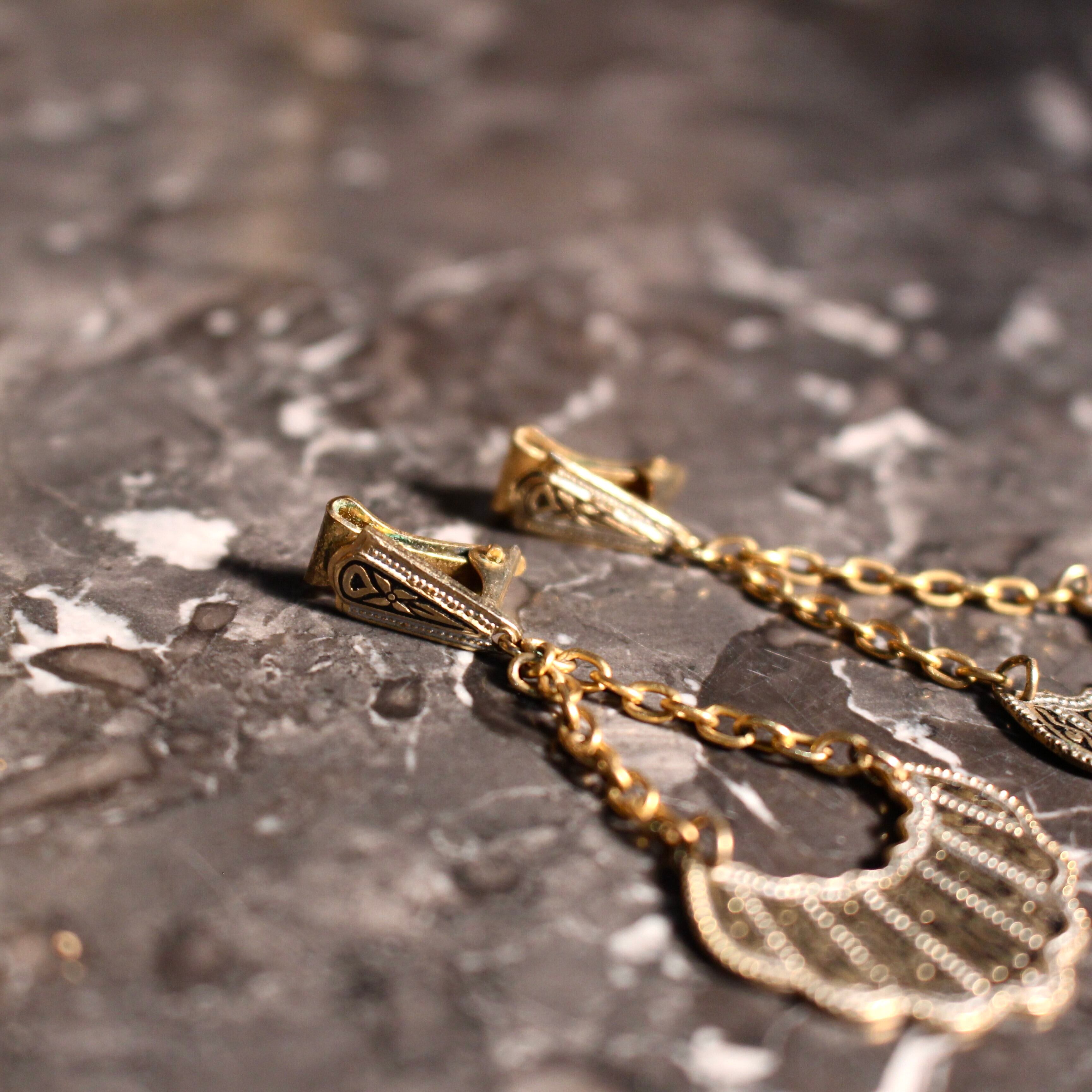 EU VINTAGE DAMASQUINADO DESIGN SWING EAR CLIPS MADE IN SPAIN/ヨーロッパ古着ダマスキナードデザインぶら下がりイヤリング