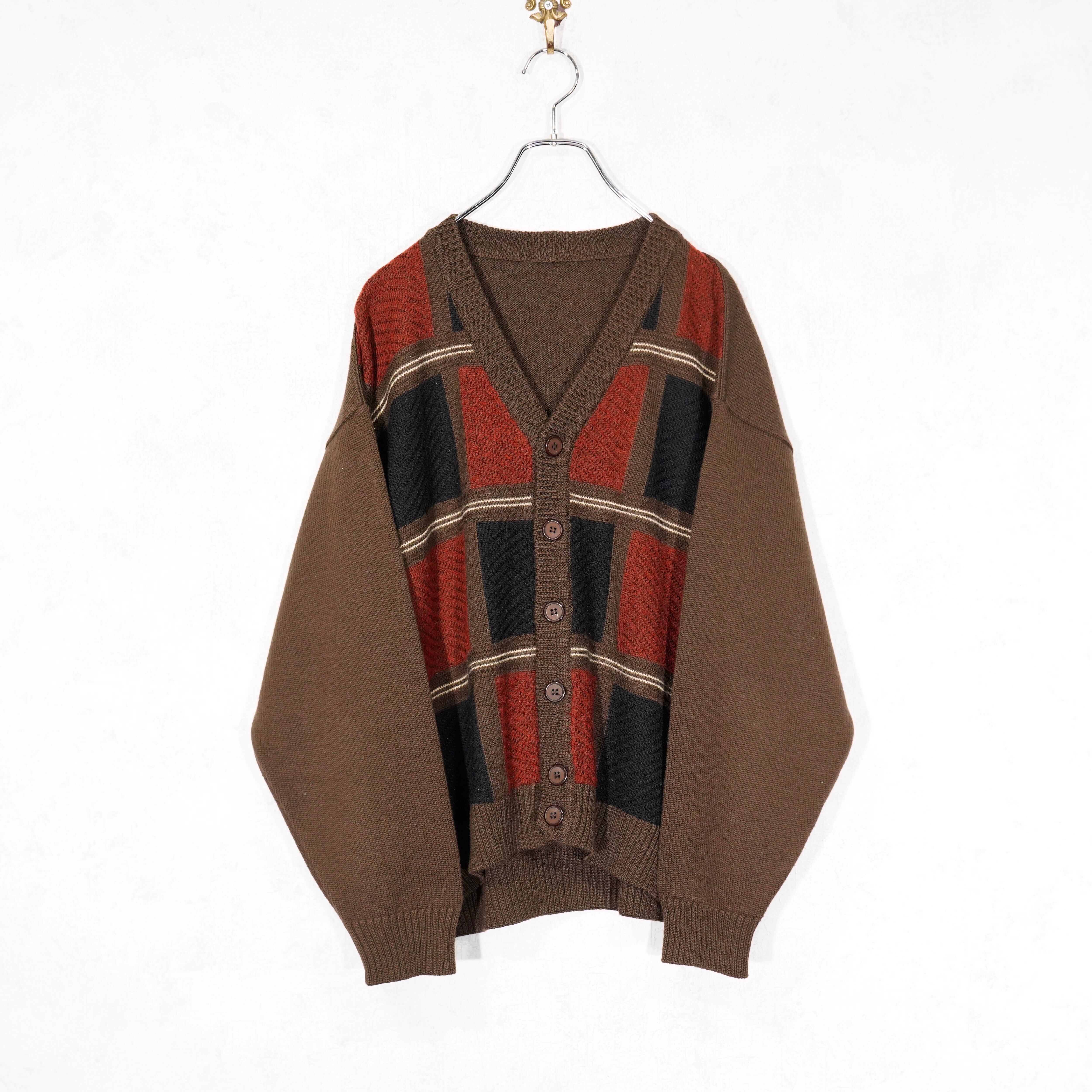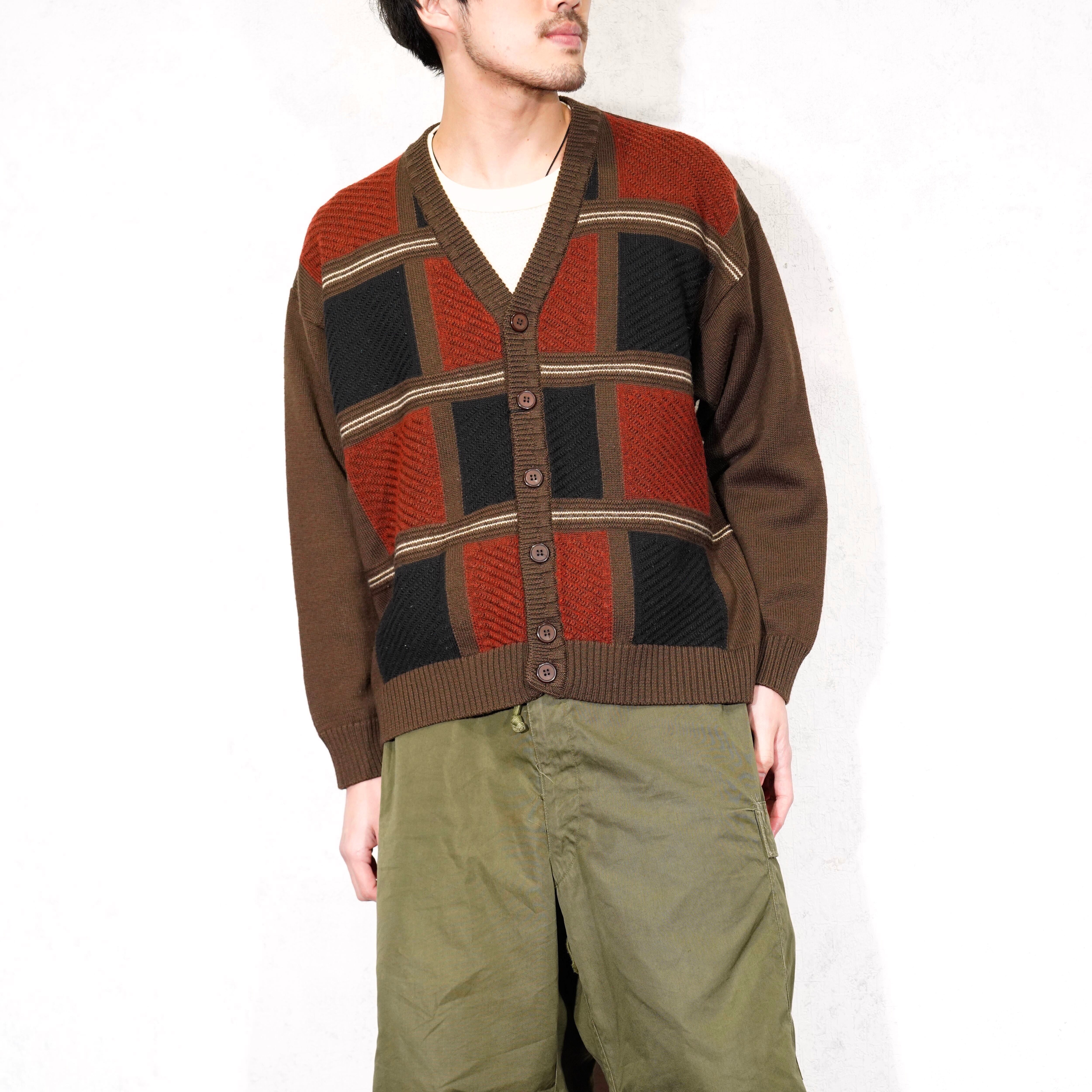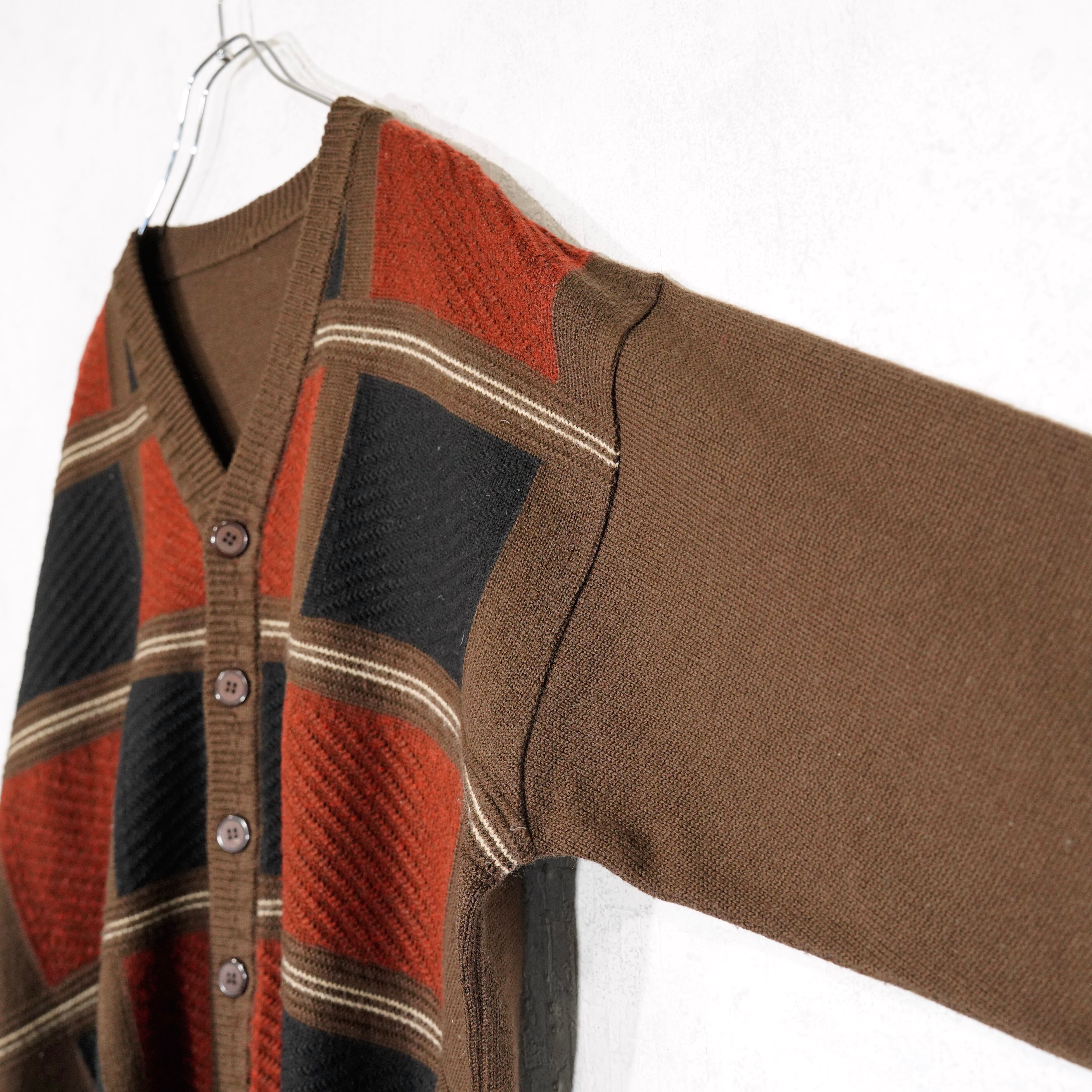 USA VINTAGE BLOCK CHECK PATTERNED DESIGN KNIT CARDIGAN/アメリカ古着ブロックチェック柄デザインニットカーディガン