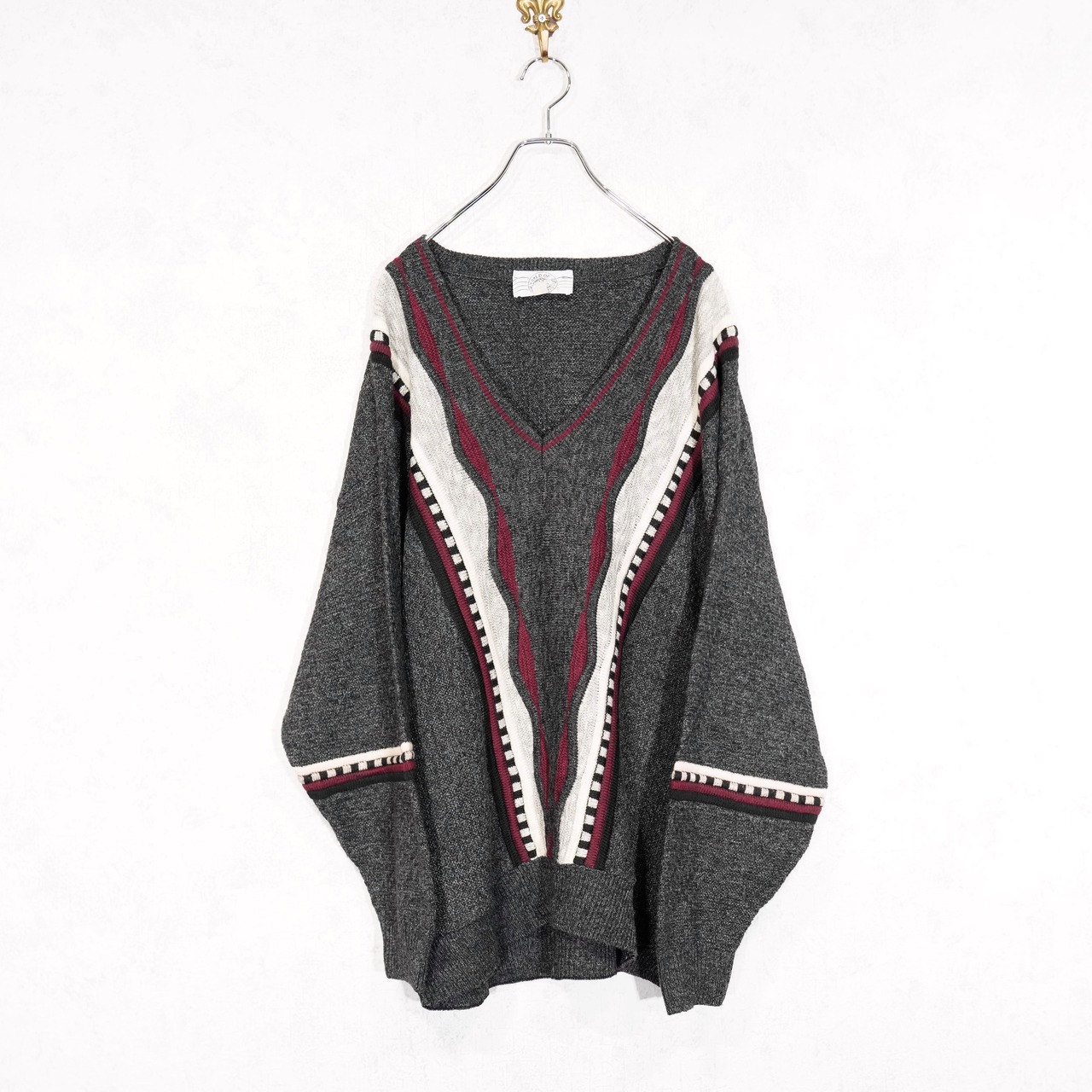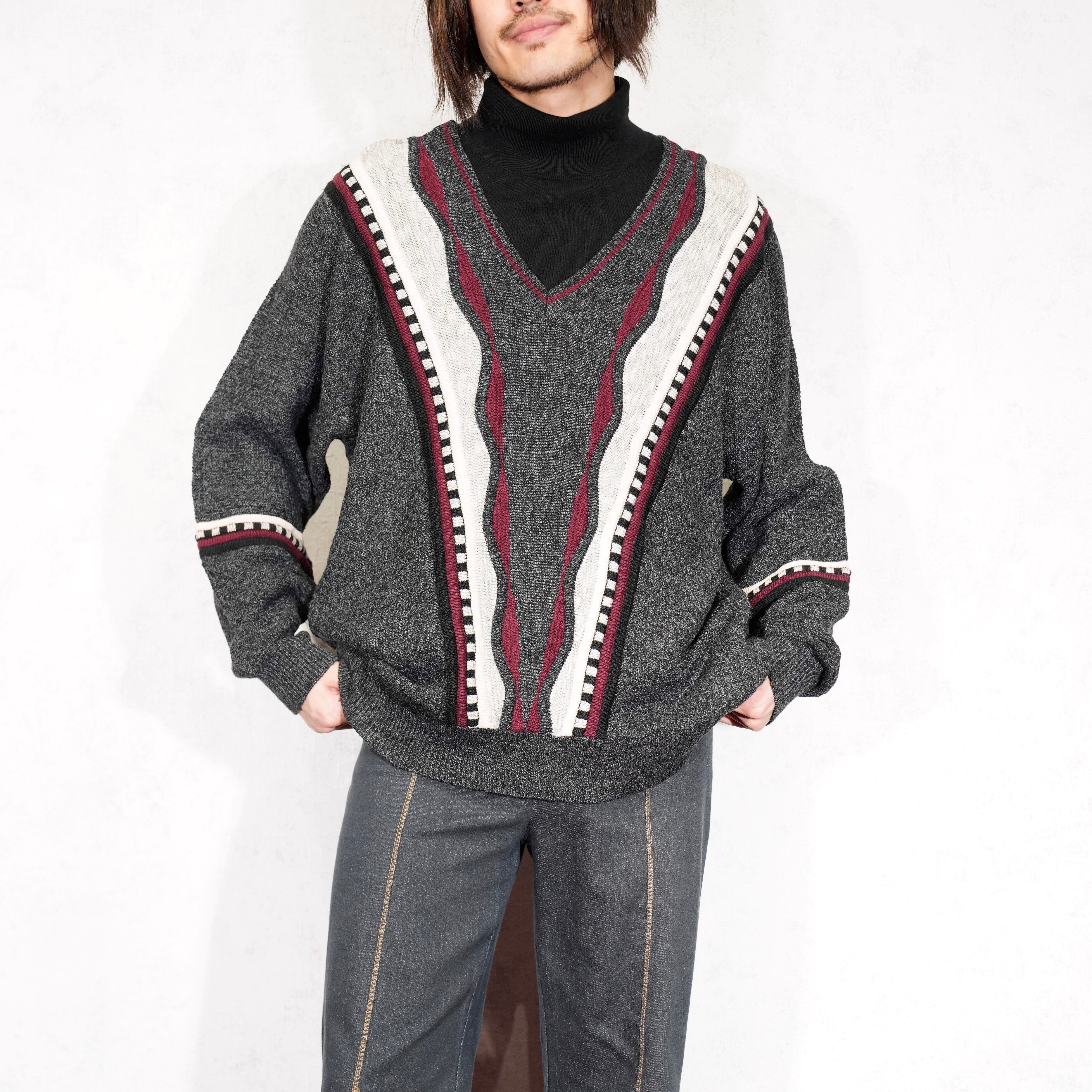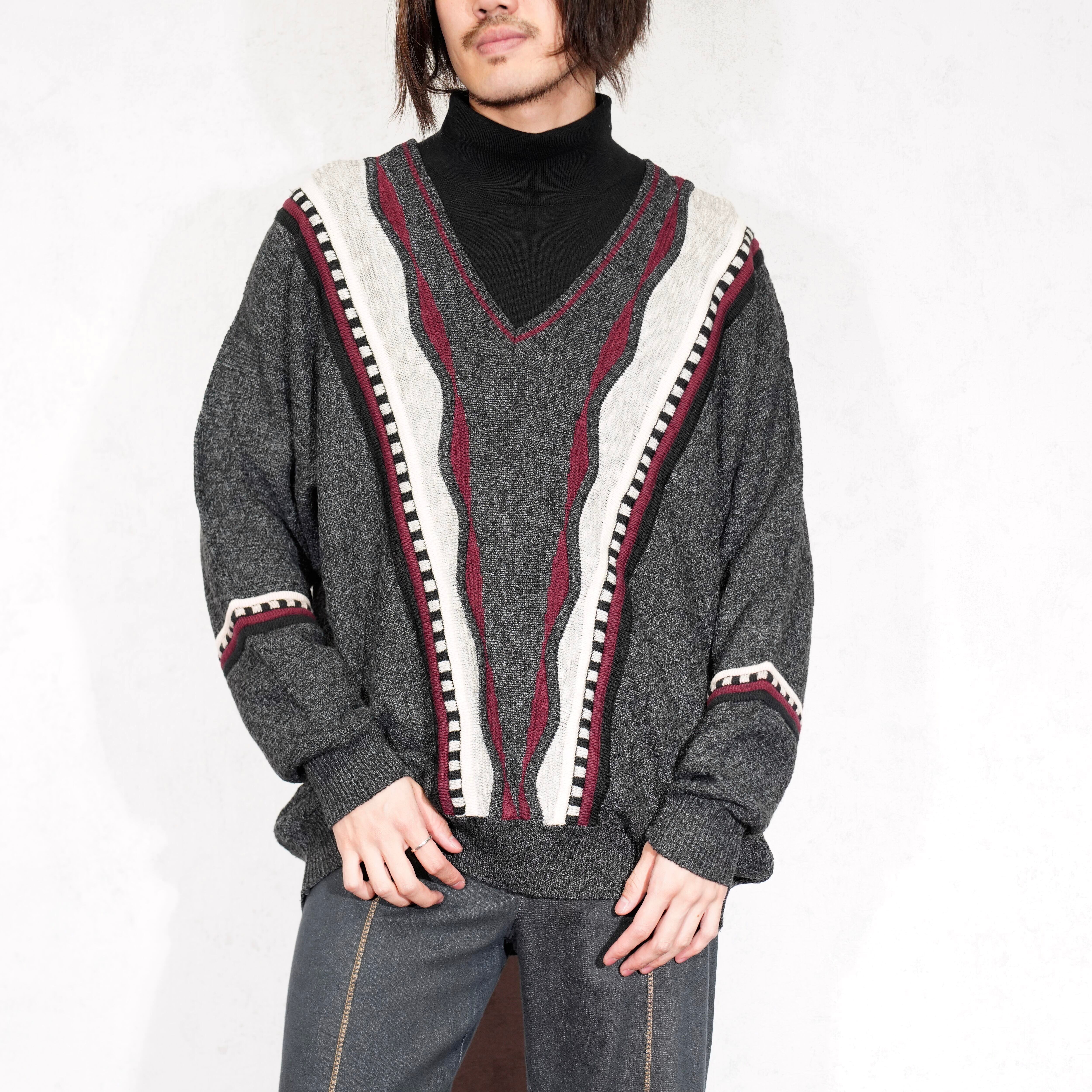 EU VINTAGE WORLD OF MAN'S FASHION 3D V NECK DESIGN KNIT/ヨーロッパ古着3DVネックデザインニット