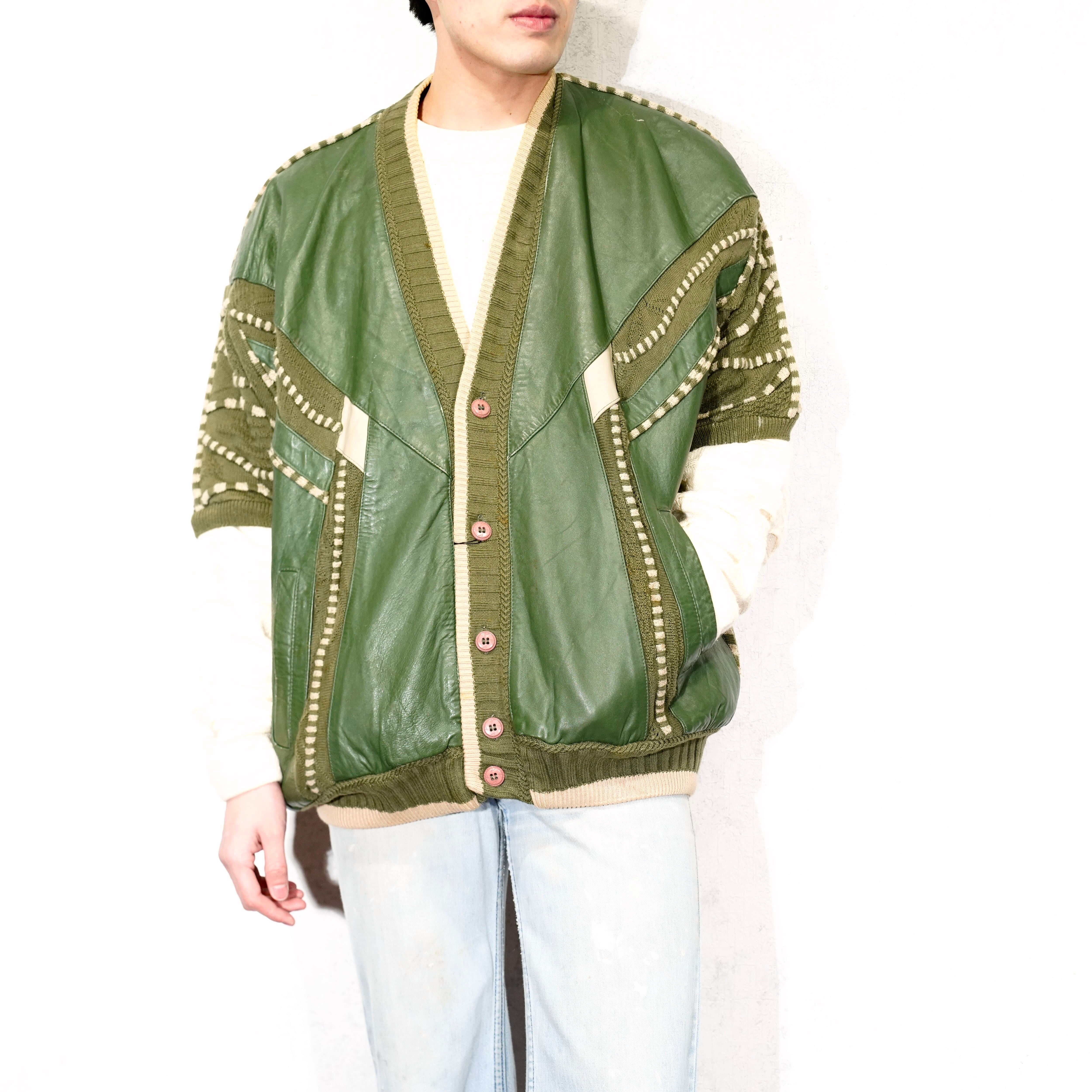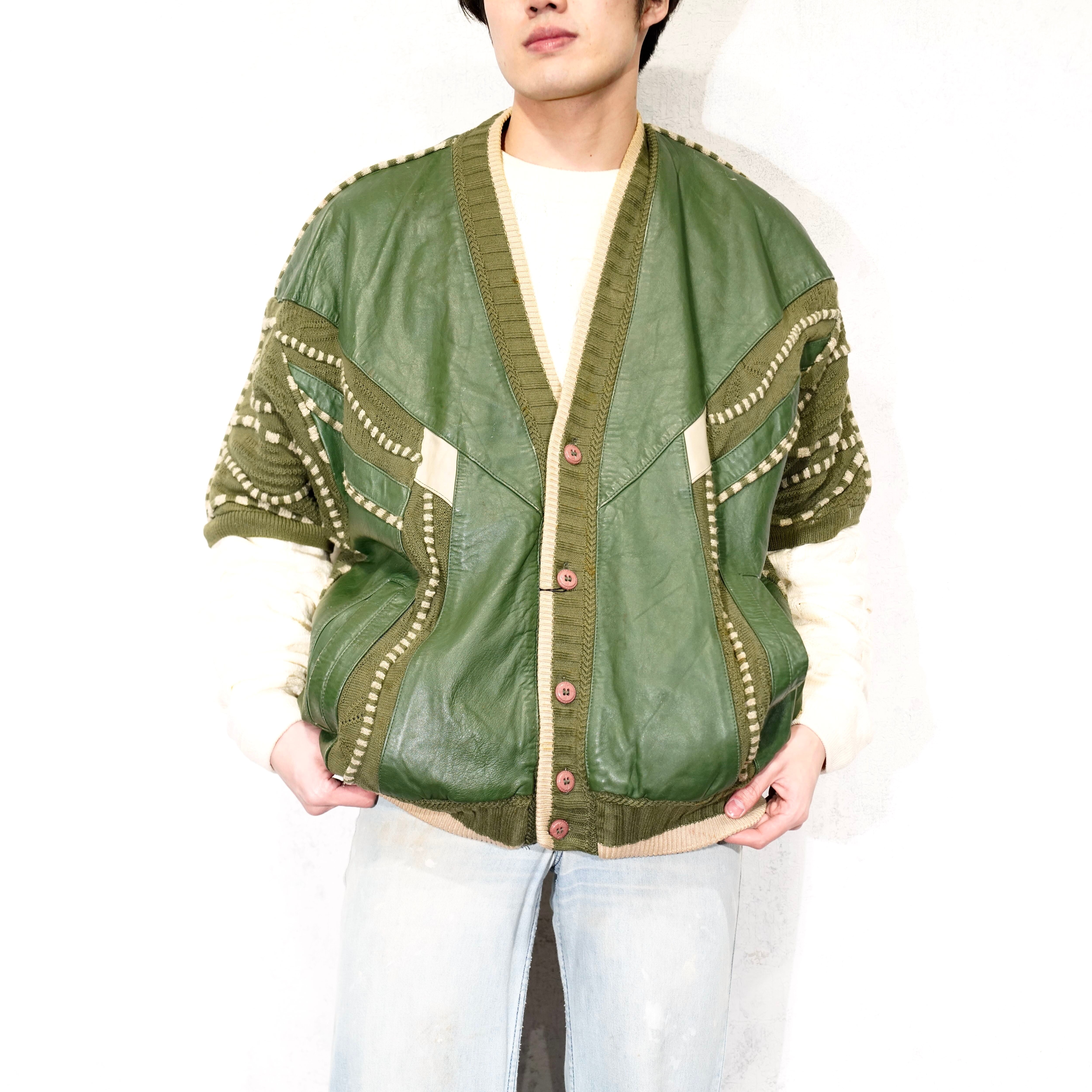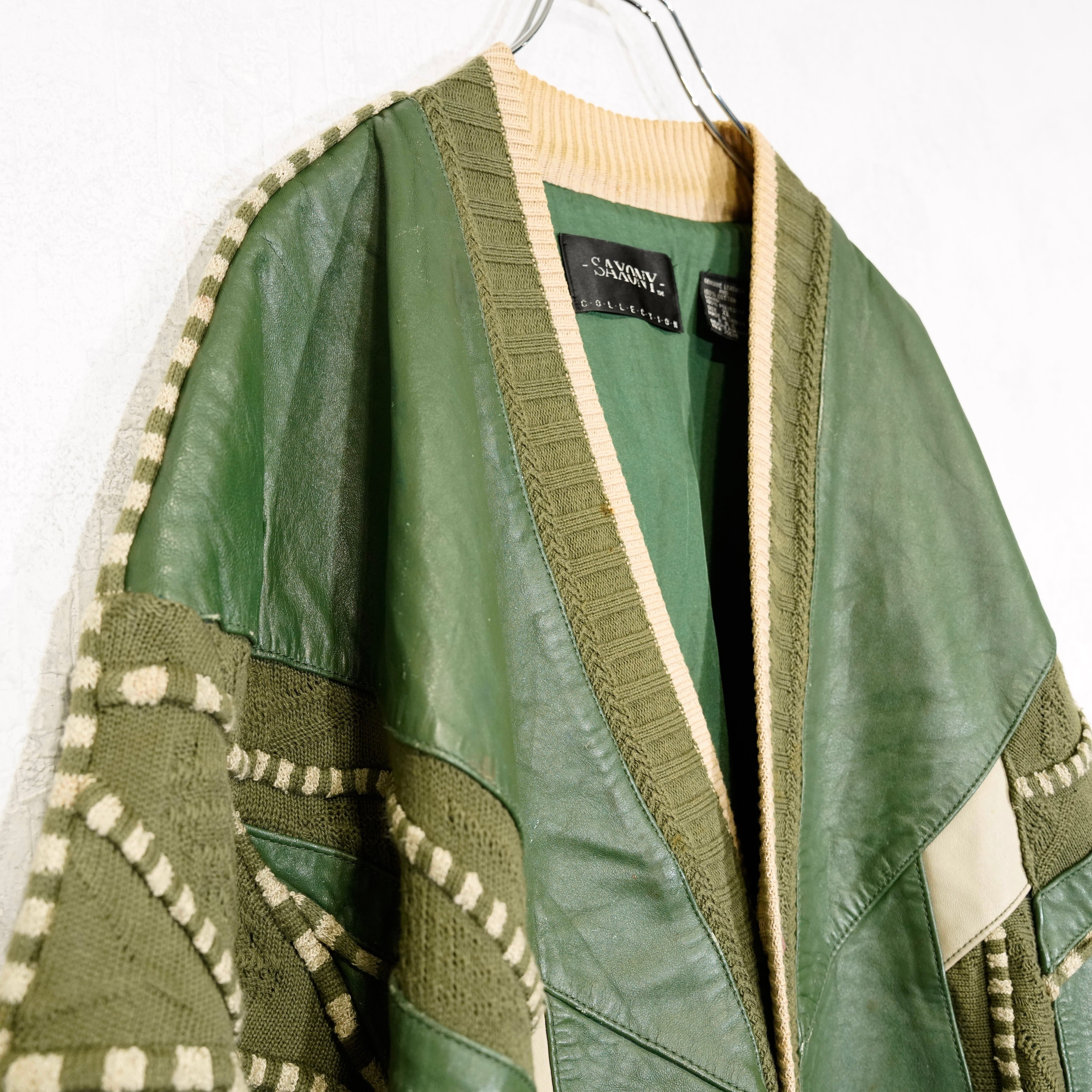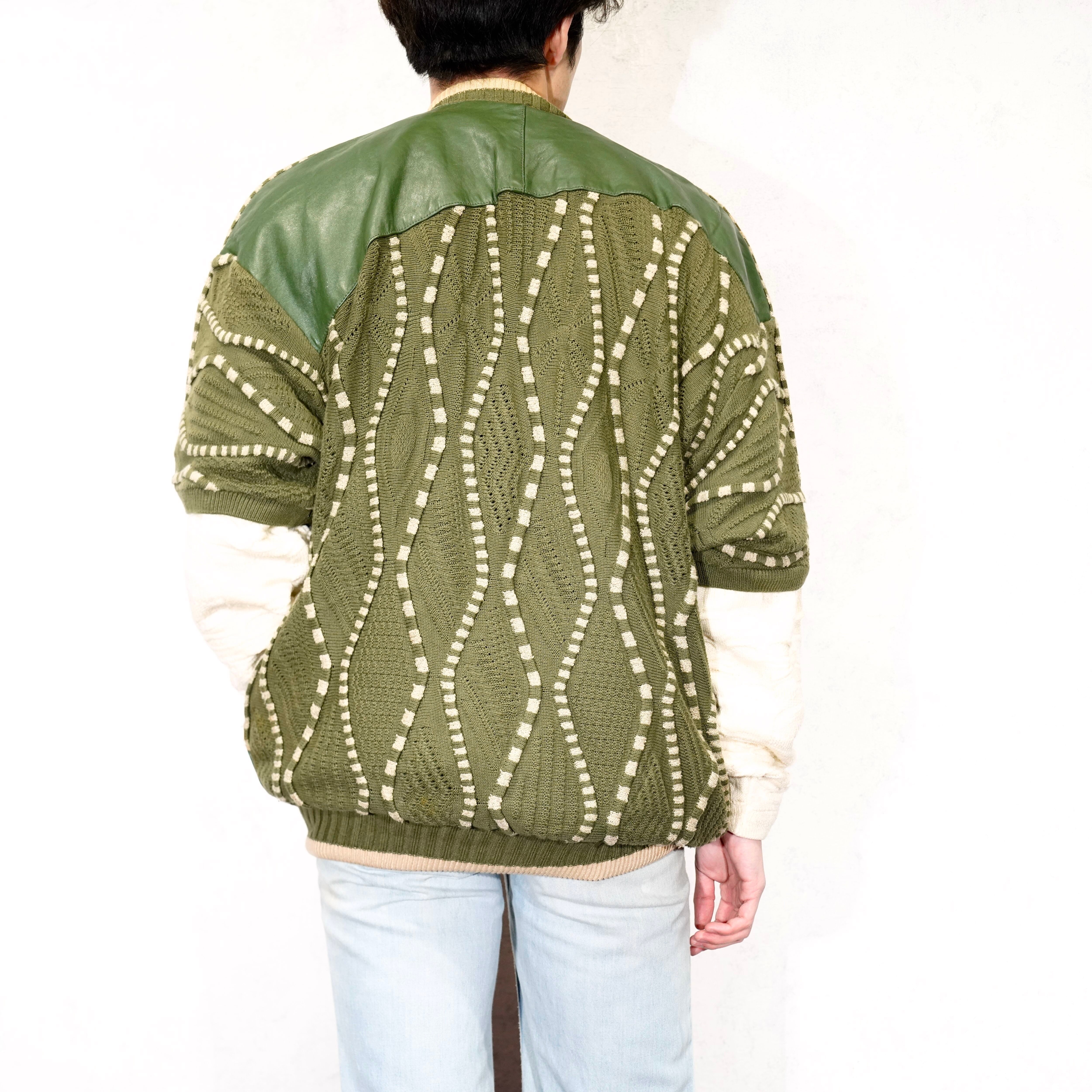 USA VINTAGE SAXONY 3D KNIT DESIGN LEATHER CARDIGAN/アメリカ古着3Dニットデザインレザーカーディガン