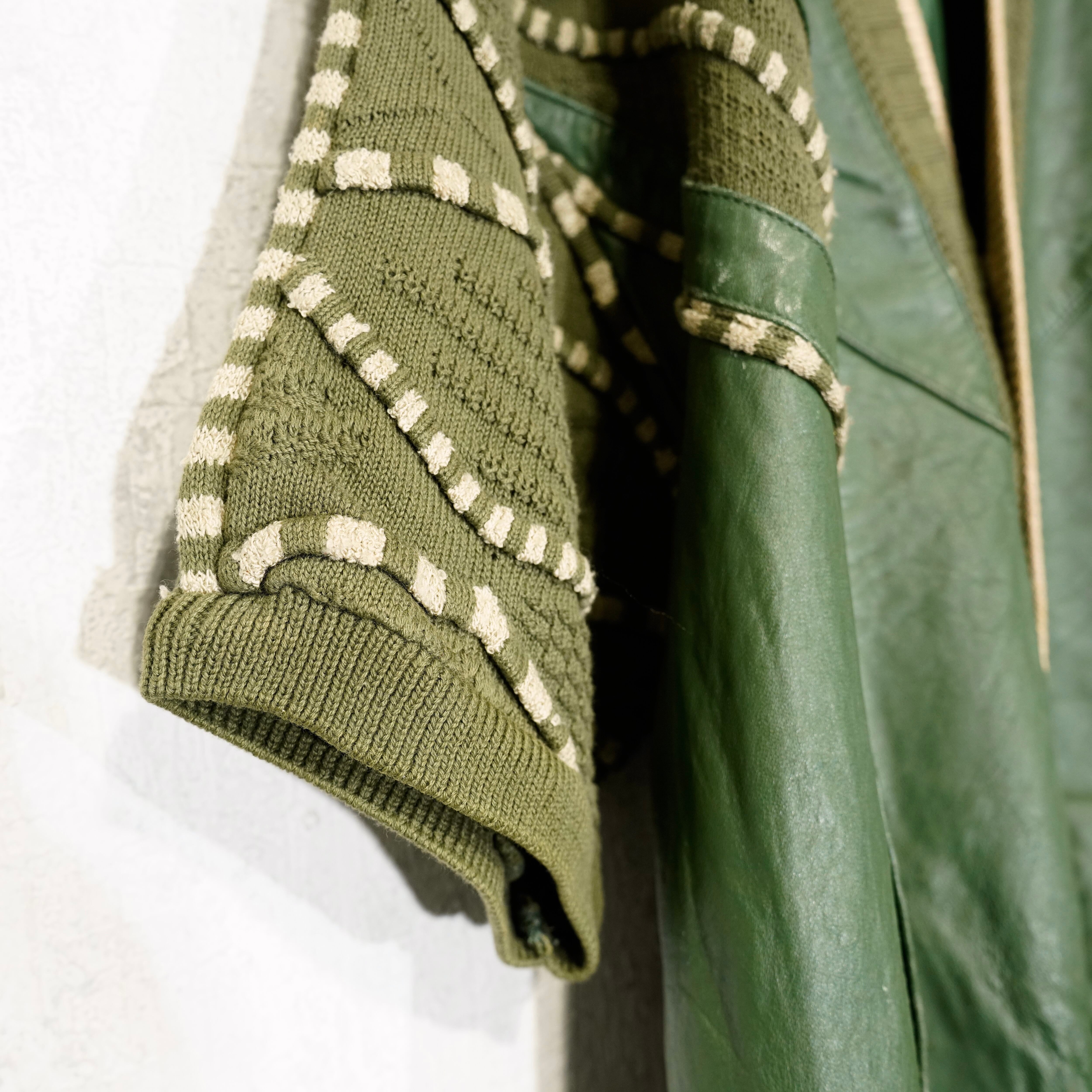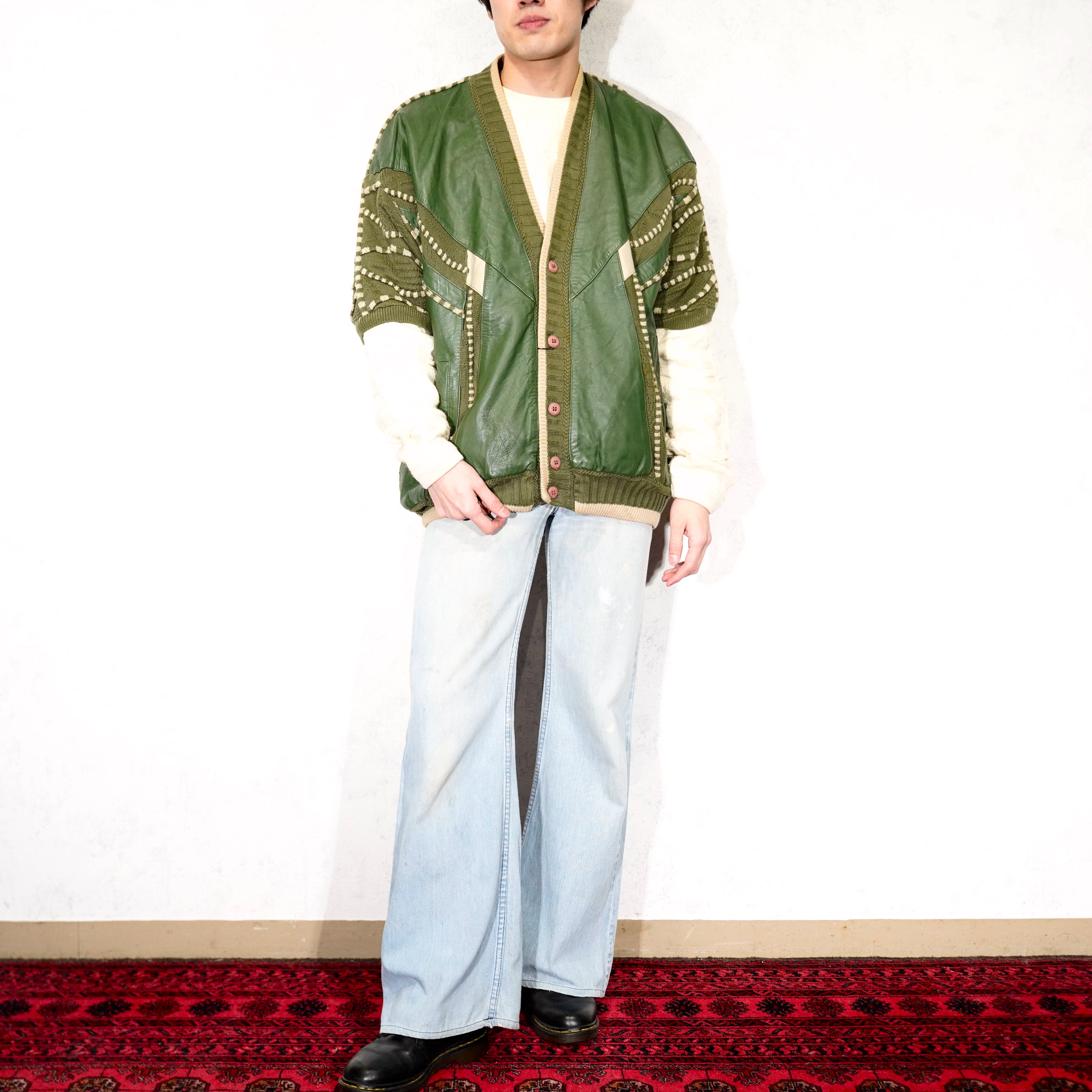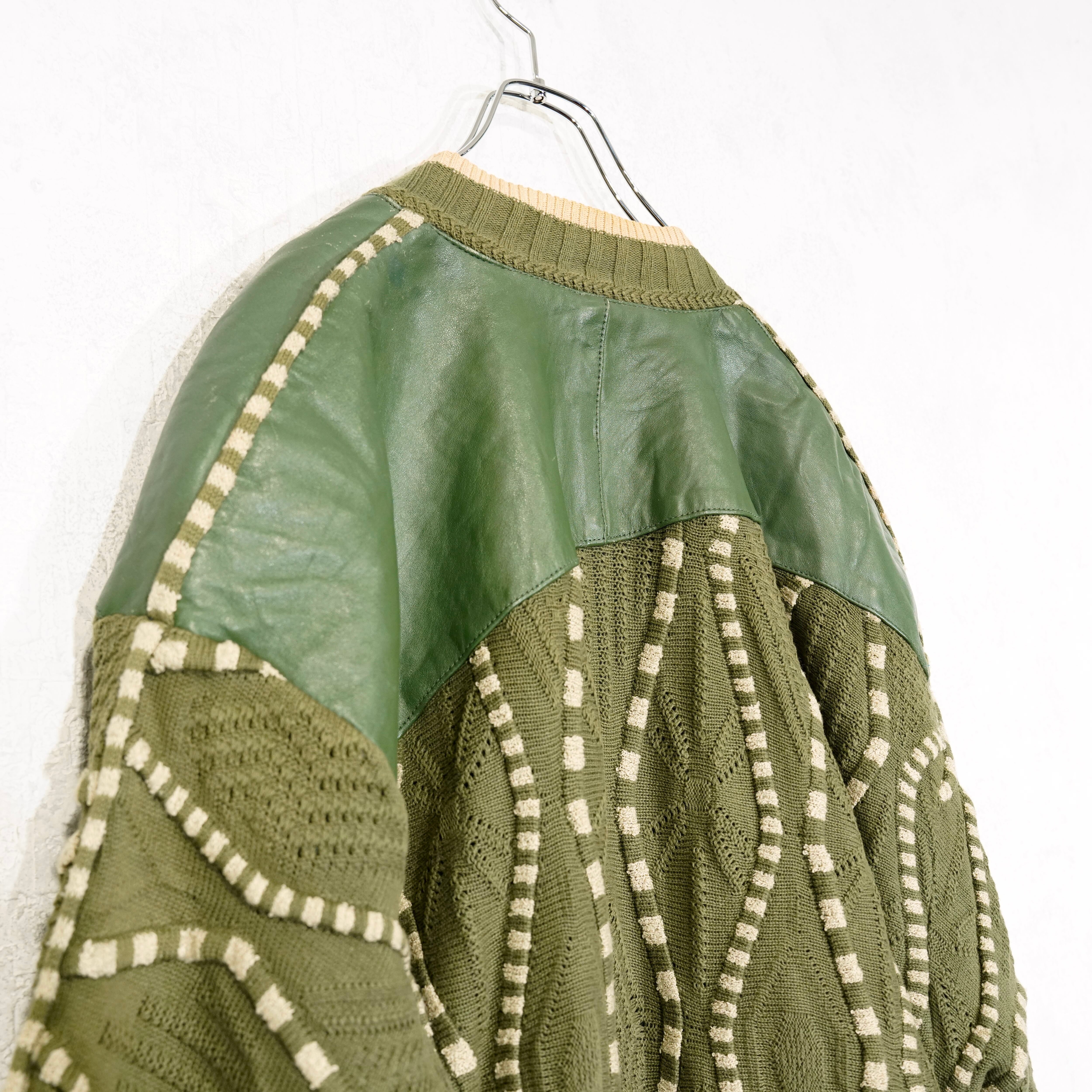 USA VINTAGE SAXONY 3D KNIT DESIGN LEATHER CARDIGAN/アメリカ古着3Dニットデザインレザーカーディガン