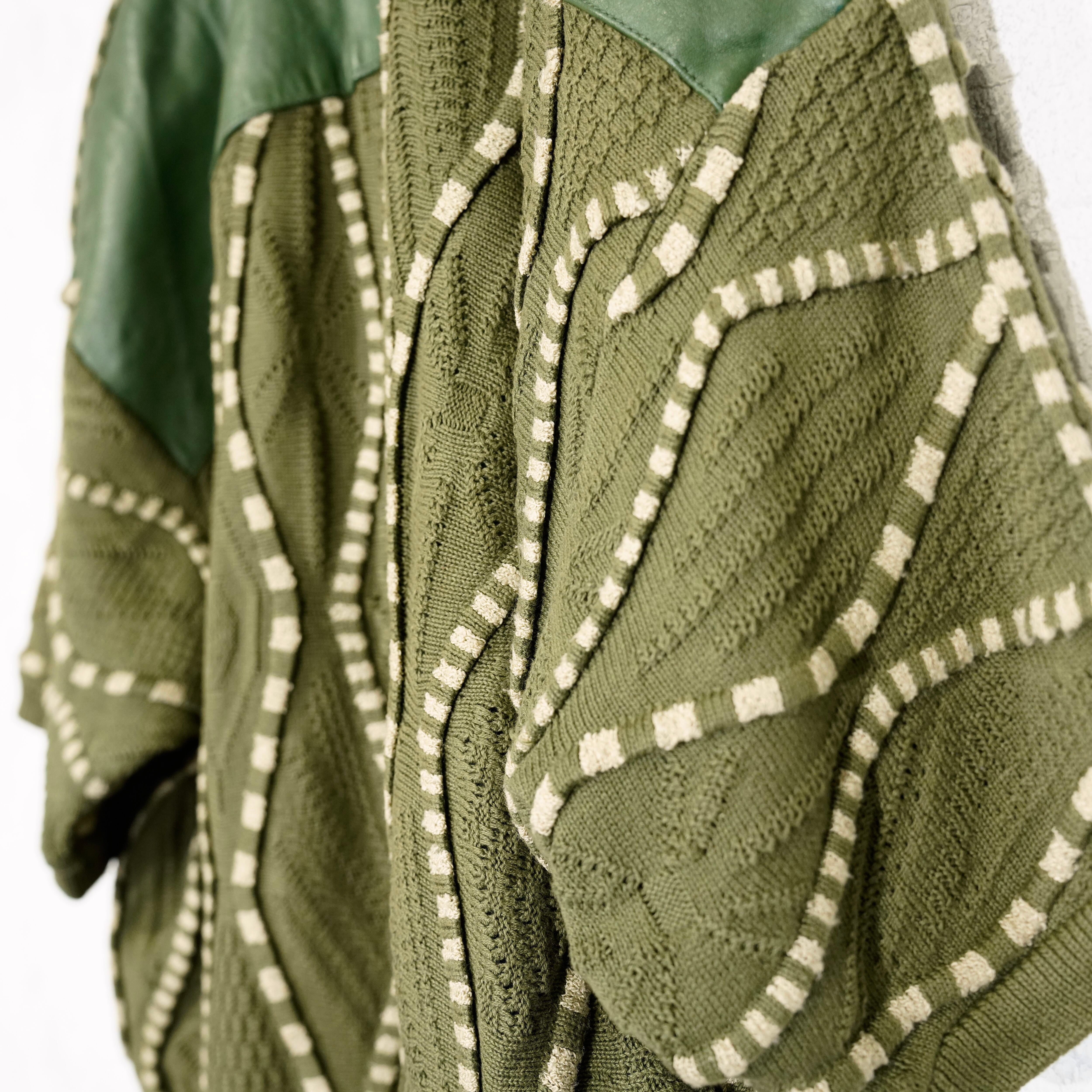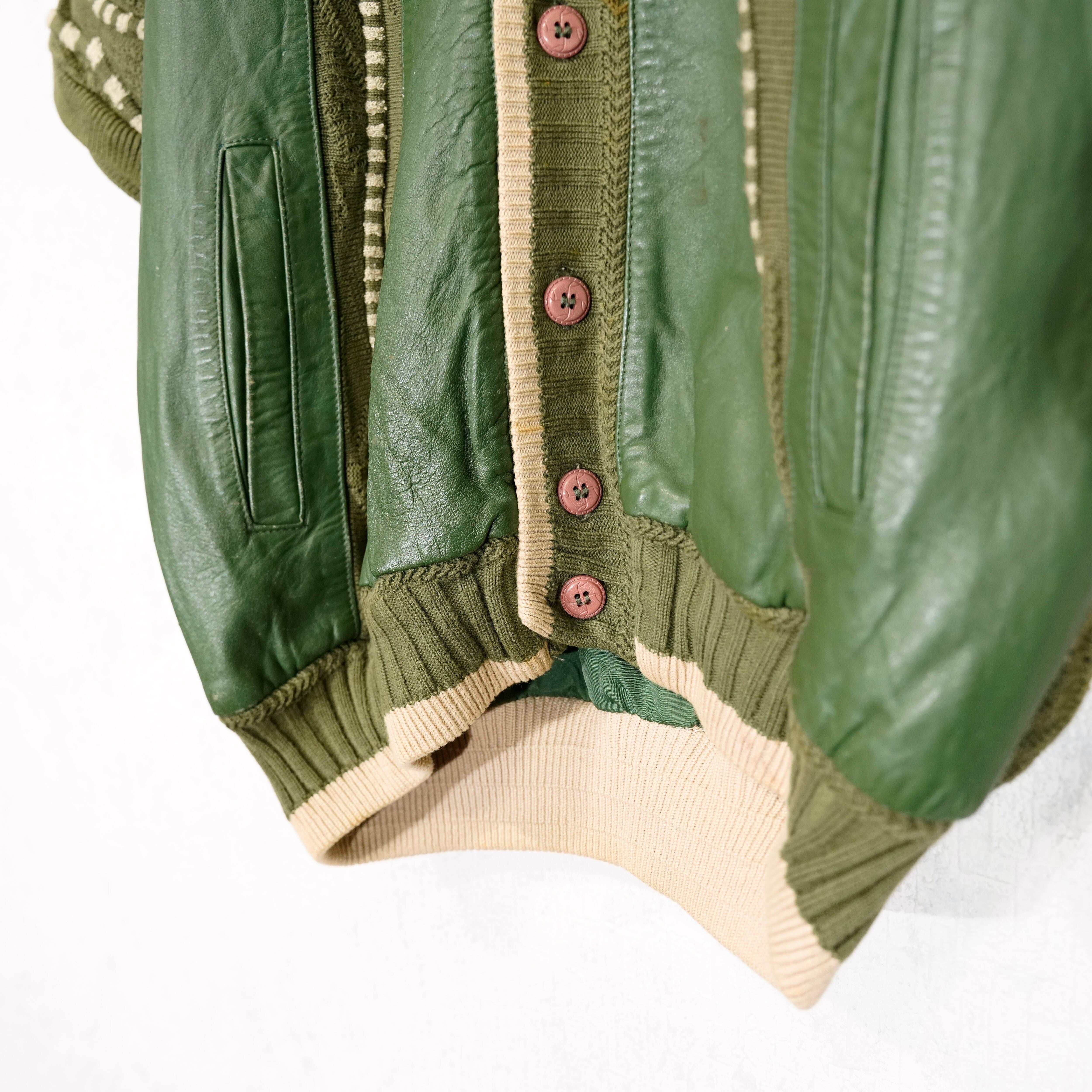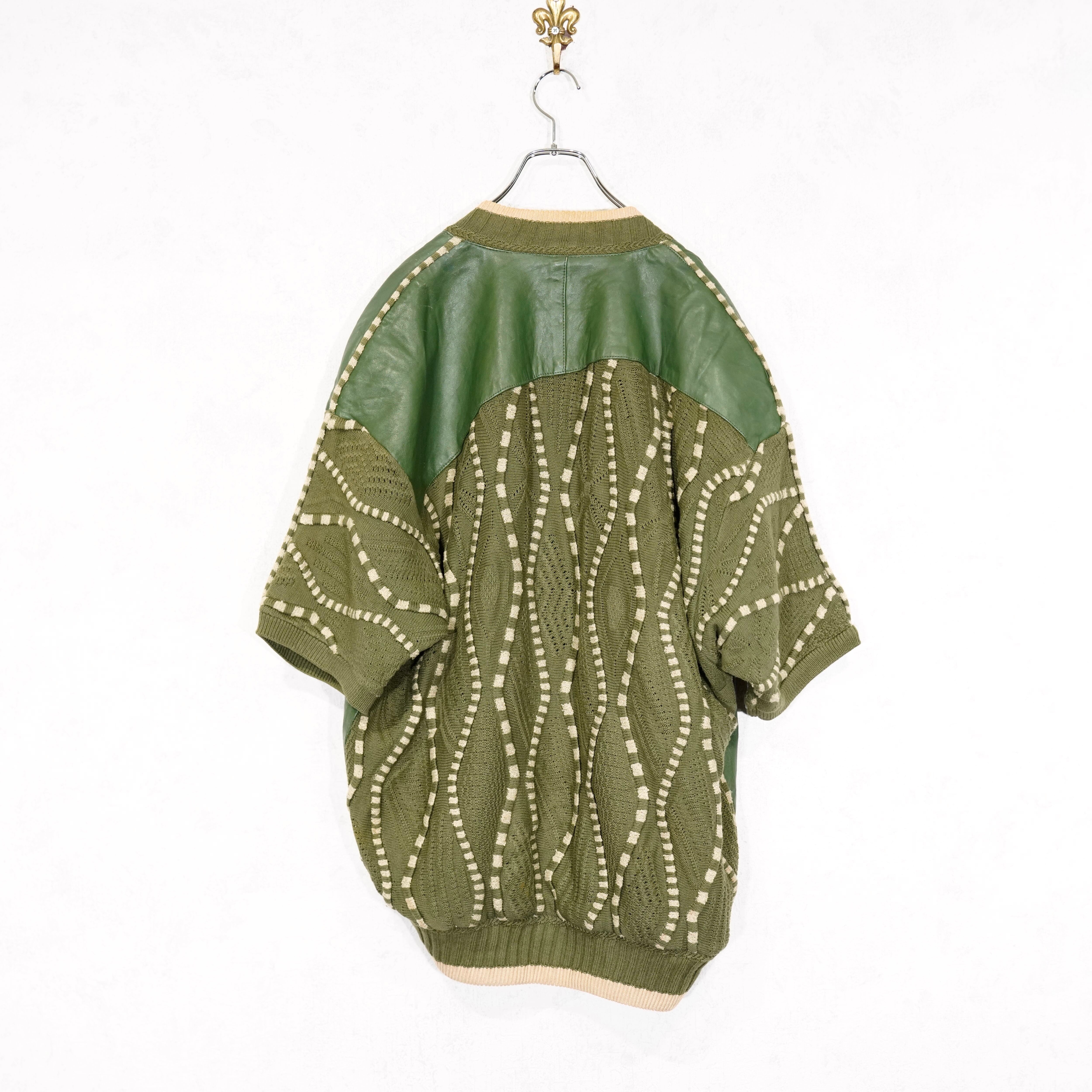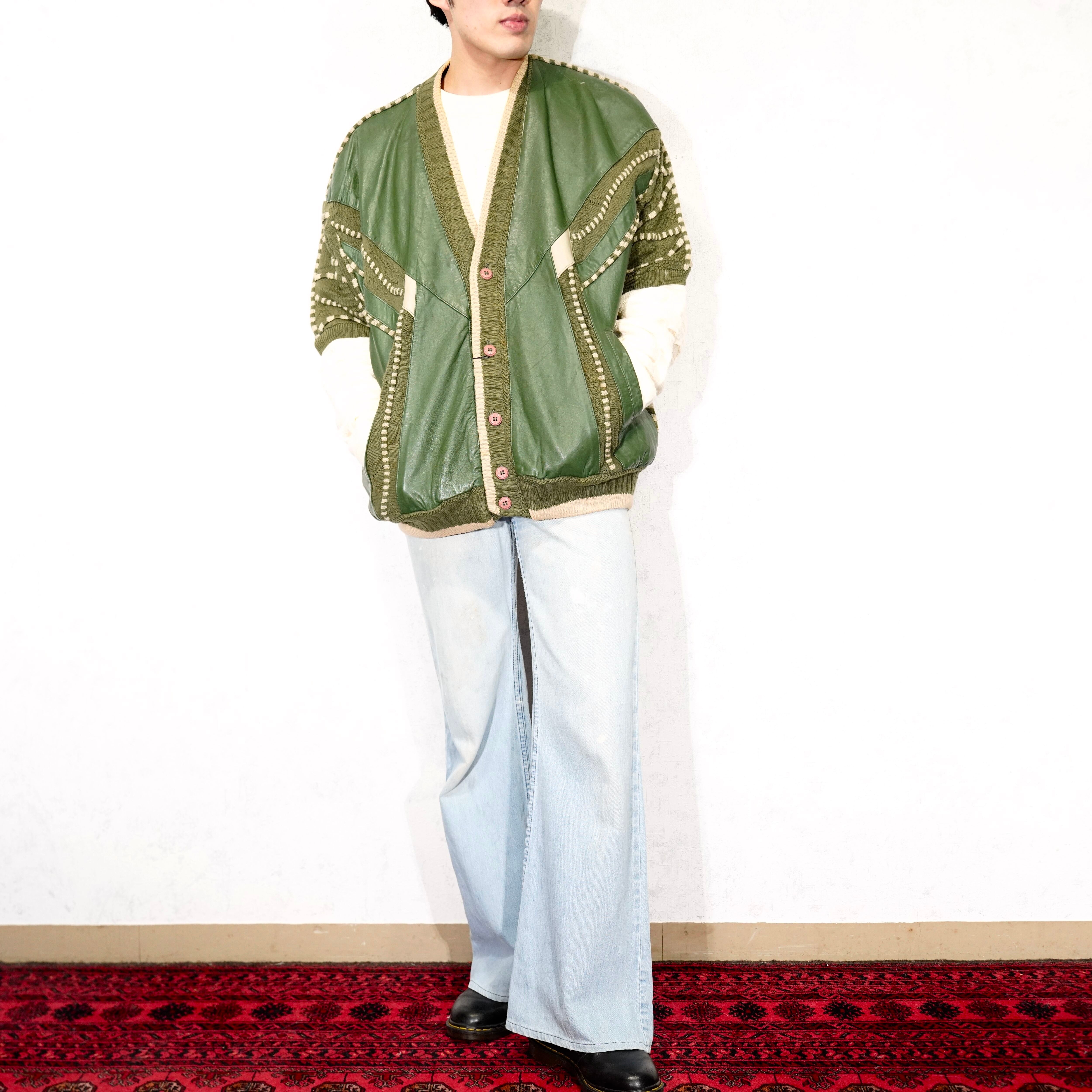 USA VINTAGE SAXONY 3D KNIT DESIGN LEATHER CARDIGAN/アメリカ古着3Dニットデザインレザーカーディガン
