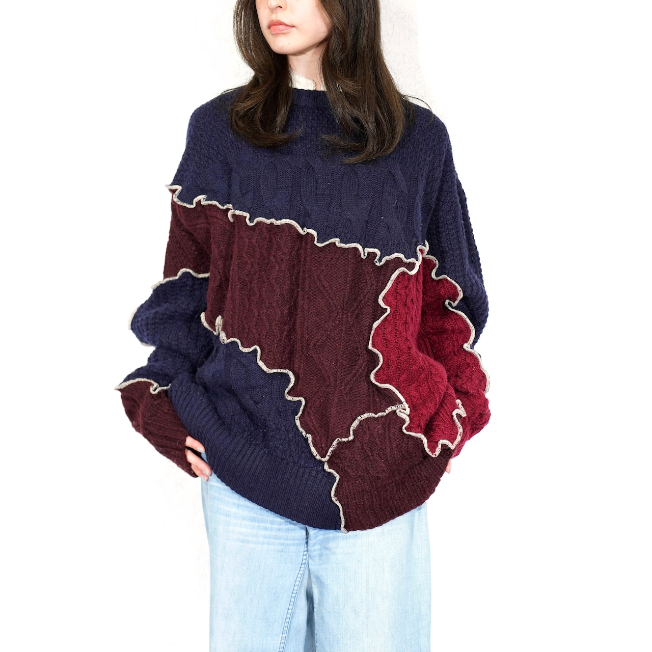 EU VINTAGE terminal PATCHWORK DESIGN REMAKE CABLE KNIT/ヨーロッパ古着パッチワークデザインリメイクケーブルハンドメイドニット(アランニット/フィッシャーマンニット)