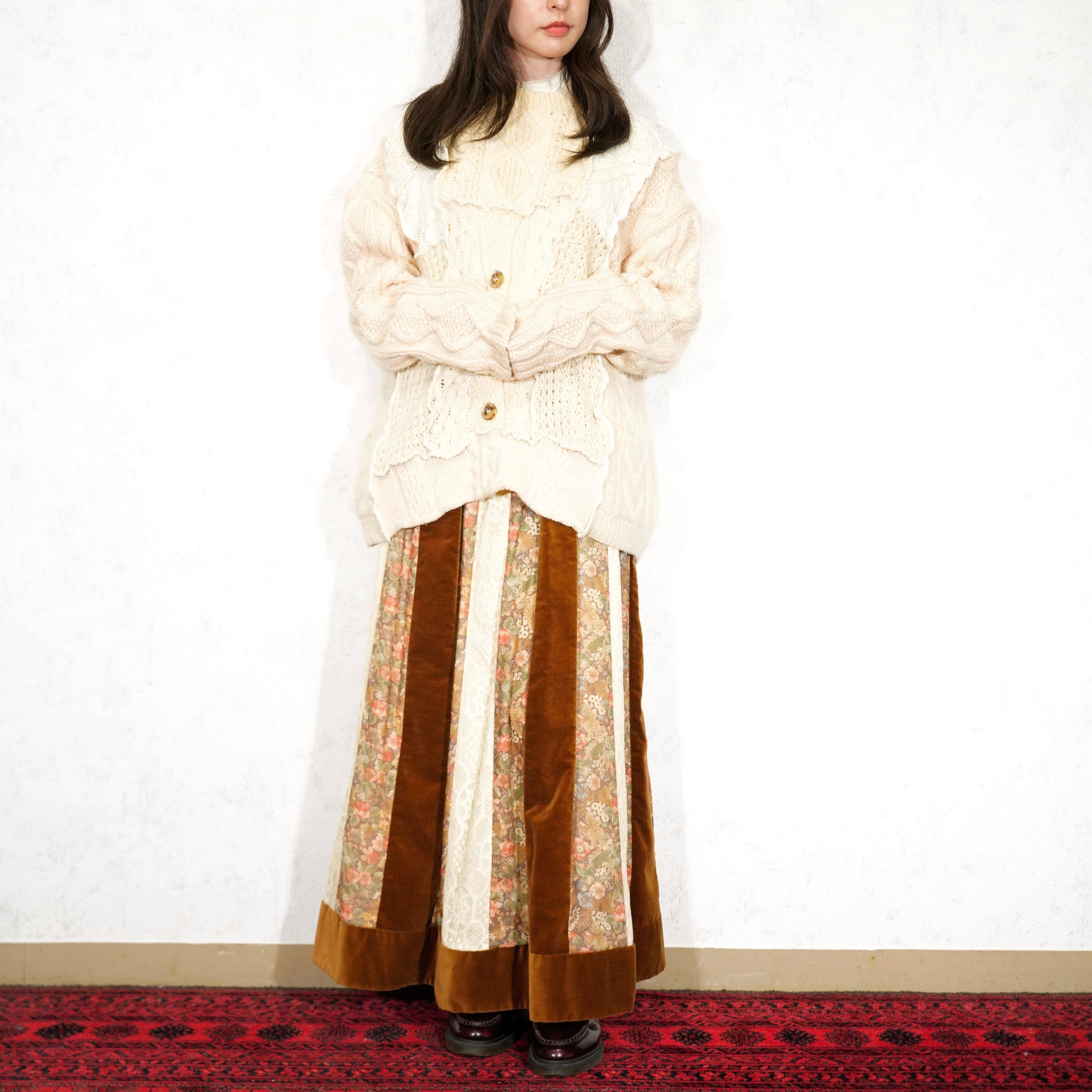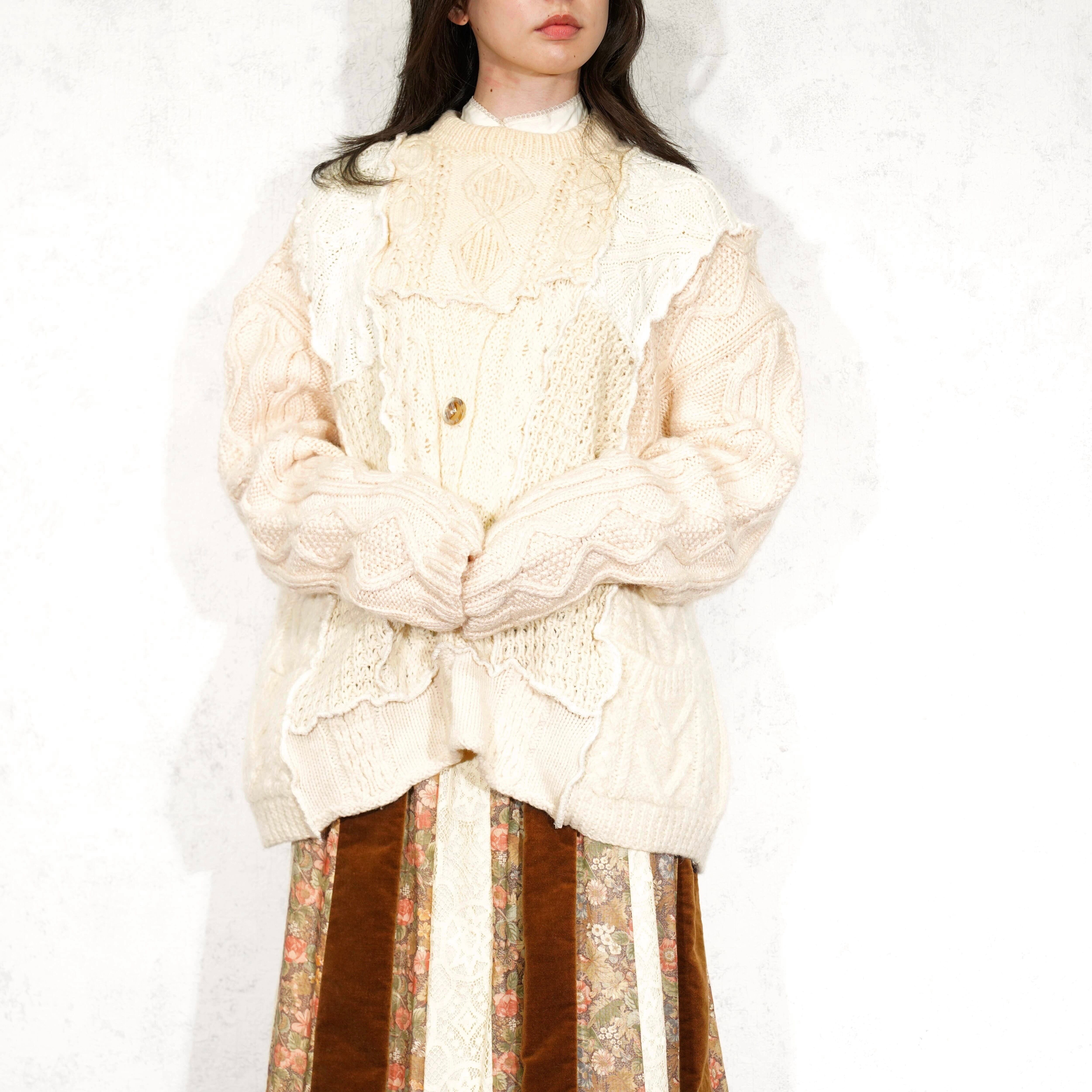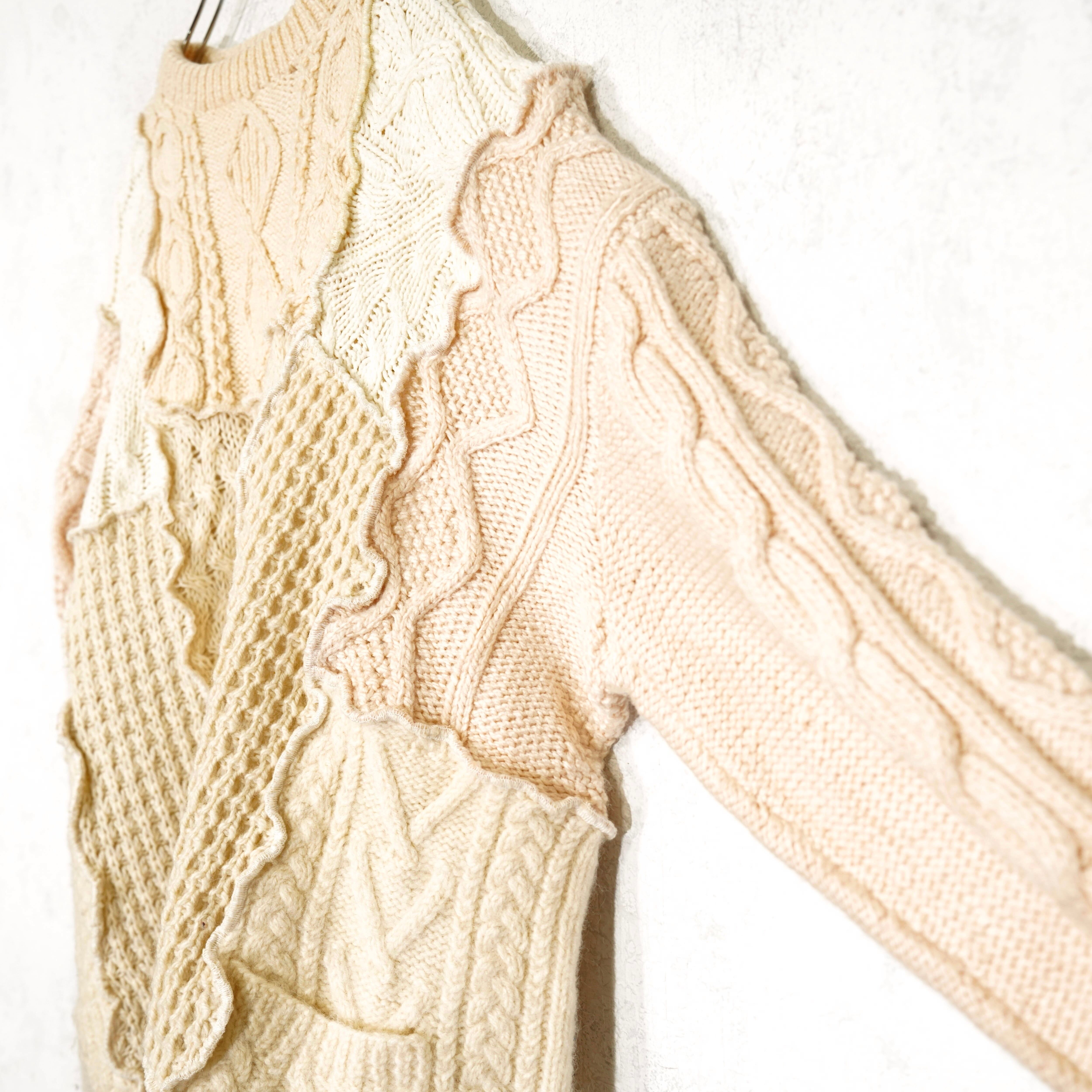 EU VINTAGE PATCHWORK BUTTON DESIGN REMAKE CABLE KNIT/ヨーロッパ古着パッチワークボタン付デザインリメイクケーブルハンドメイドニット(アランニット/フィッシャーマンニット)