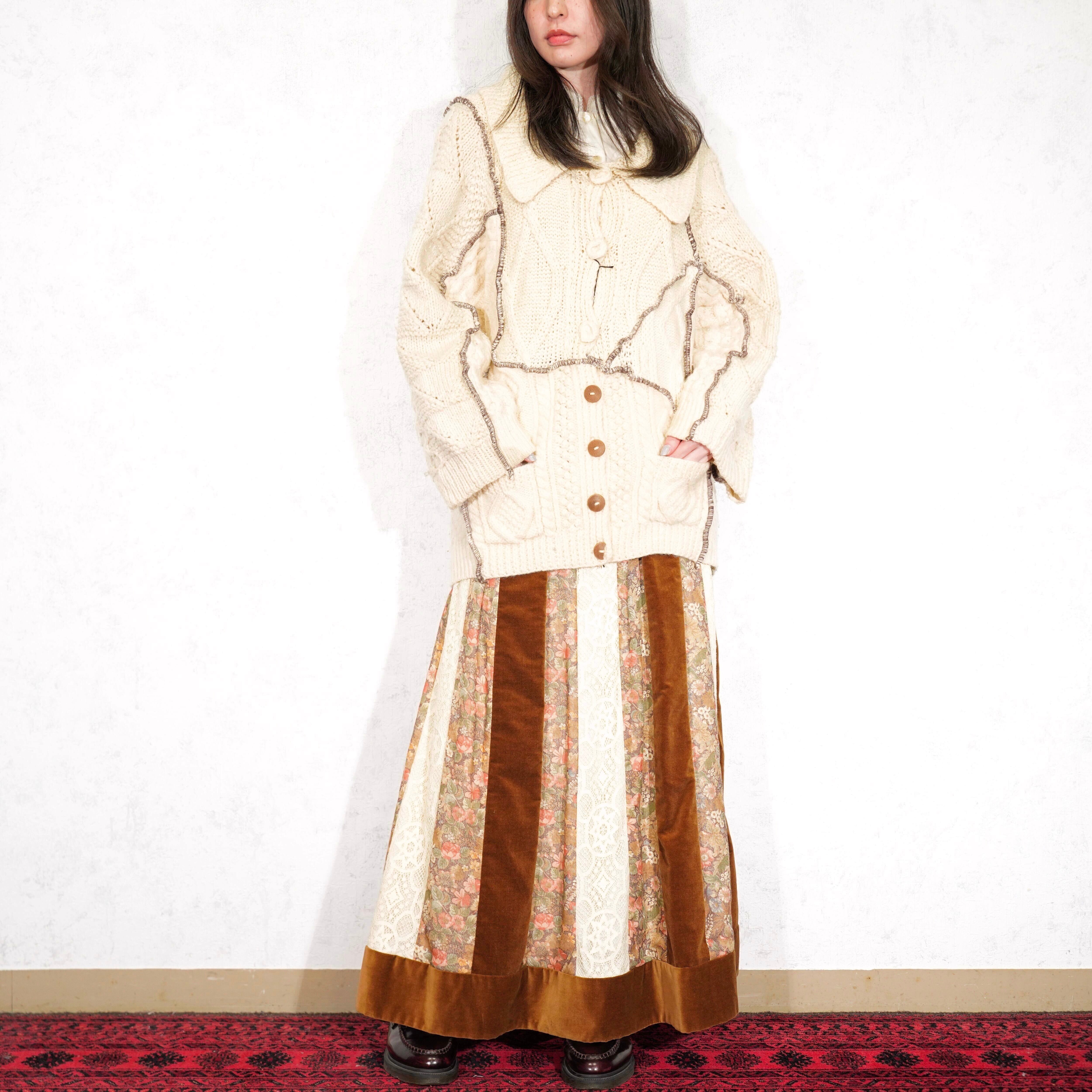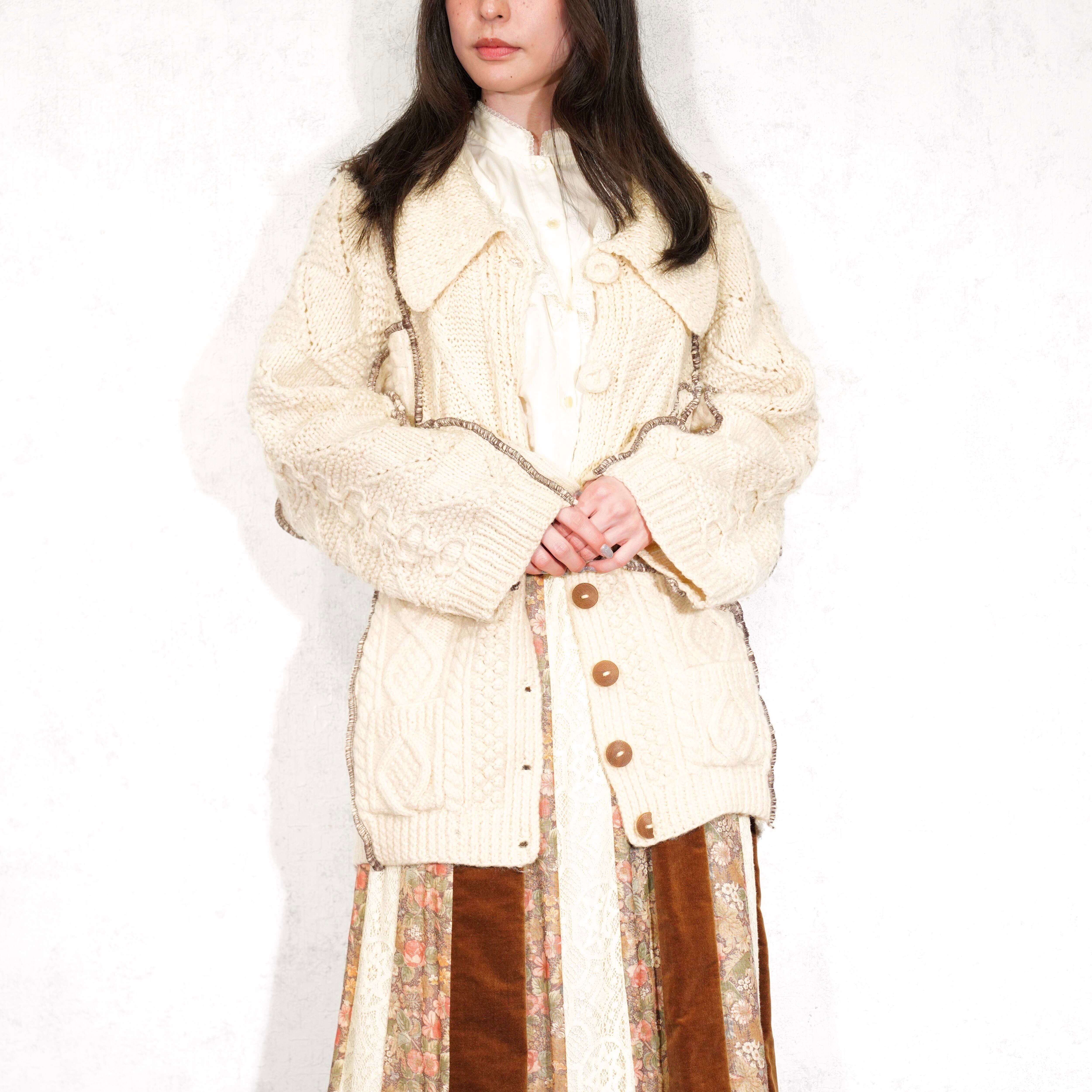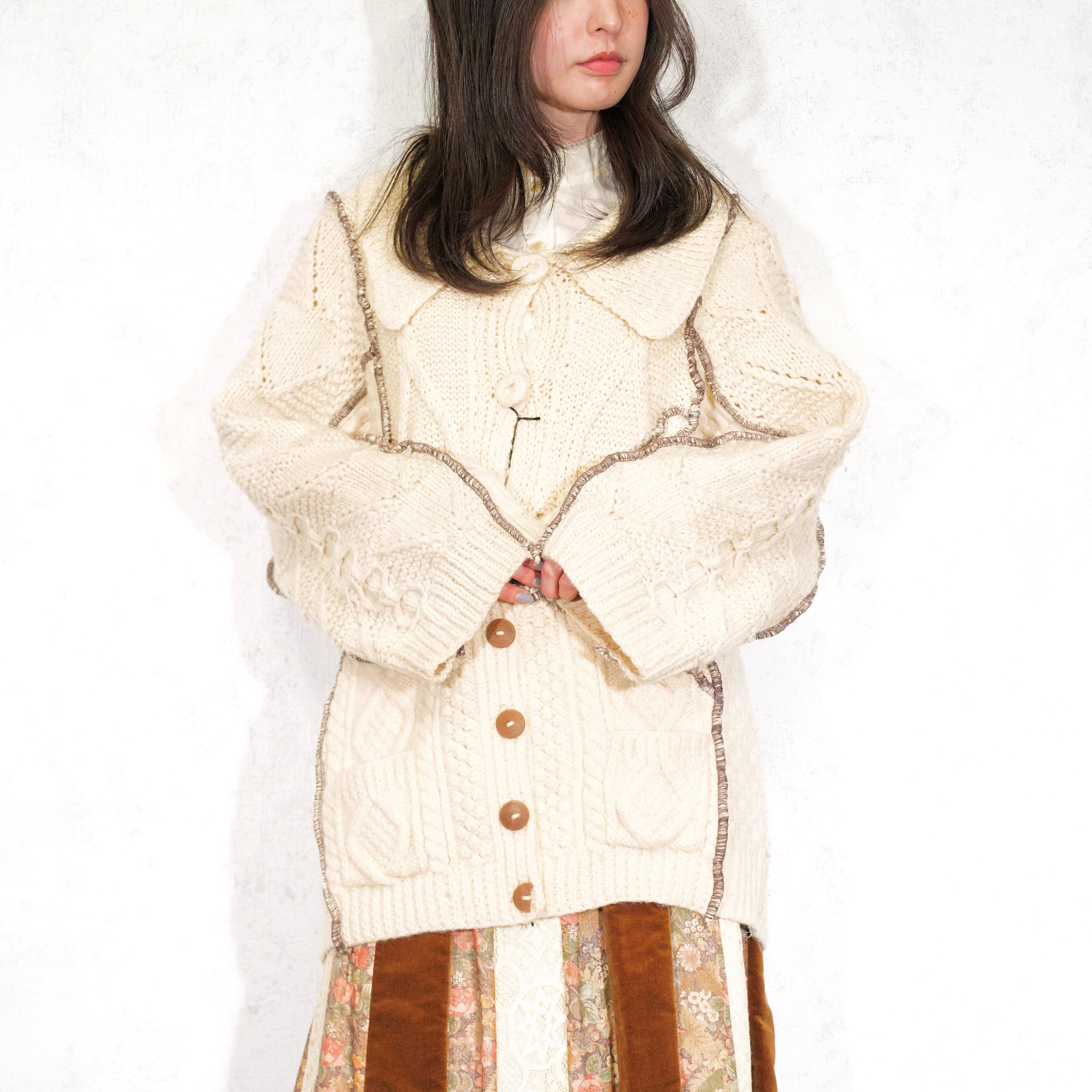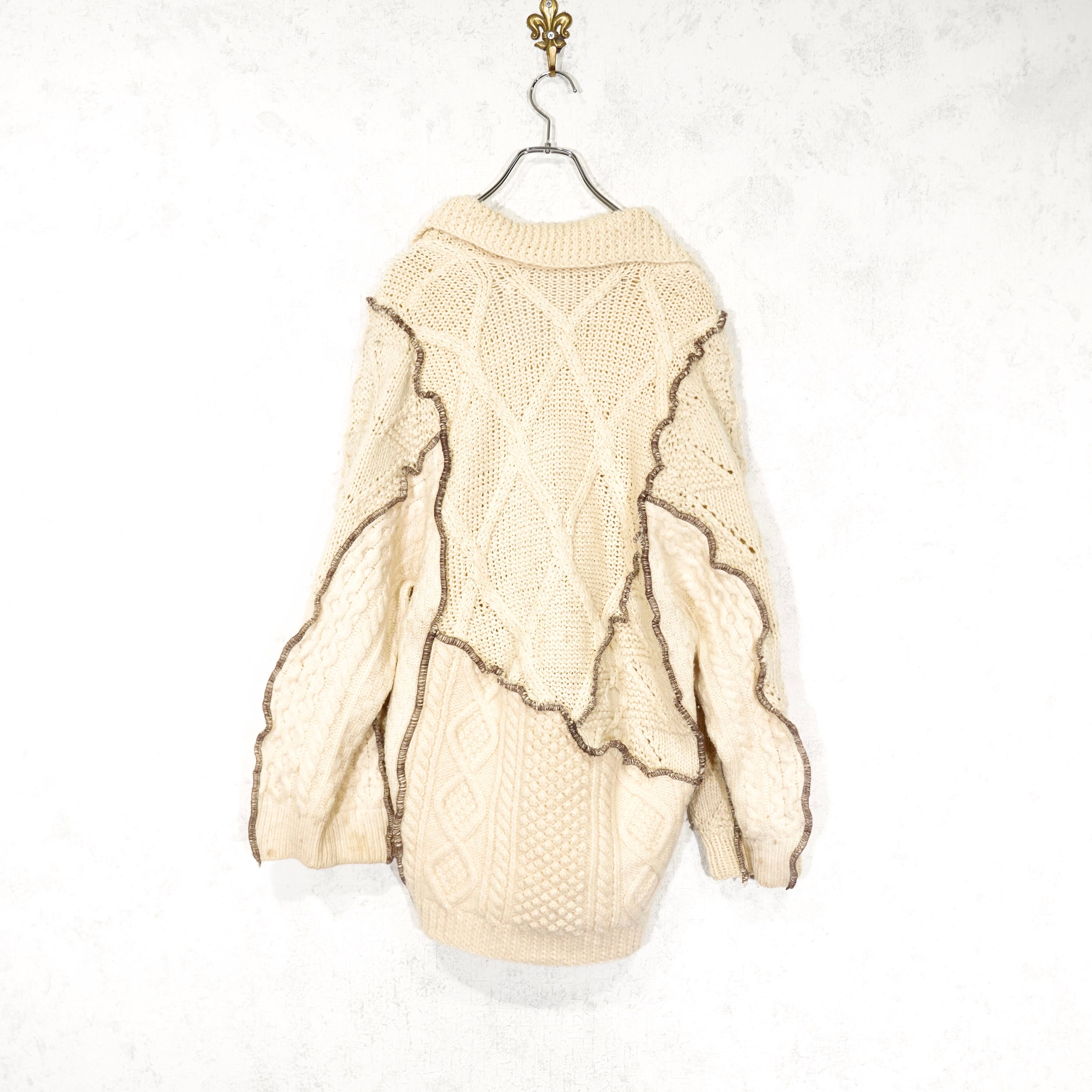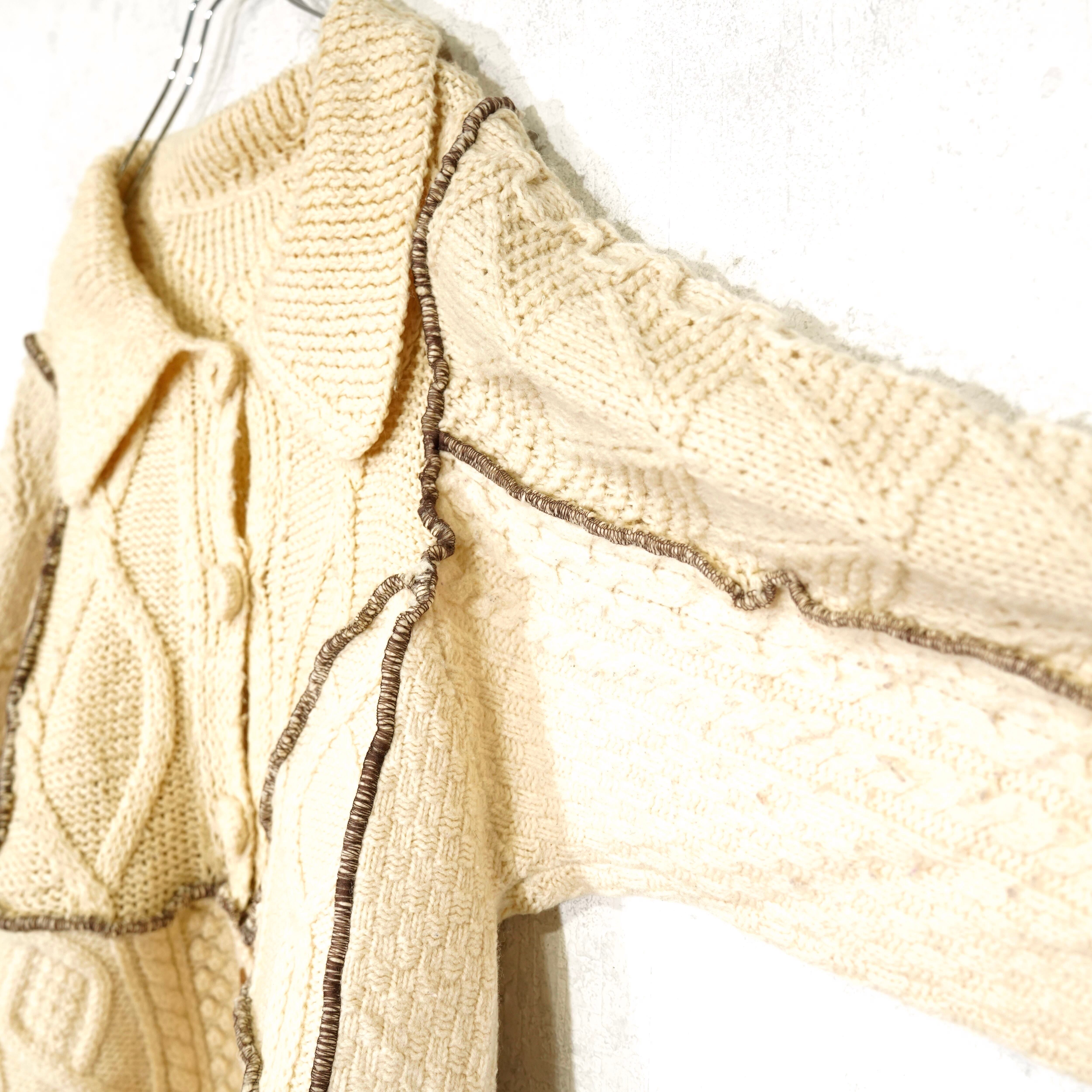 EU VINTAGE COLLAR DESIGN PATCHWORK REMAKE CABLE KNIT CARDIGAN/ヨーロッパ古着襟付きデザインパッチワークリメイクケーブルニットカーディガン(ニットジャケット)(フィッシャーマンセーター/アランニット)