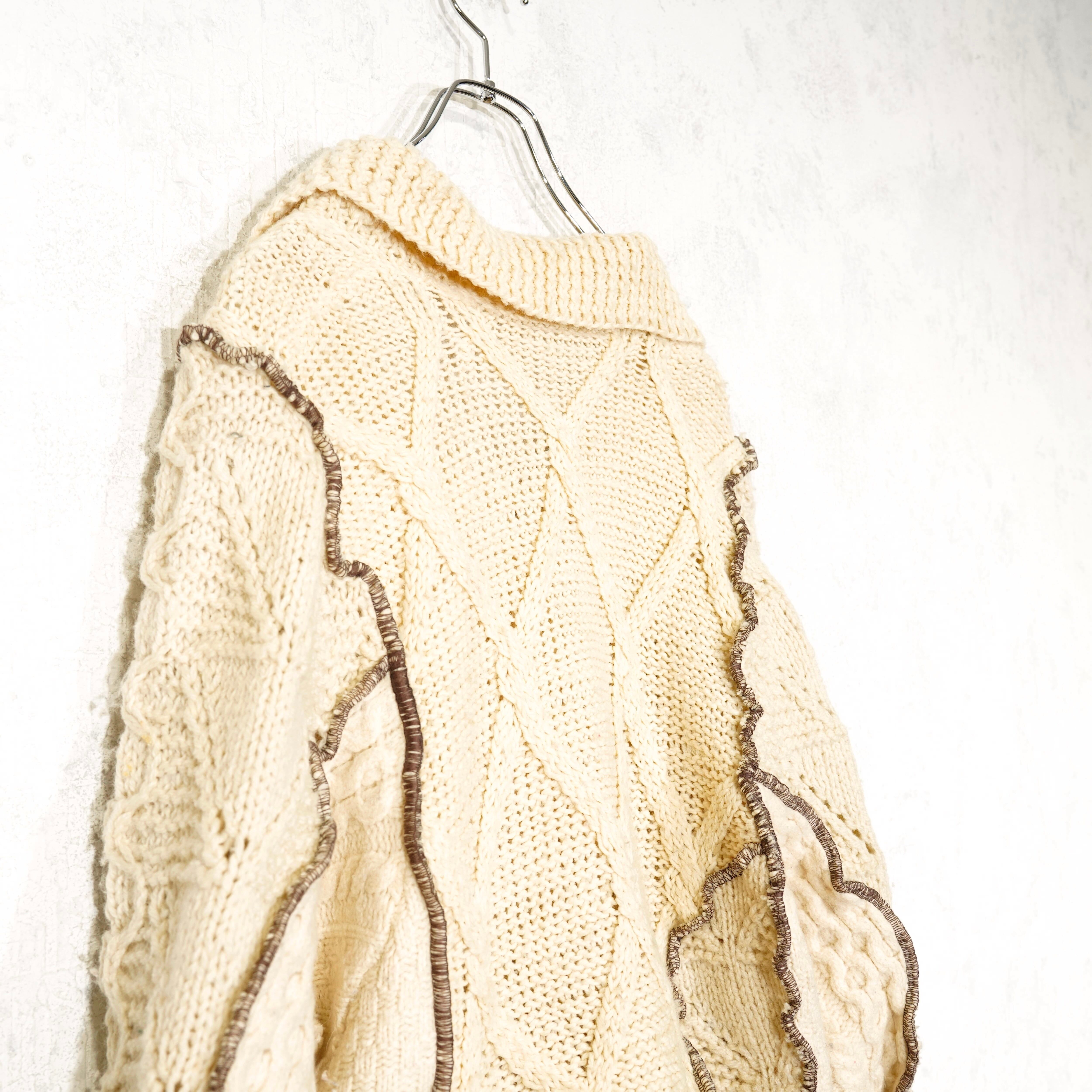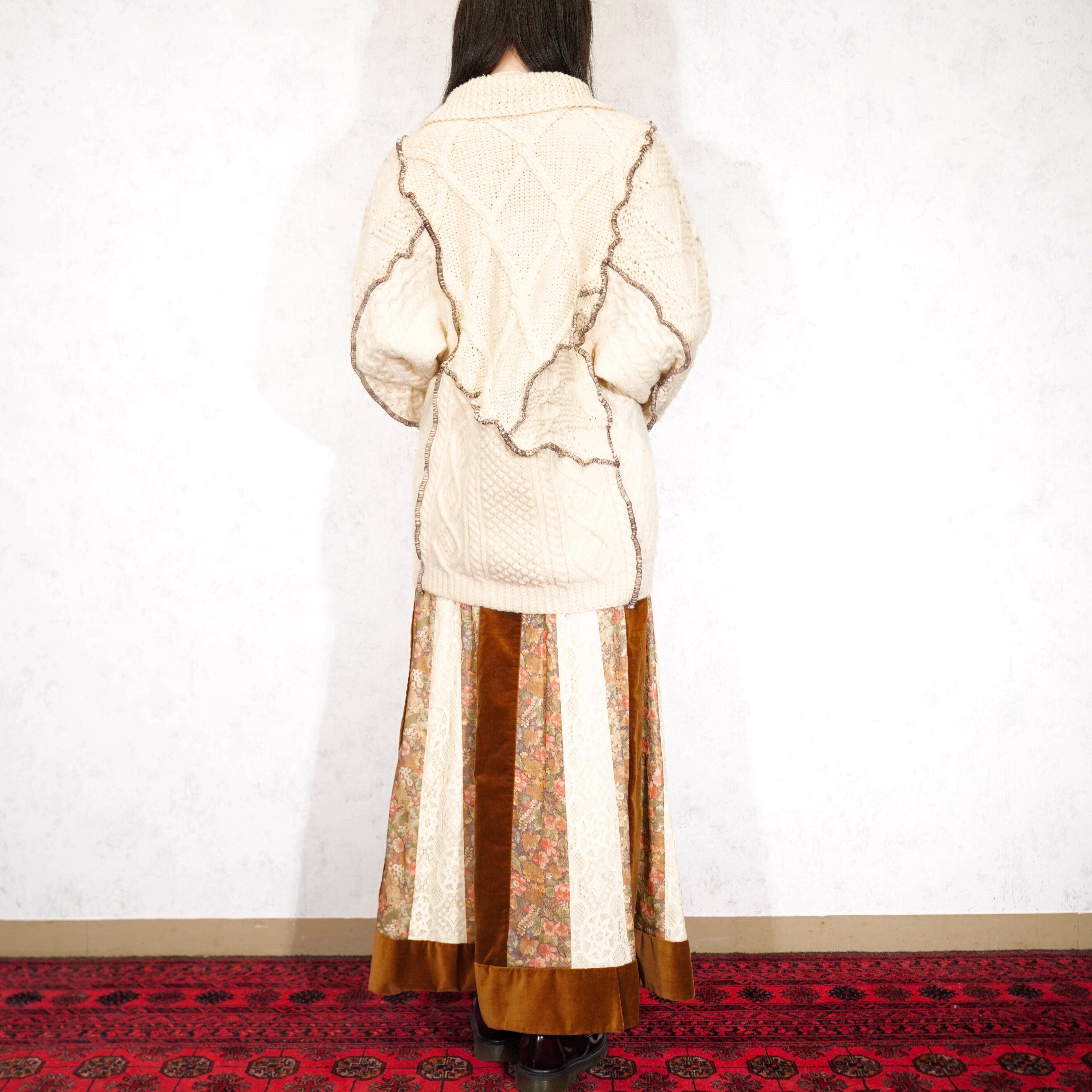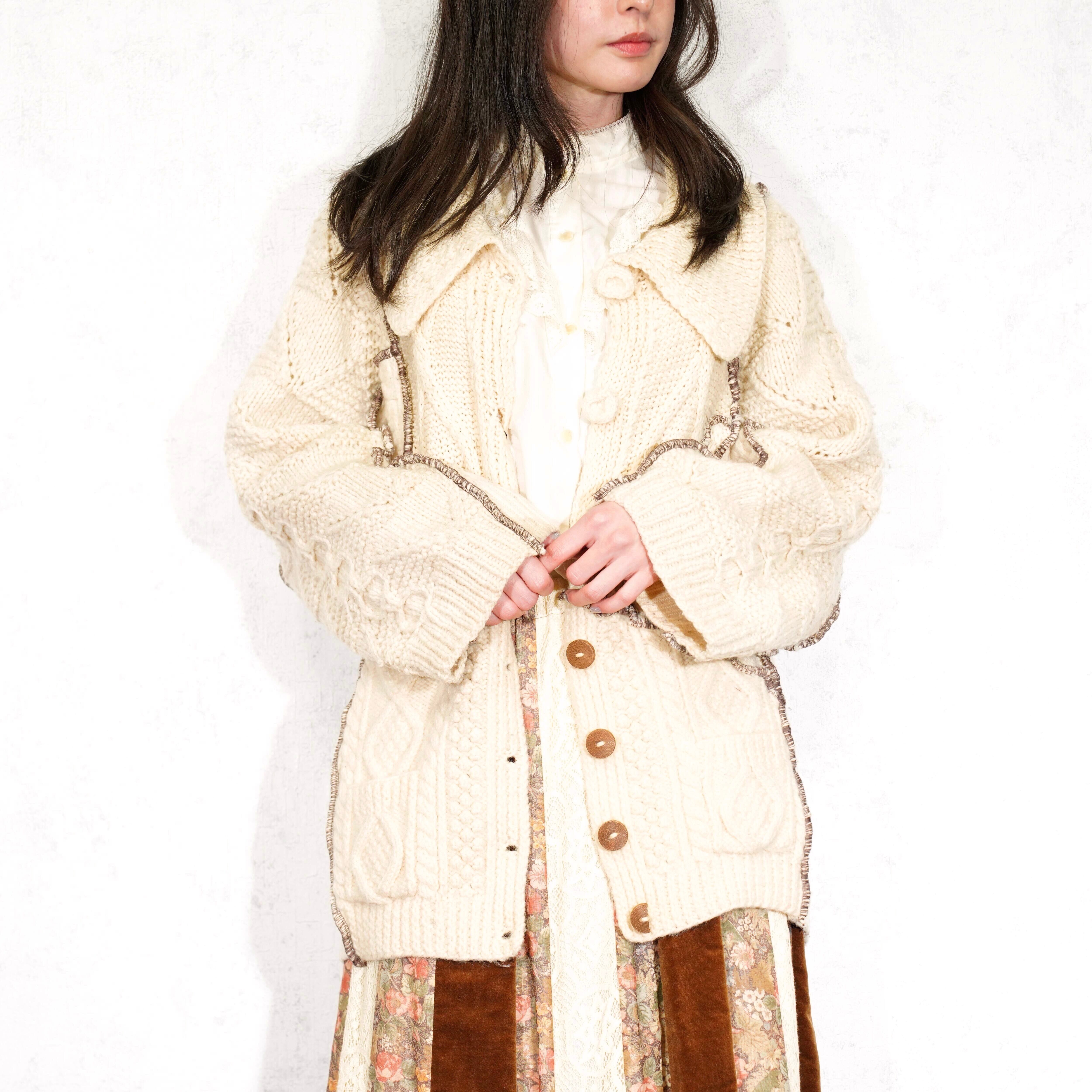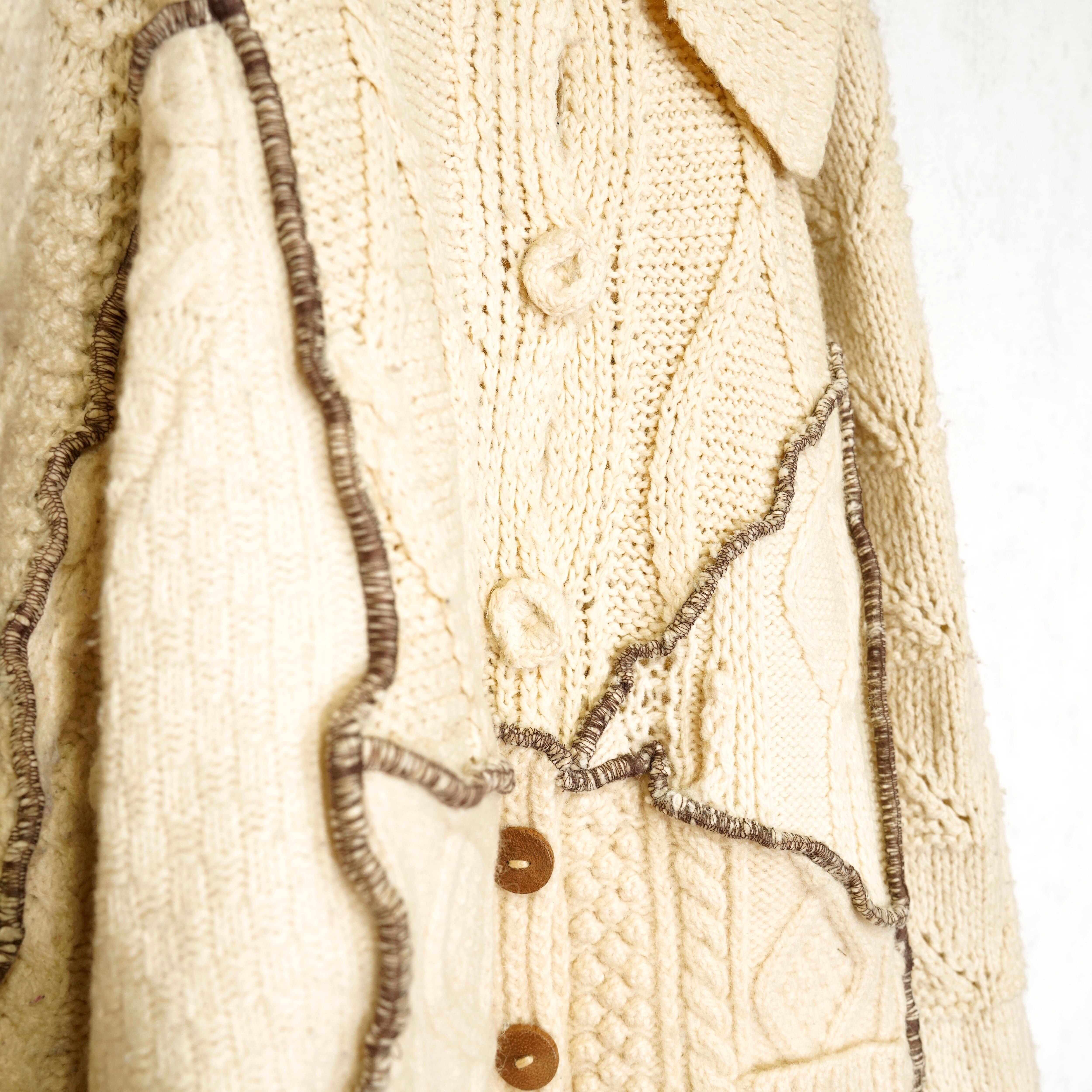 EU VINTAGE COLLAR DESIGN PATCHWORK REMAKE CABLE KNIT CARDIGAN/ヨーロッパ古着襟付きデザインパッチワークリメイクケーブルニットカーディガン(ニットジャケット)(フィッシャーマンセーター/アランニット)