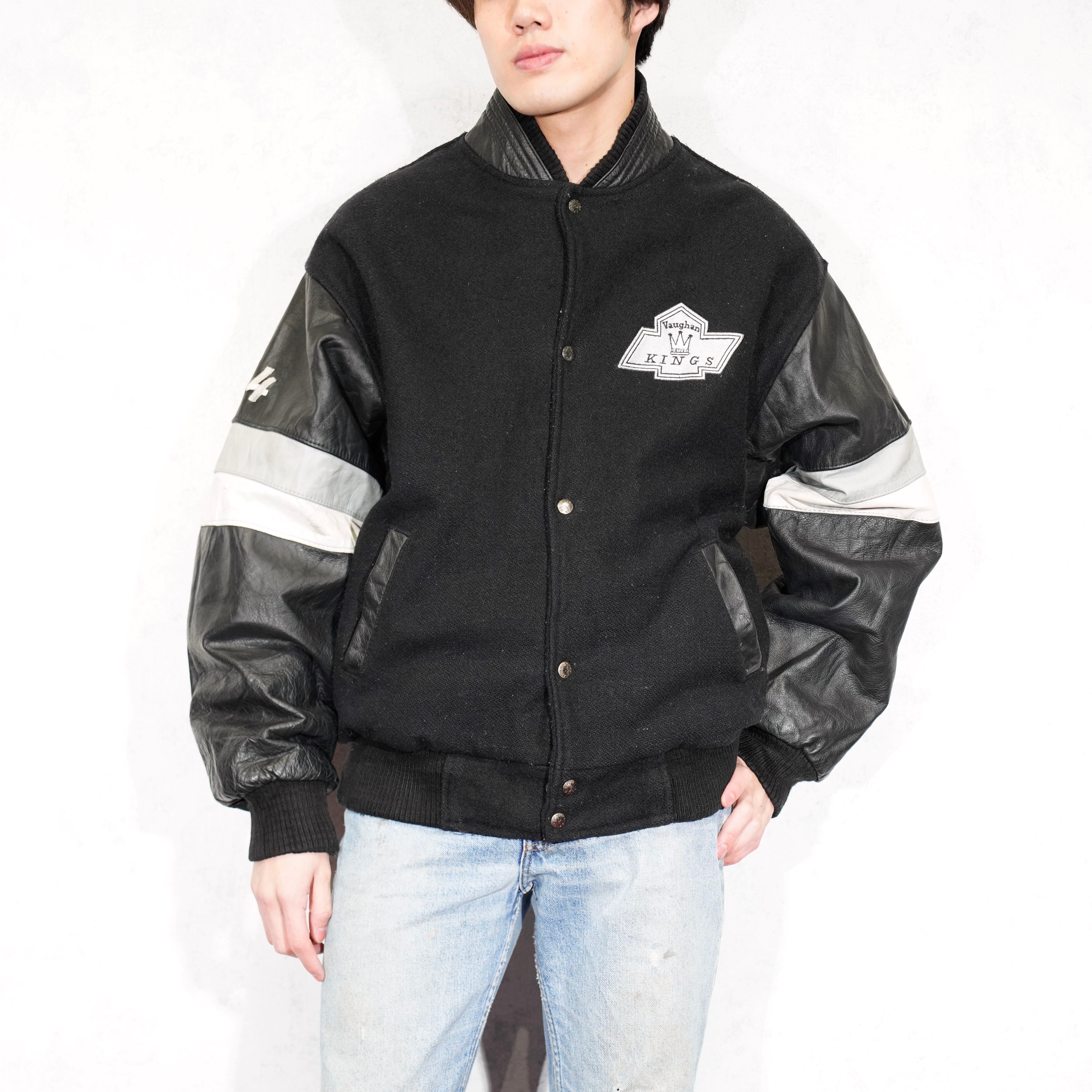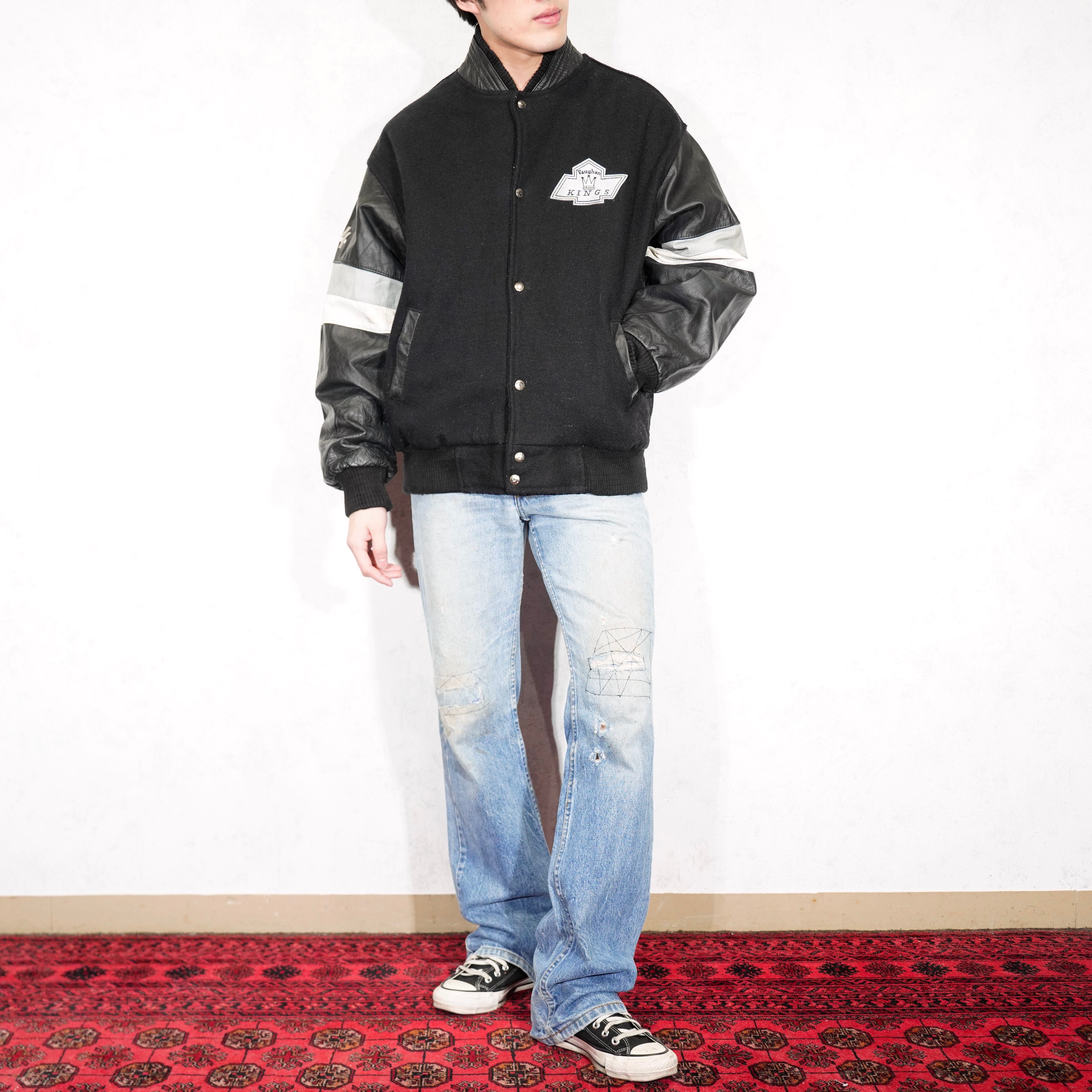USA VINTAGE LEATHER SPORT VAUGHAN KINGS LOGO EMBROIDERY DESIGN LEATHER WOOL STADIUM JUMPER/アメリカ古着スポーツチームロゴ刺繍デザインレザーウールスタジャン