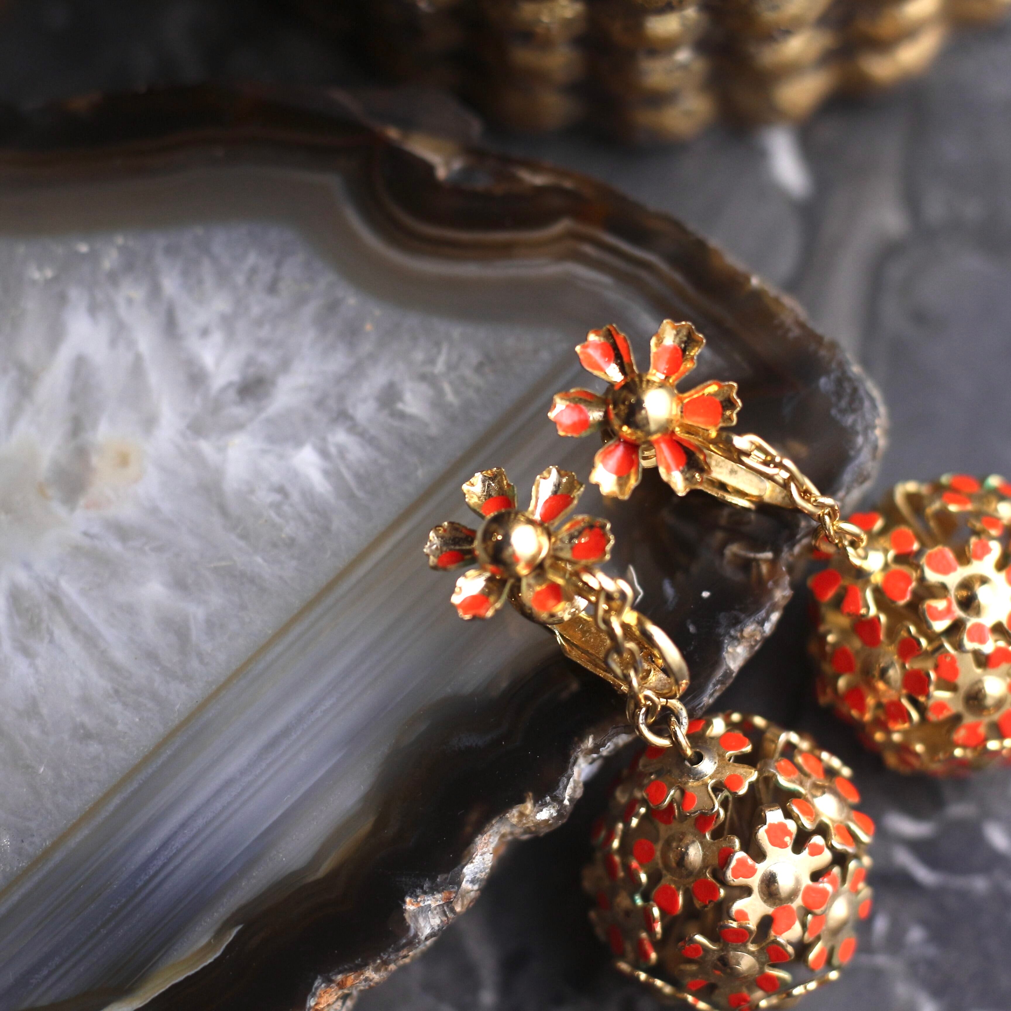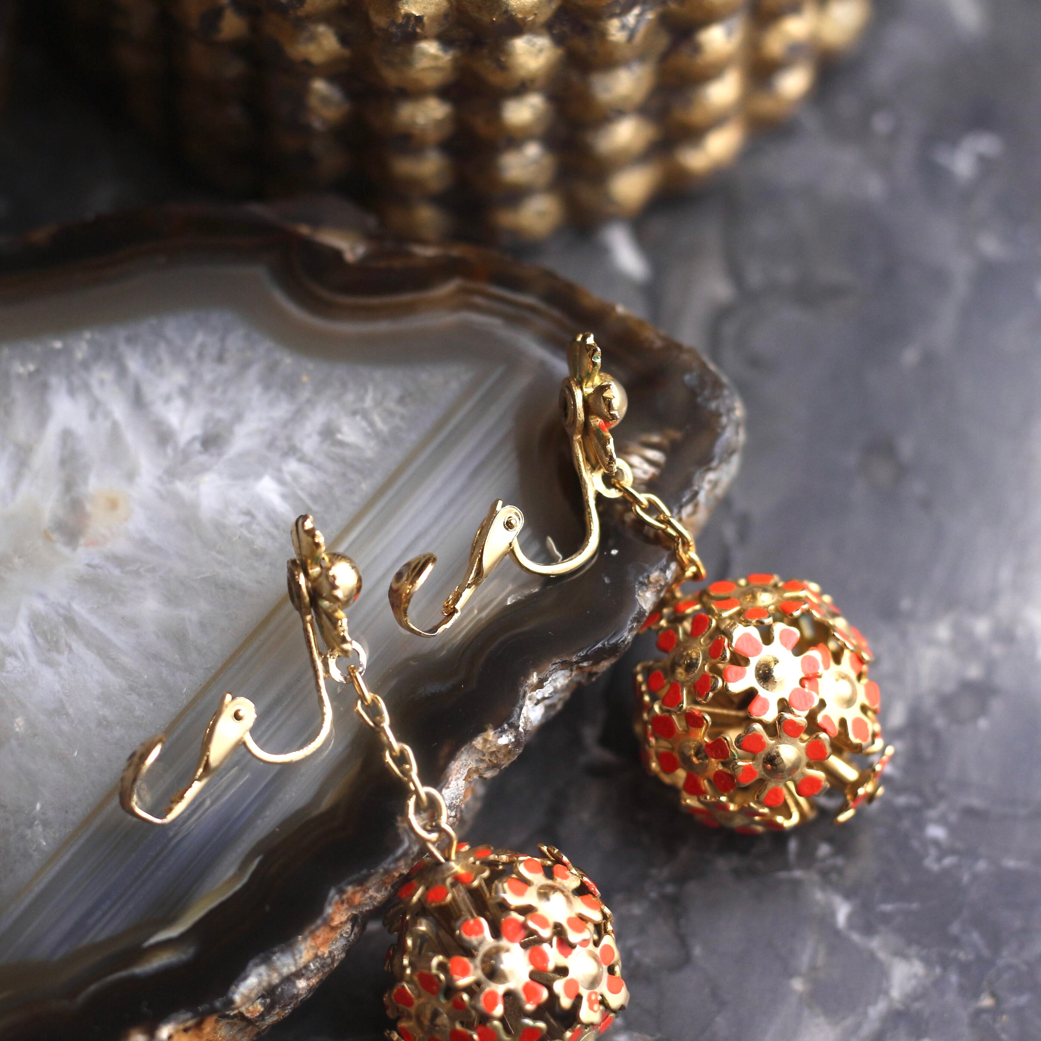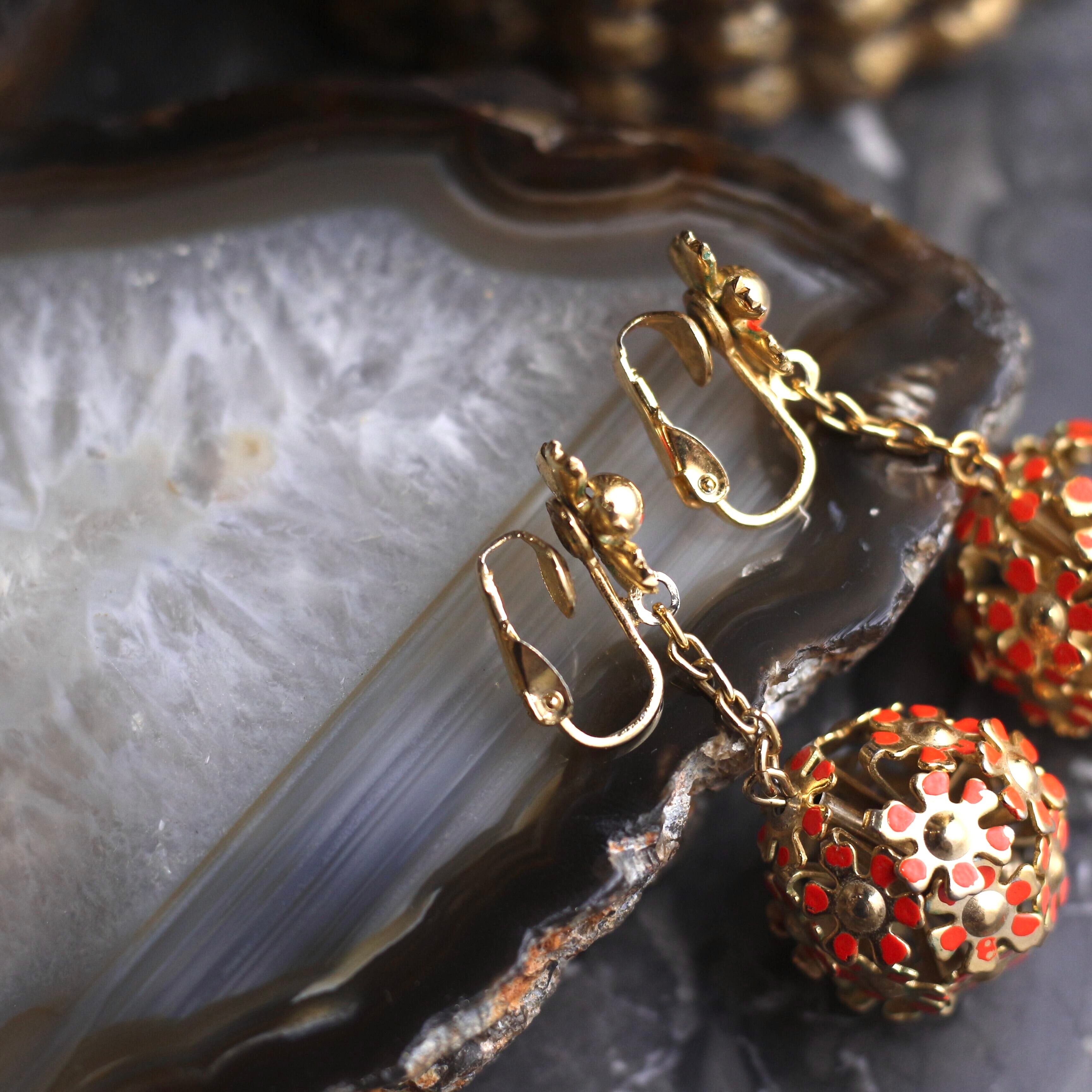 USA VINTAGE FLOWER METALBALL SWING DESIGN EAR CLIPS/アメリカ古着お花メタルボールぶら下がりデザインイヤリング